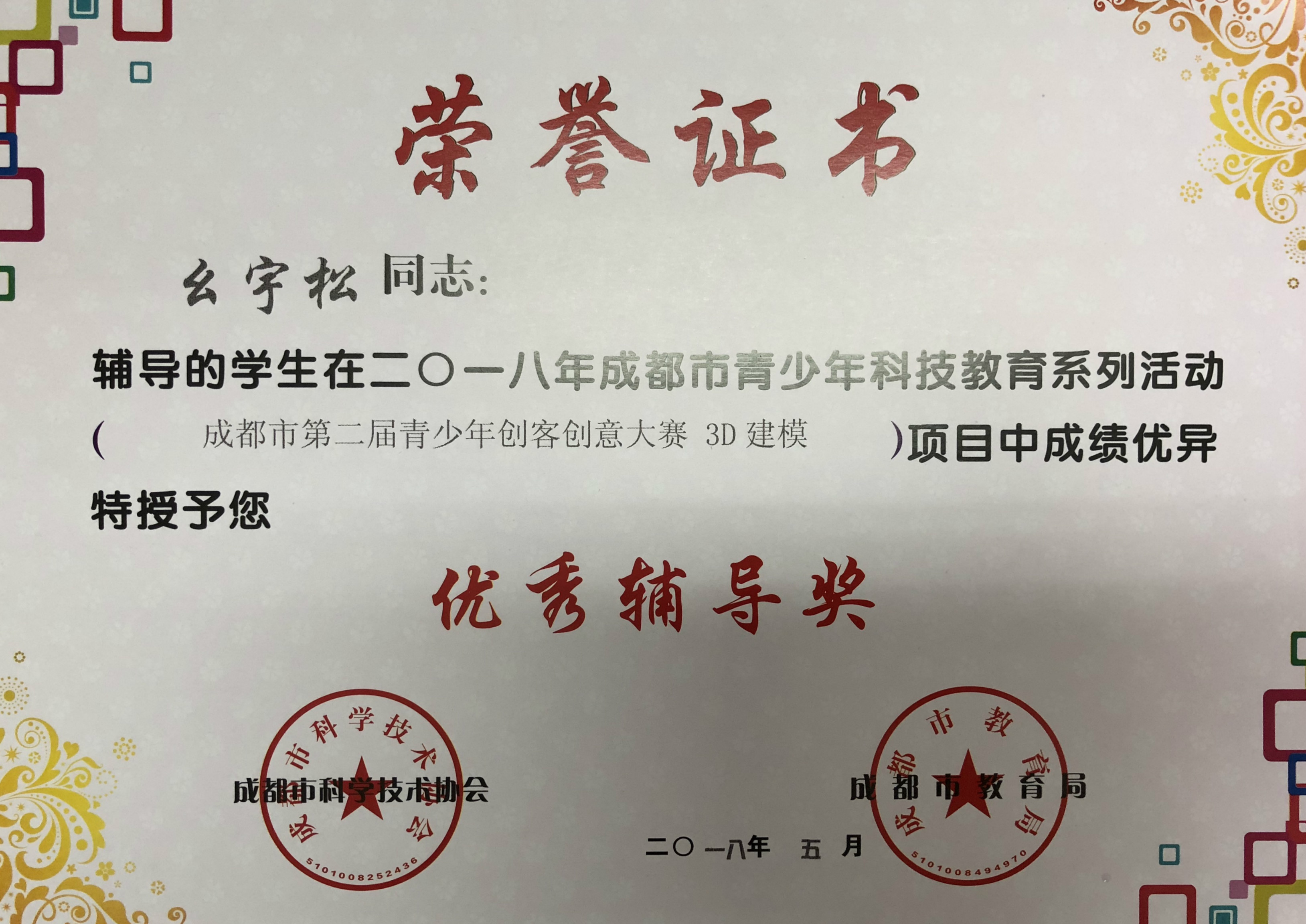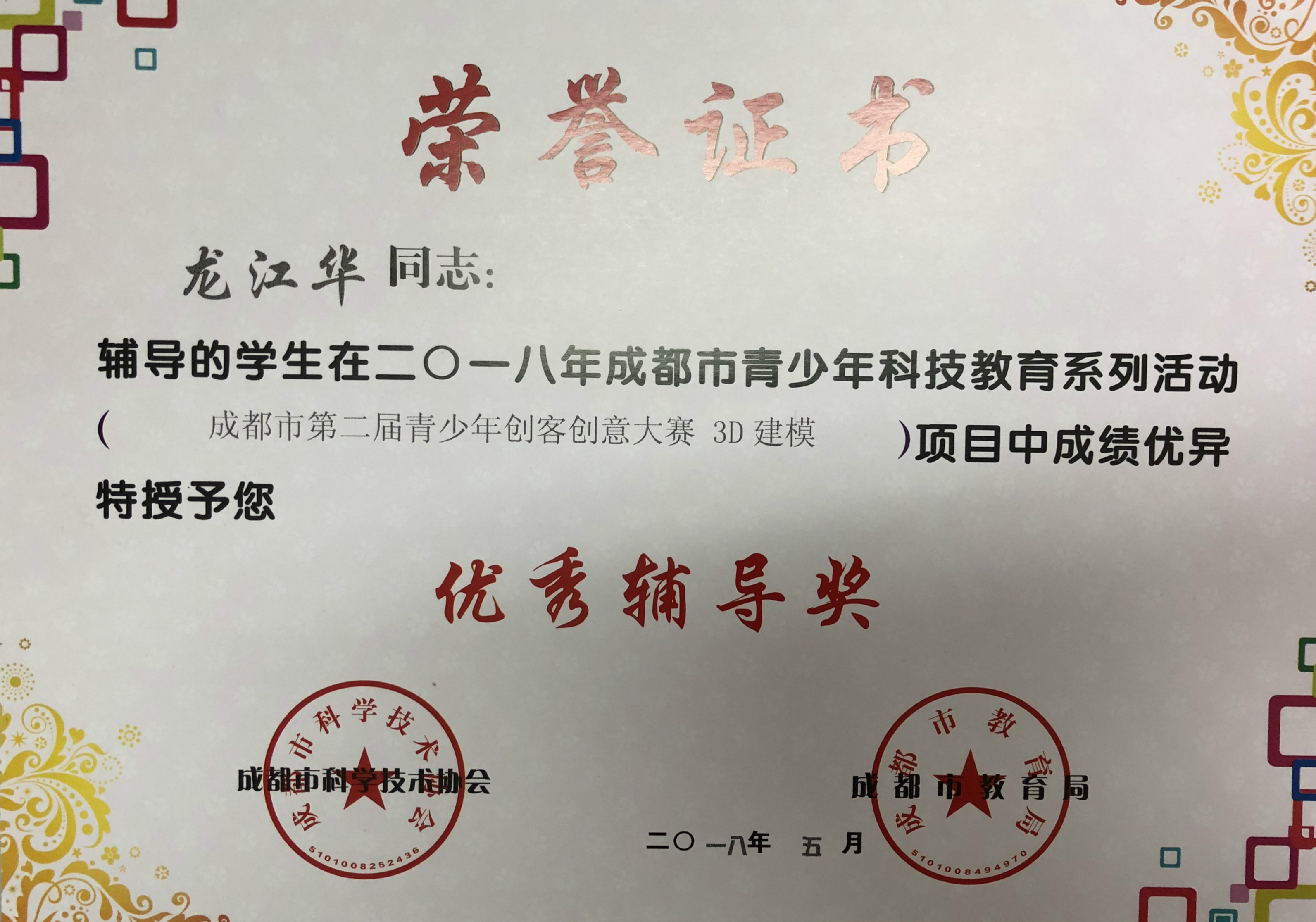 龍江華、幺宇松老師榮獲優(yōu)秀輔導教師稱號。