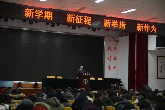 龍校長(zhǎng)首先高度贊揚(yáng)了老師們?cè)诖汗?jié)尚未結(jié)束之時(shí)便積極投身工作的高度責(zé)任感和使命感,緊接著圍繞著“求真務(wù)實(shí),奮力開創(chuàng)新輝煌”這一主題從高三工作、課程建設(shè)、招生宣傳、集團(tuán)發(fā)展、教師培訓(xùn)、德育安全等方面對(duì)新學(xué)期的工作做了全面的部署和安排。