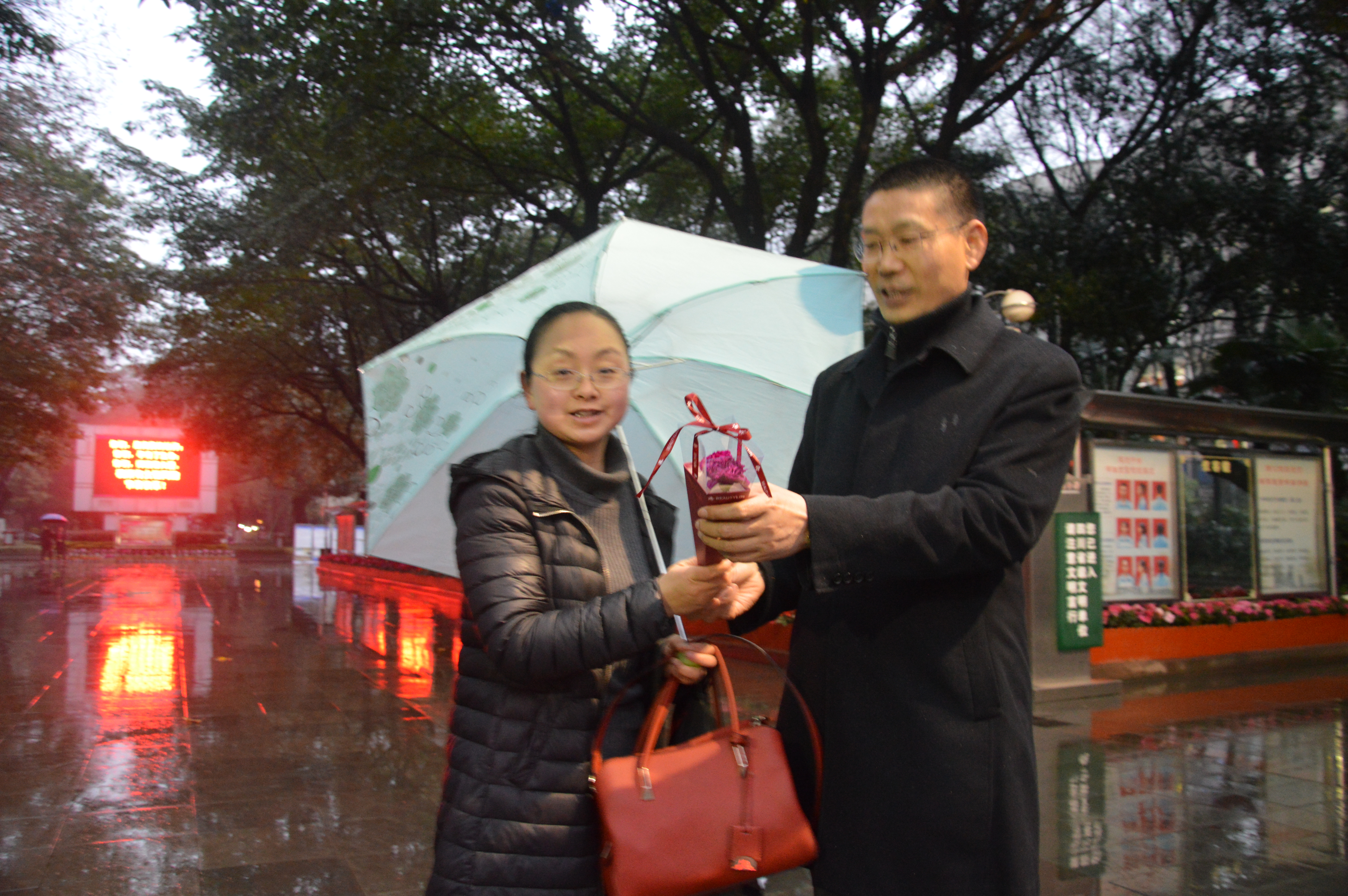 今天,是一個(gè)普通的工作日,但在普通中又有著不同尋常。六點(diǎn)多的雙中門口燈火普照,師生有序進(jìn)校。不同的是,在校門口放著一筐芬芳的鮮花,學(xué)校部分行政領(lǐng)導(dǎo)守候在旁,給每一位進(jìn)校的女教師送上一束康乃馨,借以表達(dá)節(jié)日的祝福。