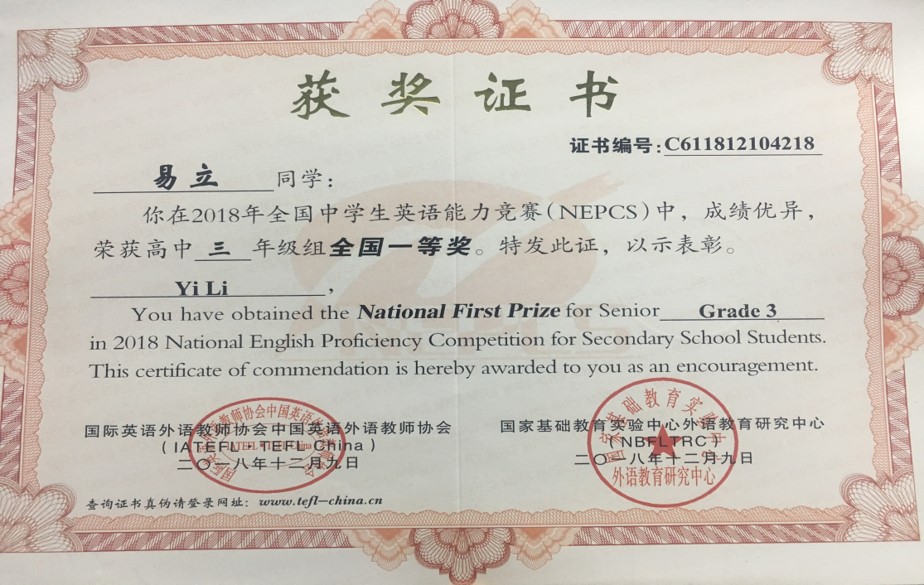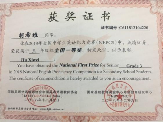 2018年全國中學(xué)生英語能力競賽一等獎獲得者。