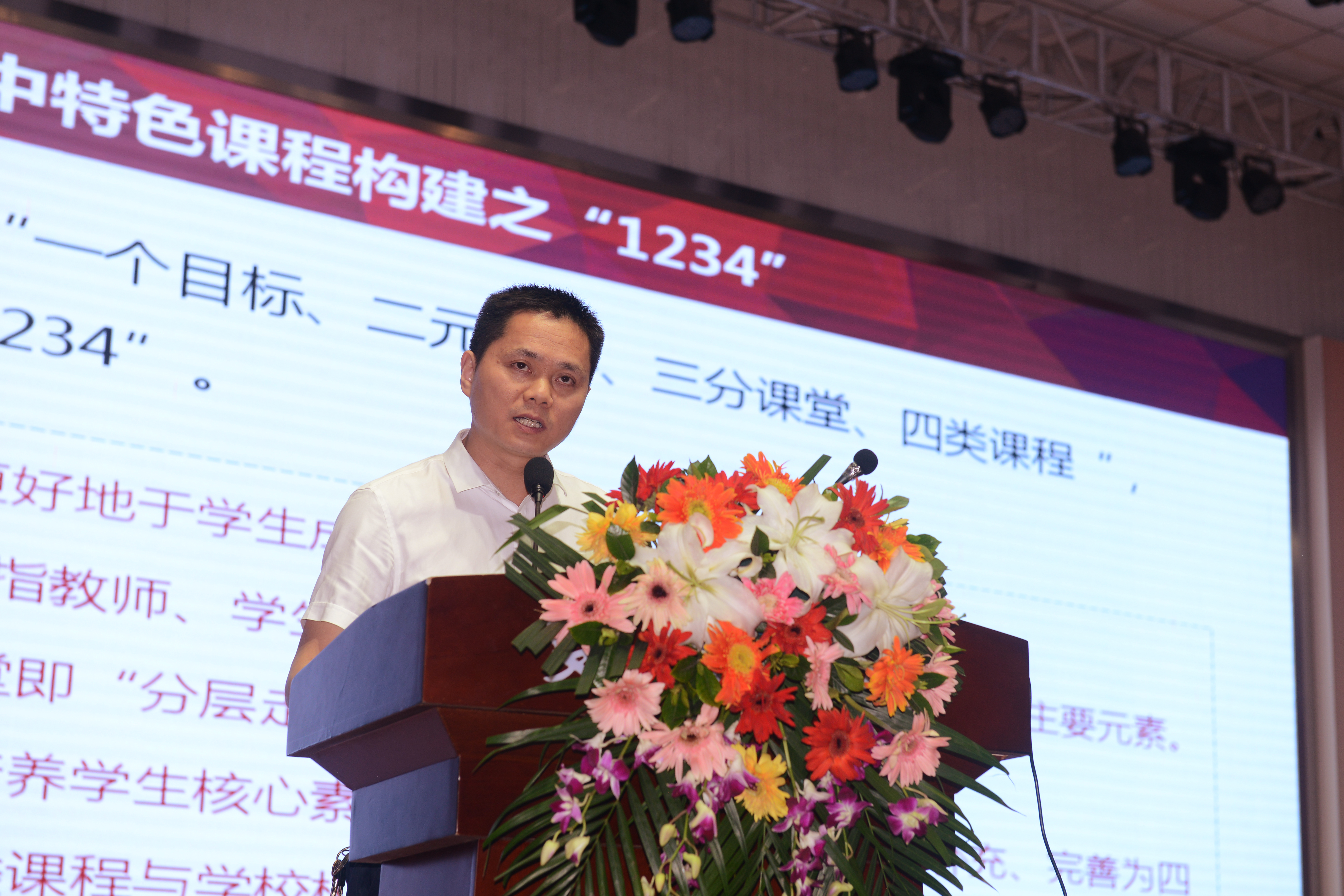 雙流中學(xué)副校長徐天福介紹雙中的特色課程成果。他從“三雅”文化引領(lǐng)下的課程理念展開,介紹了“一個目標(biāo)、二元導(dǎo)學(xué)、三分課堂、四類課程“的特色課程構(gòu)件以及構(gòu)建特色課程的目標(biāo)。