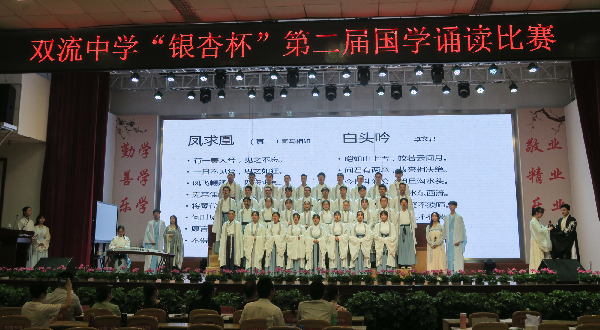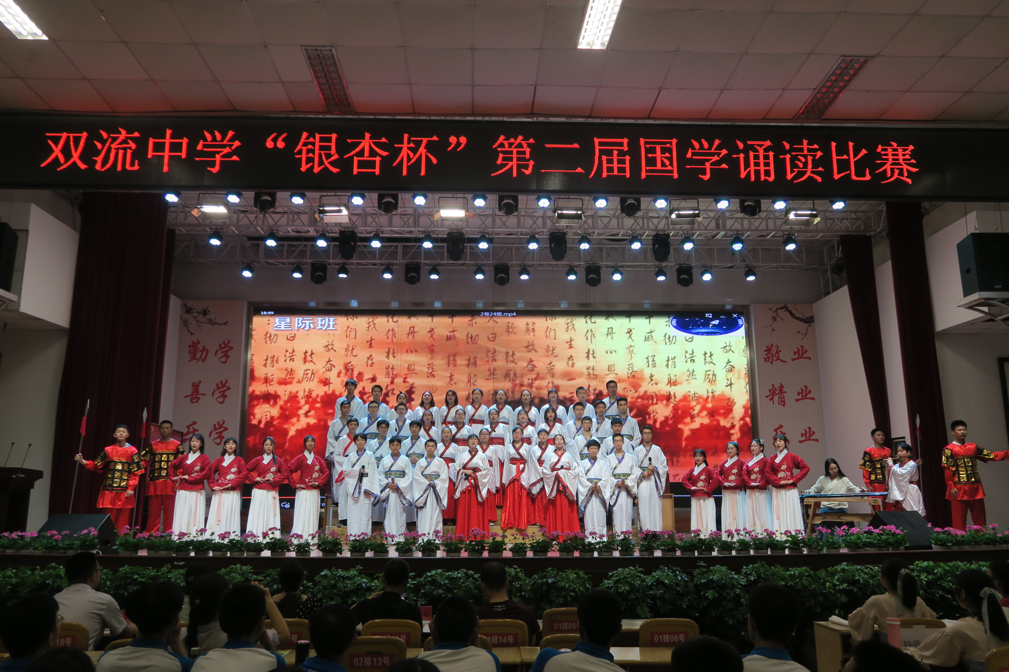 為進(jìn)一步豐富校園文化生活,激發(fā)學(xué)生的讀書(shū)和誦讀熱情,營(yíng)造濃厚的書(shū)香校園氛圍,傳承國(guó)學(xué)文化經(jīng)典,弘揚(yáng)民族文化精髓,2019年4月26日,雙流中學(xué)第二屆“銀杏杯”國(guó)學(xué)經(jīng)典誦讀比賽在多功能一廳順利舉行。
