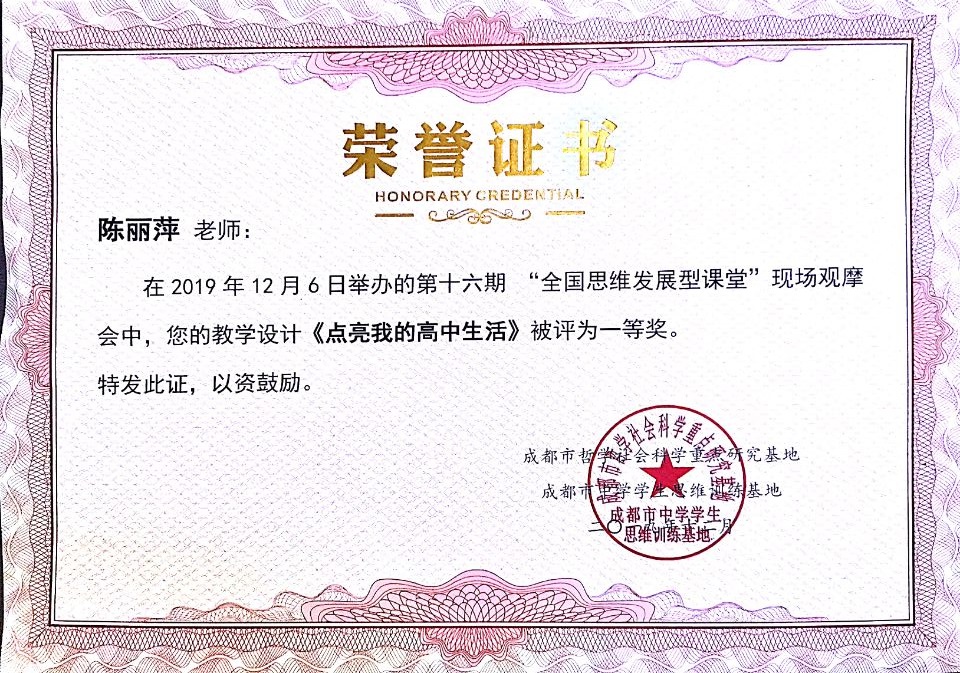 雙流中學(xué)陳麗萍、熊治海老師提交的教學(xué)設(shè)計《點亮我的高中生活》《在字里行字品味作者的情感傾向和對人物的評價》均獲得一等獎。