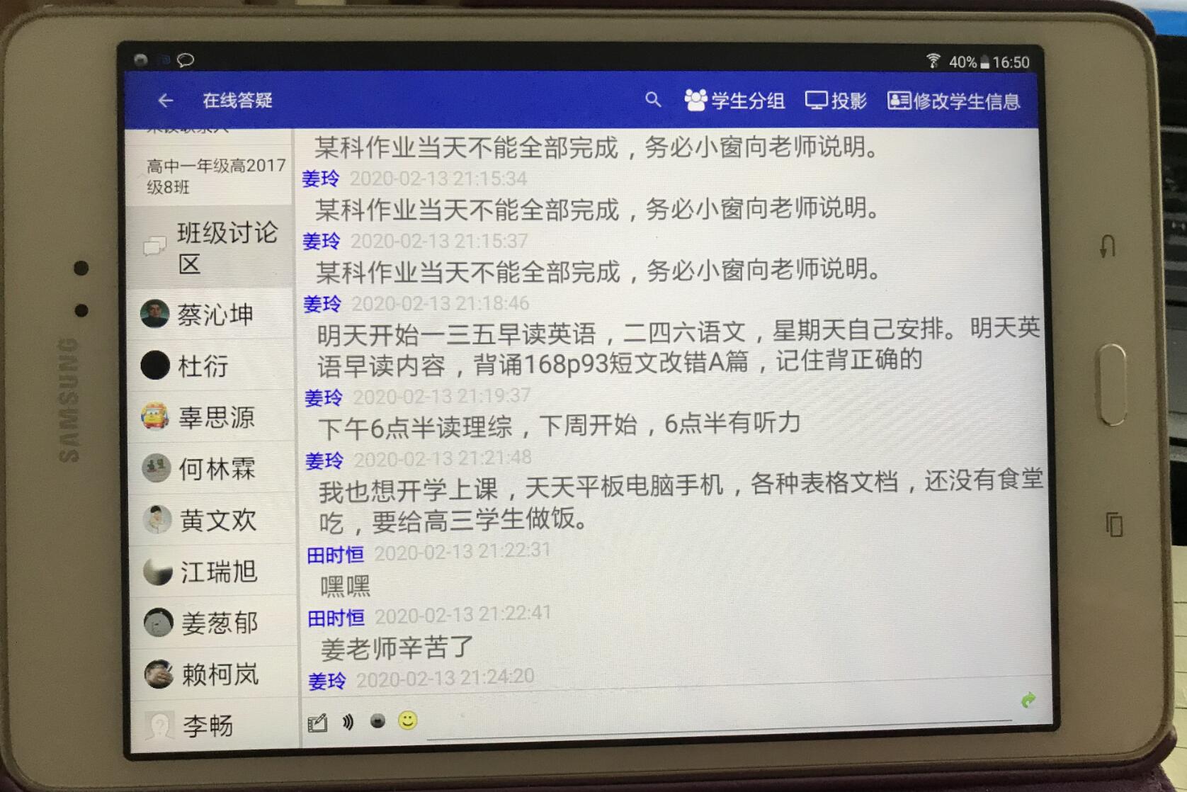 高三(13)班的班主任杜江老師作了《平板聯(lián)系家校,疫情隔不斷師生情——指導(dǎo)學(xué)生在家復(fù)習(xí)工作點(diǎn)滴》的分享。杜老師非常關(guān)注這個(gè)特殊時(shí)期的學(xué)生心理情況,建議老師們不要在平板對(duì)話要張弛有度,給學(xué)生營造一個(gè)寬松的環(huán)境,鼓勵(lì)學(xué)生積極發(fā)言。杜老師也給大家分享了如何有效利用平板功能進(jìn)行在線答疑。