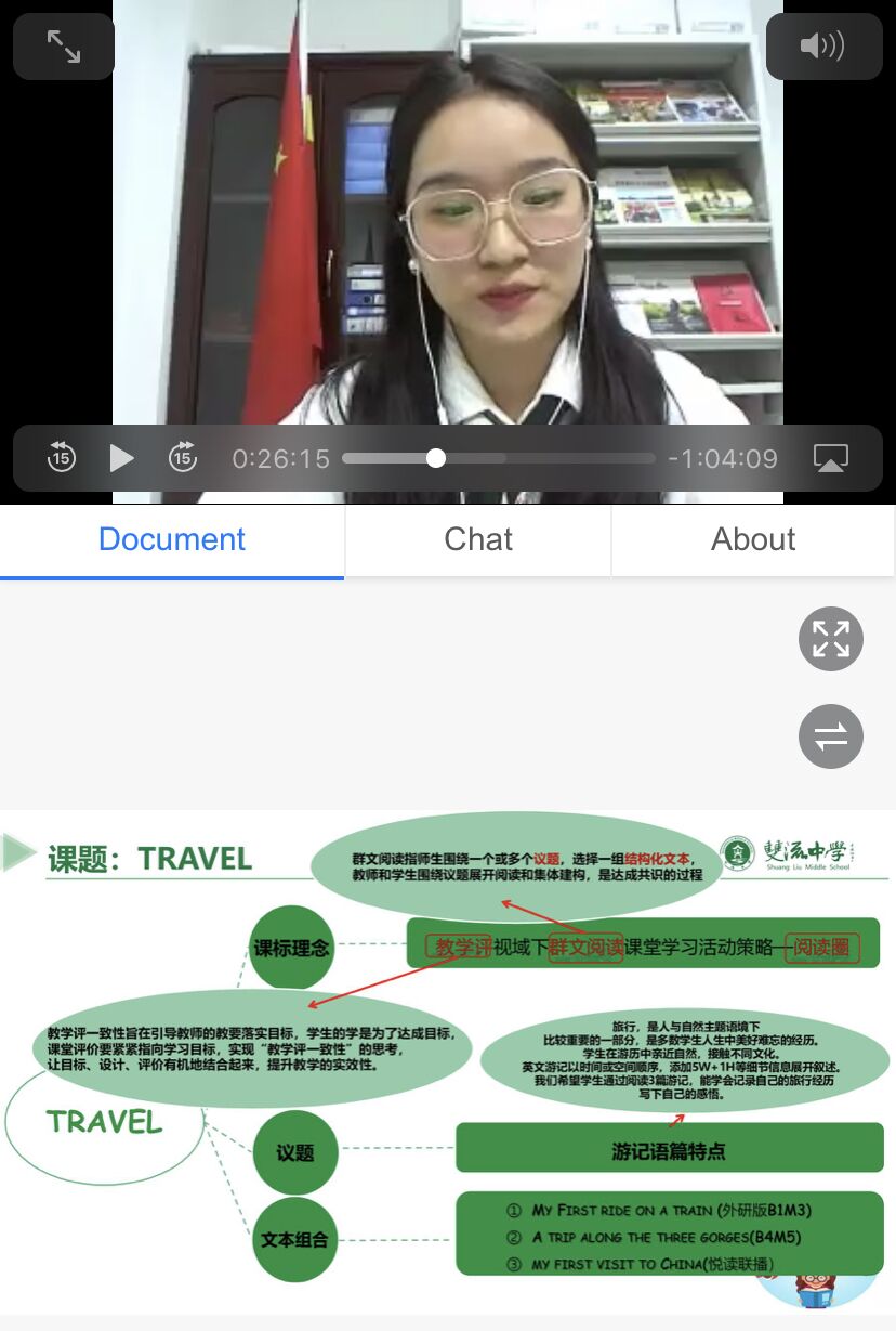 本次培訓(xùn)內(nèi)容分為三部分:1.由雙流區(qū)英語學(xué)科帶頭人劉利勤老師帶來的講座:“高中英語群文閱讀的議題設(shè)計路徑”;2.由雙流中學(xué)英語教師李穎帶來的說課:TRAVEL說課教學(xué)設(shè)計; 3.由雙流中學(xué)英語教師彭靜帶來的說課:音樂人物介紹語篇特點。