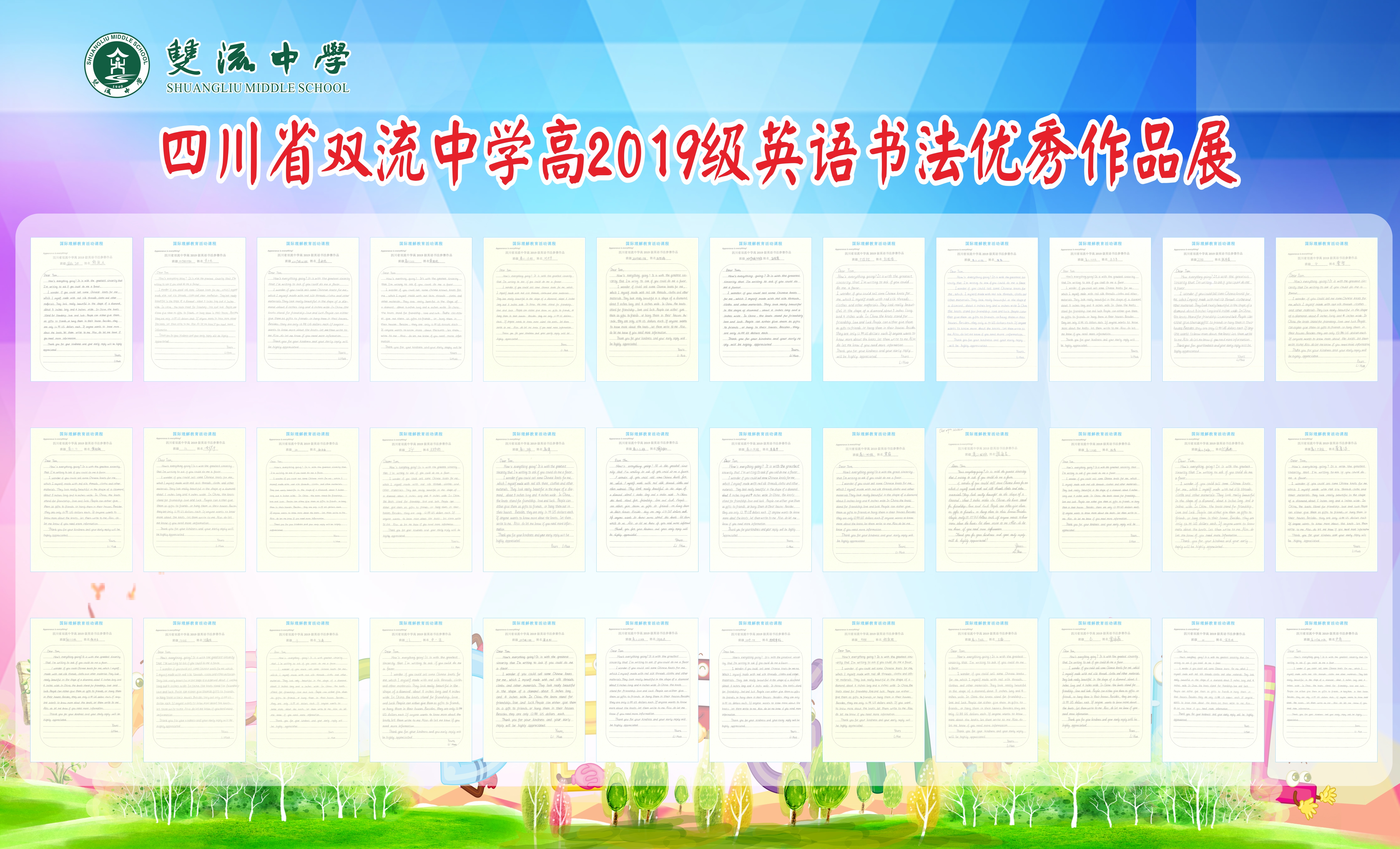 為了更好地開展英語學(xué)科活動,進(jìn)一步激發(fā)學(xué)生學(xué)習(xí)英語的興趣,培養(yǎng)良好的英語學(xué)習(xí)習(xí)慣,規(guī)范同學(xué)們的英語書寫,豐富同學(xué)們的校園文化生活,雙流中學(xué)高2019級英語備課組于近日組織英語書法大賽,為同學(xué)們提供了一個展示自我的舞臺,并通過此次活動互相交流,取長補(bǔ)短。