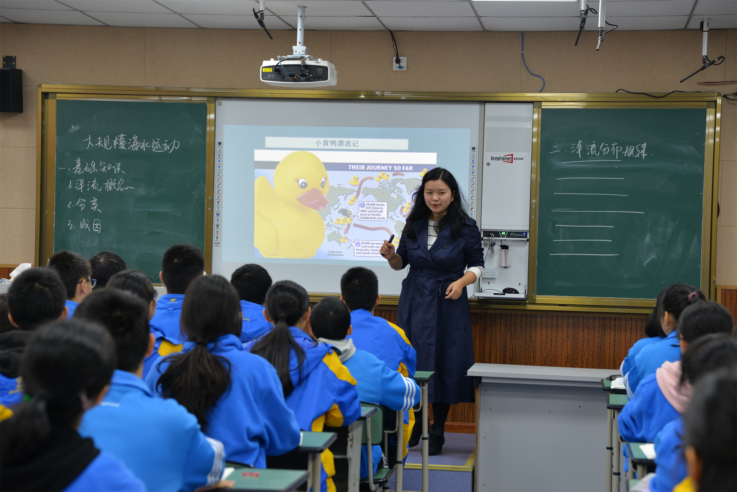 緊接著第二位是來自雙流中學的雷濤老師,她的授課內(nèi)容是“大規(guī)模的海水運動”,先講解洋流的基礎知識,再從富有新意的地理實驗視頻引入讓學生探究洋流的分布規(guī)律,并結(jié)合實際案例讓學生繪制合理海運路線以此探究洋流對海運的影響。