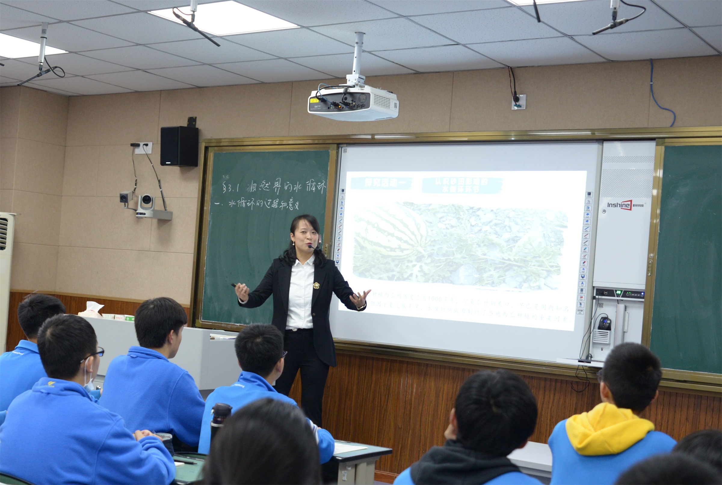 最后一位出場的是來自雙流中學的郝碧婭老師,她的授課內(nèi)容是“水循環(huán)的過程及意義”,郝老師以詩歌引入,帶領學生學習水循環(huán)示意圖,讓學生判斷水循環(huán)的類型和標注水循環(huán)環(huán)節(jié);并利用生活的案例甘肅砂田瓜和城市內(nèi)澇,分析了影響水循環(huán)的因素。