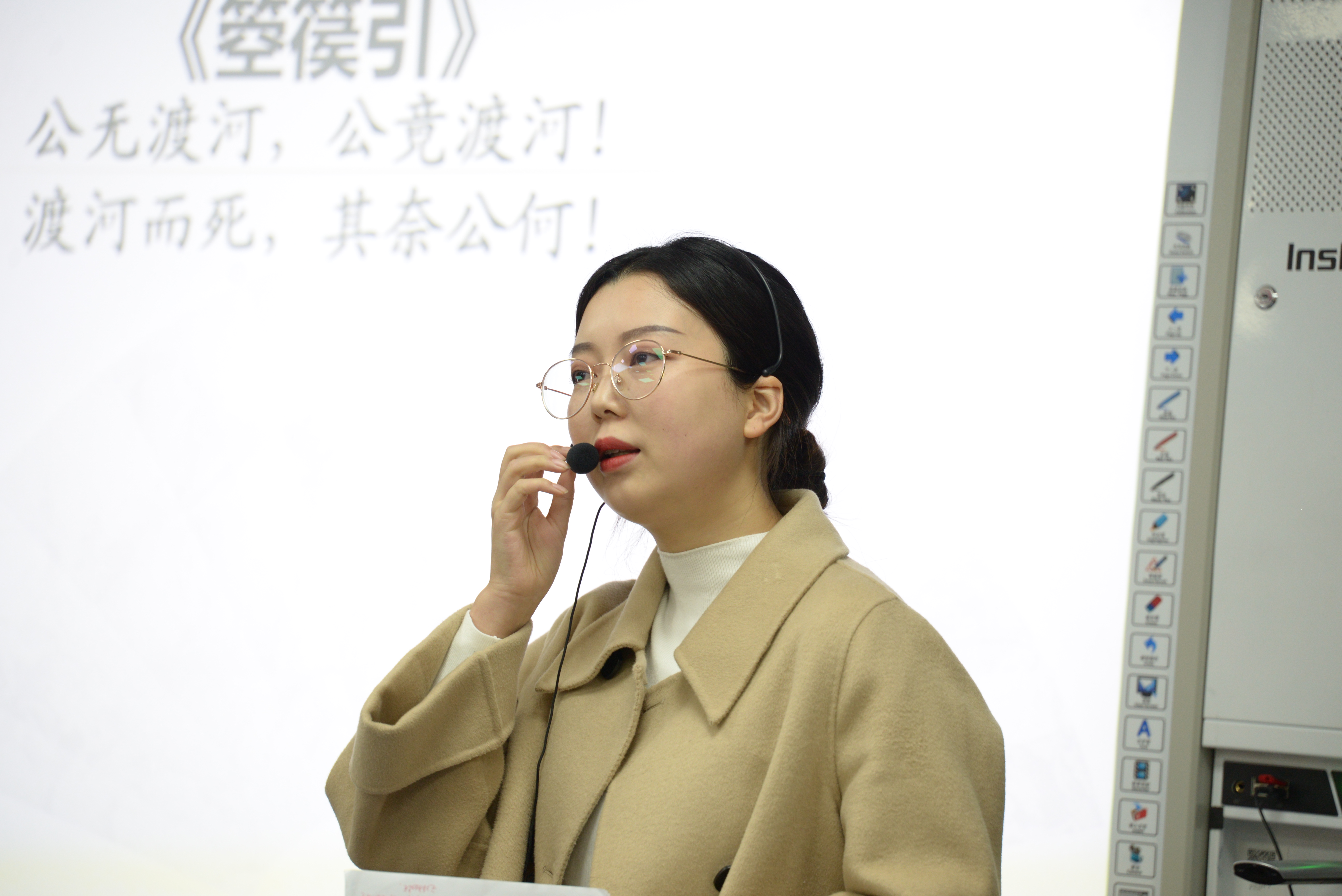 馬駟駒老師猶駿馬奮蹄,率先登場(chǎng)。從容鎮(zhèn)定,帶領(lǐng)高一5班學(xué)生追本溯源,探尋中國(guó)漢字的演進(jìn)和魅力。箜篌聲起,美麗大方的楊睿老師奉上了《記梁任公先生的一次演講》。啟思激智,旁征博引,高一17班學(xué)生群情振奮,感深情,悟大義。載譽(yù)歸來(lái)的母欄芳老師最后登場(chǎng),一曲聲情并茂的配樂(lè)朗誦《致橡樹(shù)》,瞬時(shí)點(diǎn)亮高一19班學(xué)生的詩(shī)情,娓娓動(dòng)人的講授里,獨(dú)立與平等的價(jià)值觀已然深植心靈。