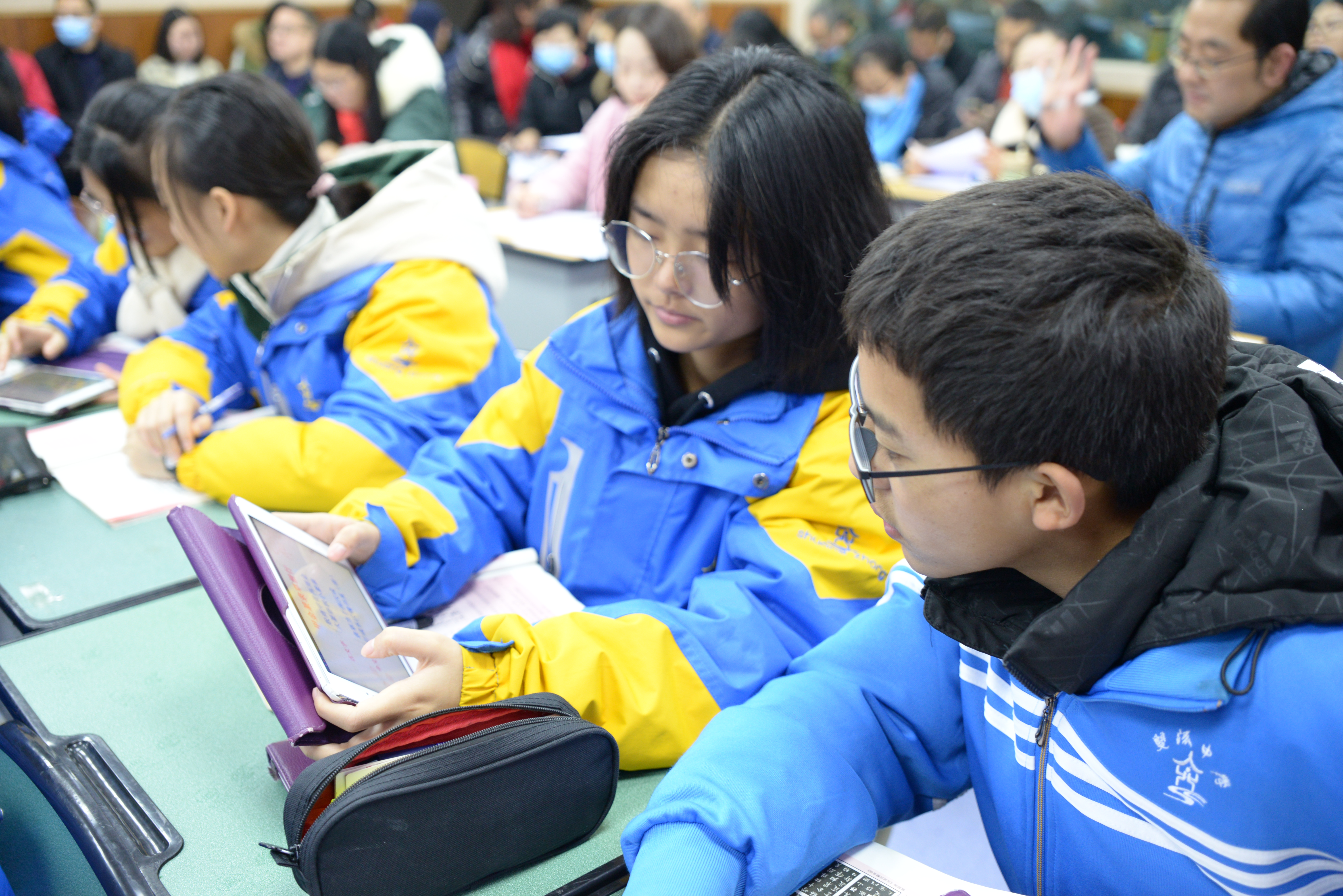 語(yǔ)文課上,學(xué)生使用平板互助