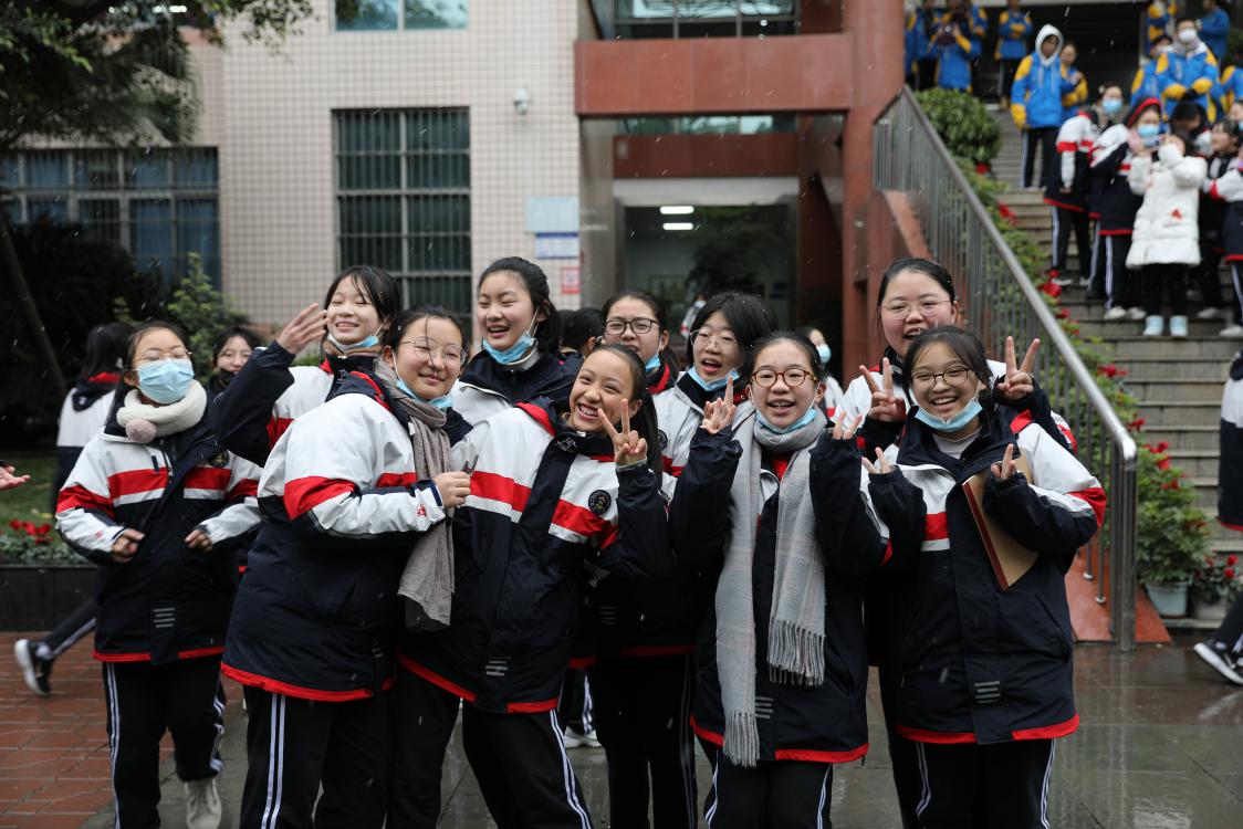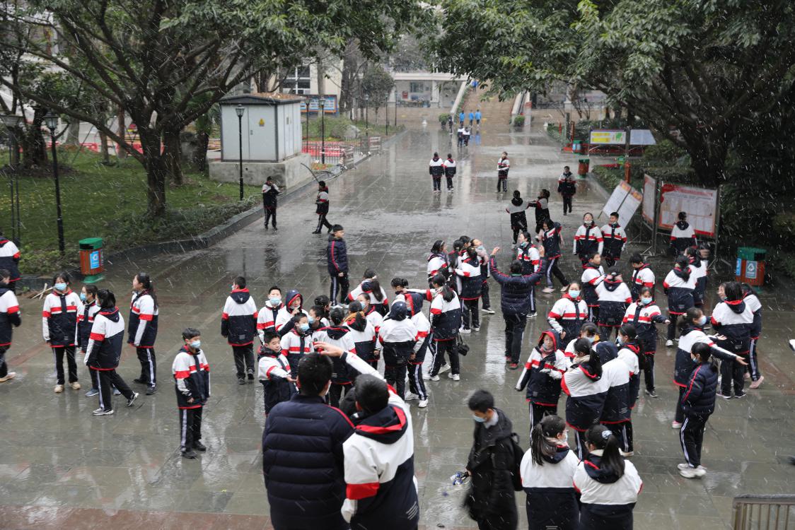 成都的雪盡管不大,經(jīng)常被人戲謔地稱之為“頭皮雪”。然而這細碎的小雪花,卻無限地激起了人們的喜悅和憐愛。下課,同學(xué)們紛紛走出教室,來到室外。紅撲撲的笑臉,蹦蹦跳跳的身影,雪花飄揚,落在他們頭發(fā)上,衣服上,更落在了他們的心上。