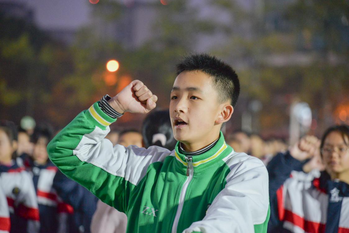 七年級六班鄧嬡君同學發(fā)言最后,八年級二班的李坤陽同學上臺,帶領全體同學莊嚴宣誓: