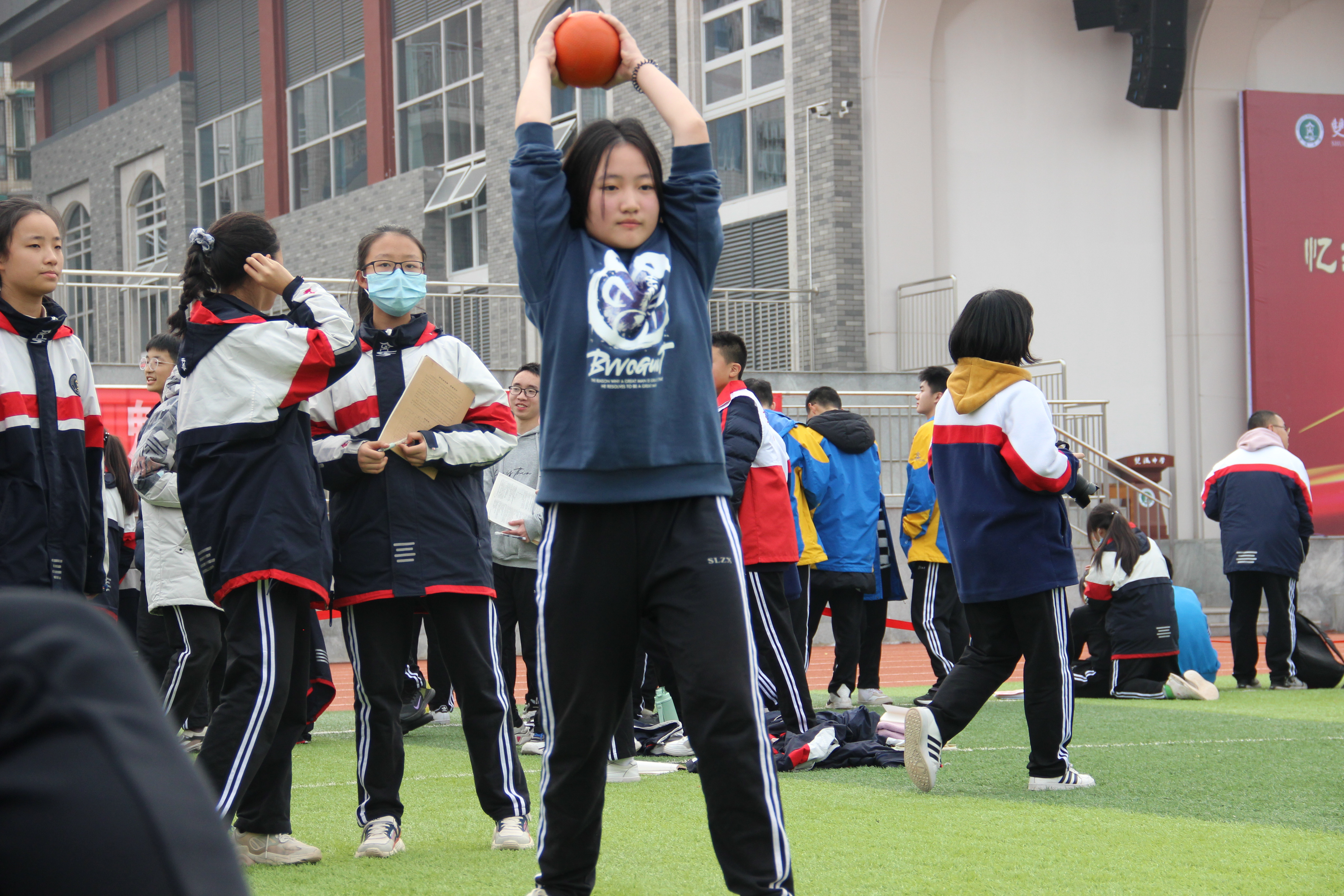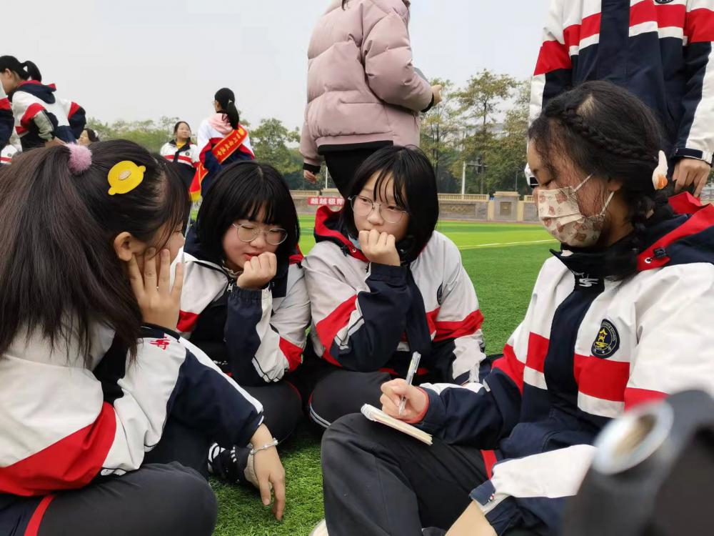 八二班黃一諾同學:“我是做了充分準備的。昨天班級排練時,我就用灌滿了沙子的礦泉水瓶模擬實心球進行練習,晚上放學時就在樓前的空地上練,回家后就在小區(qū)花園練。”