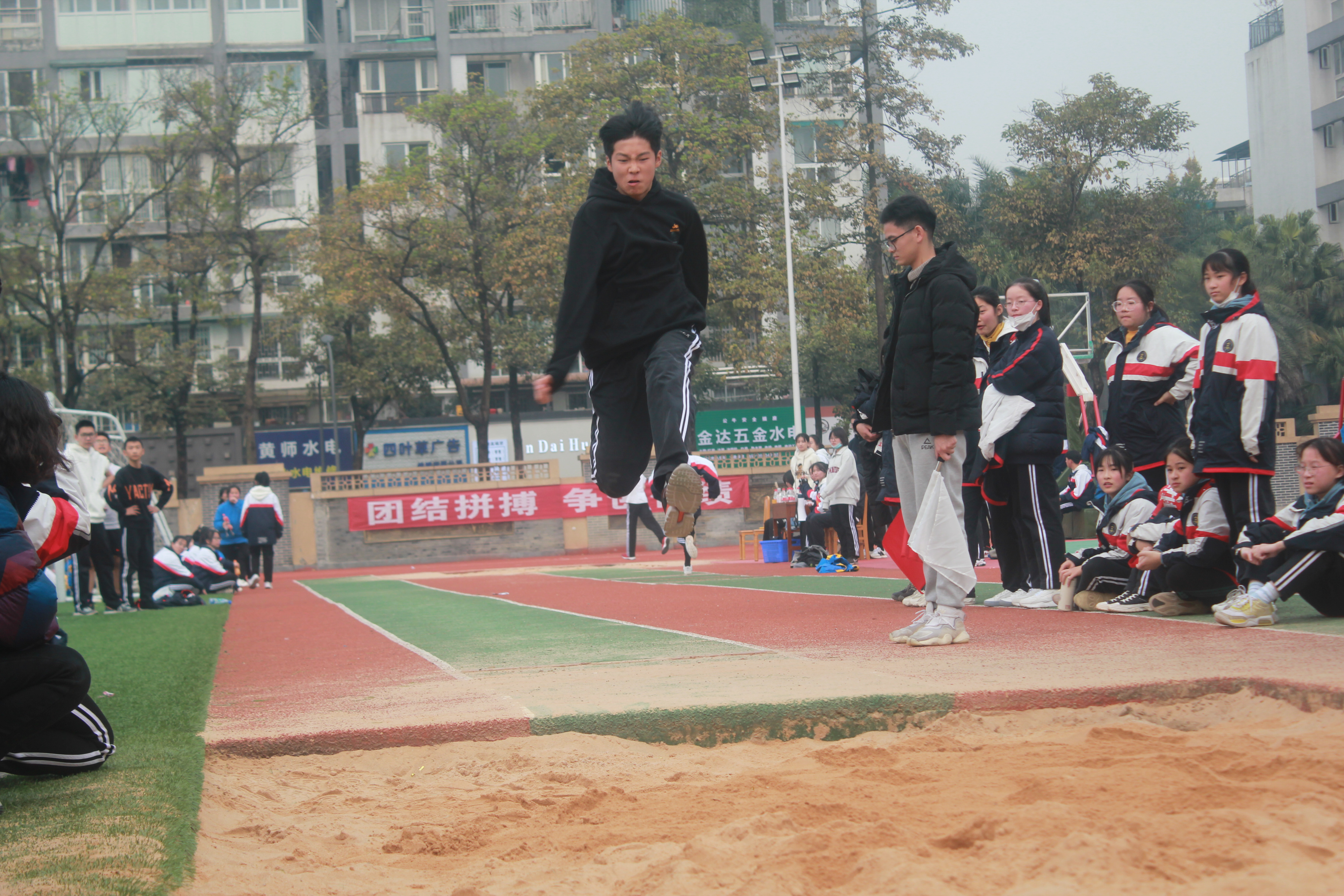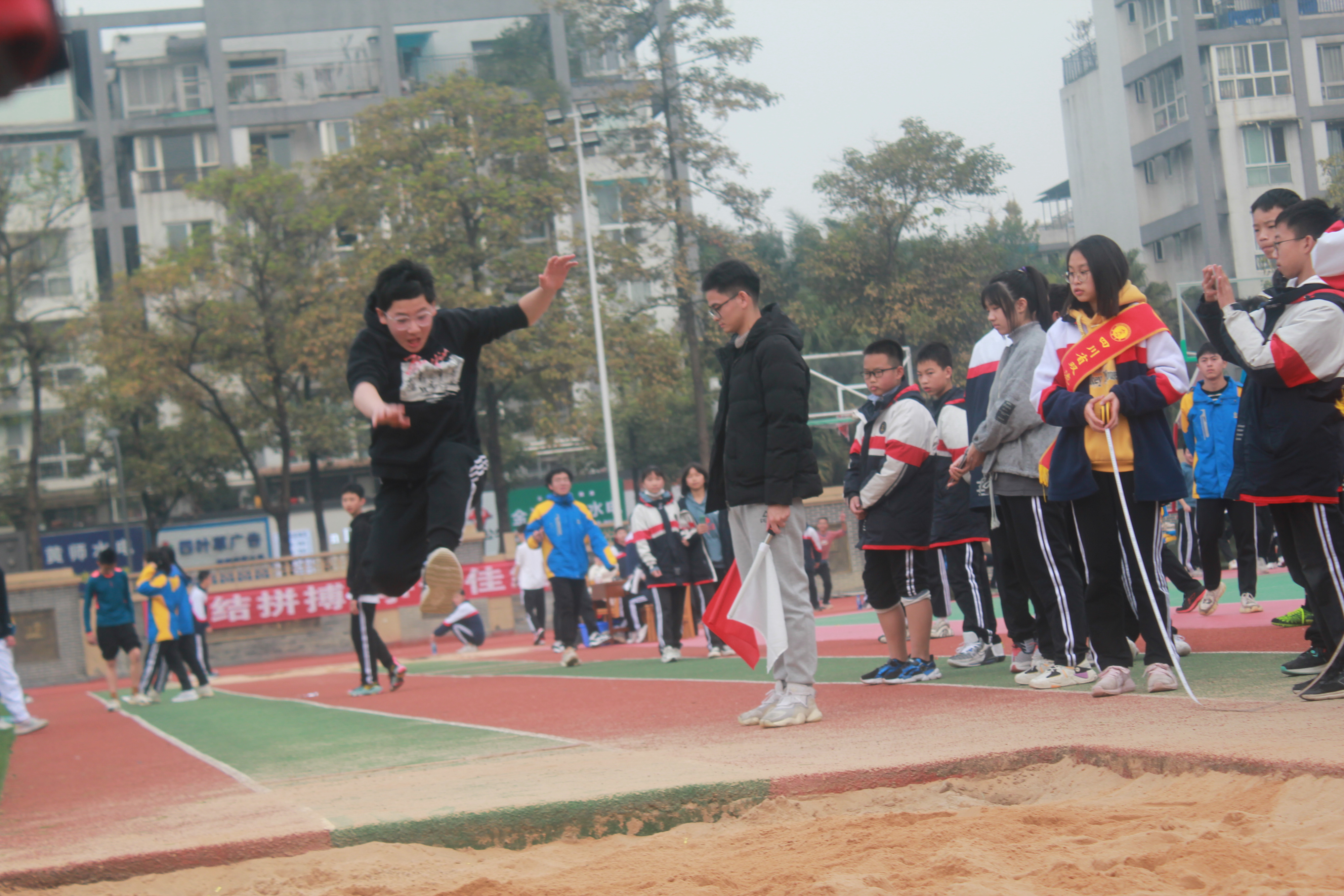 轉(zhuǎn)到沙地,跳遠比賽已經(jīng)開始了。有的同學是第一次參加跳遠比賽,他們狠狠摔倒,模樣十分狼狽,但并不沮喪,同學們關(guān)切的目光,一聲又一聲的“沒事吧?”“沒關(guān)系”“加油!”讓他們滿血復活。這場比賽讓我們真正看到了不拋棄、不放棄、盡全力,勇于拼搏的體育精神!