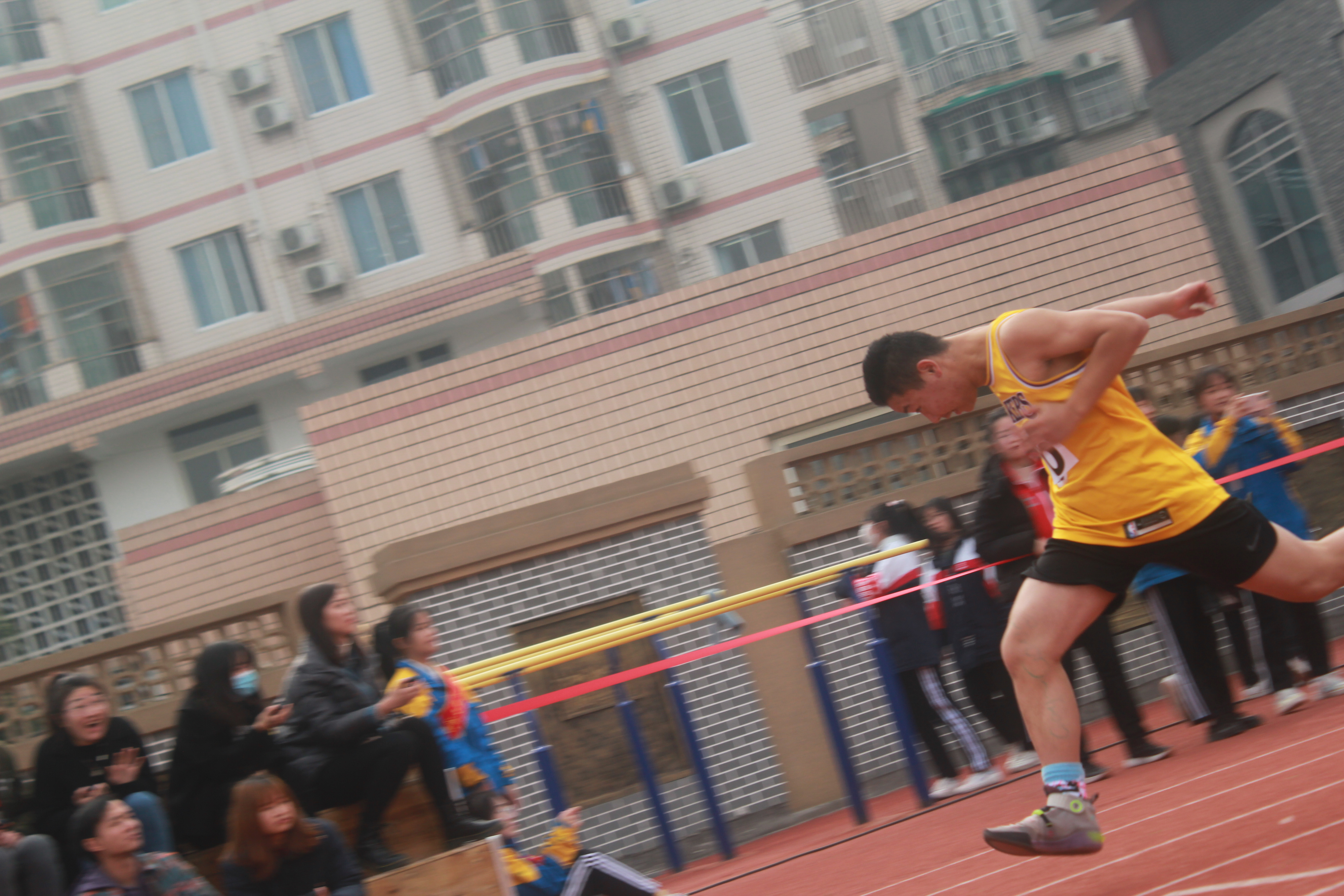 一聲哨響,男子100米賽場上,選手們?nèi)缑擁\的野馬一般瞬發(fā)而出。他們不停的加速,瘋狂擺動著自己的雙臂,他們跑過,只留下有一陣風,向眾人宣誓著:這是我的主場!在他到達終點的那一刻,操場上爆發(fā)出一陣熱烈的掌聲。