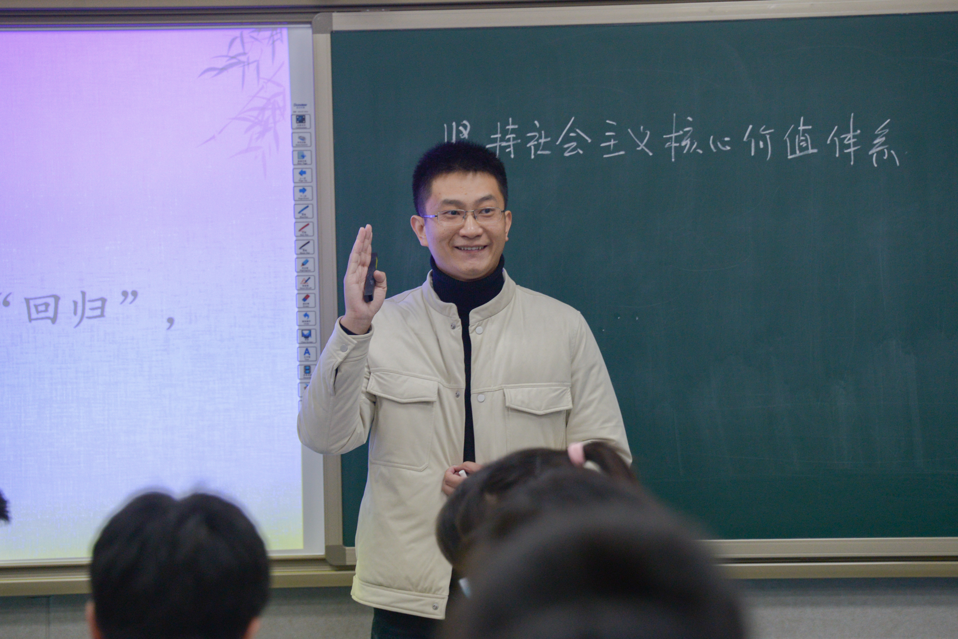 西北中學(xué)的覃小蘭老師解讀眾志成城戰(zhàn)疫情中的精神密碼,層層剖析社會主義核心價值觀,學(xué)生討論熱烈充分,課堂接地氣、有生氣。