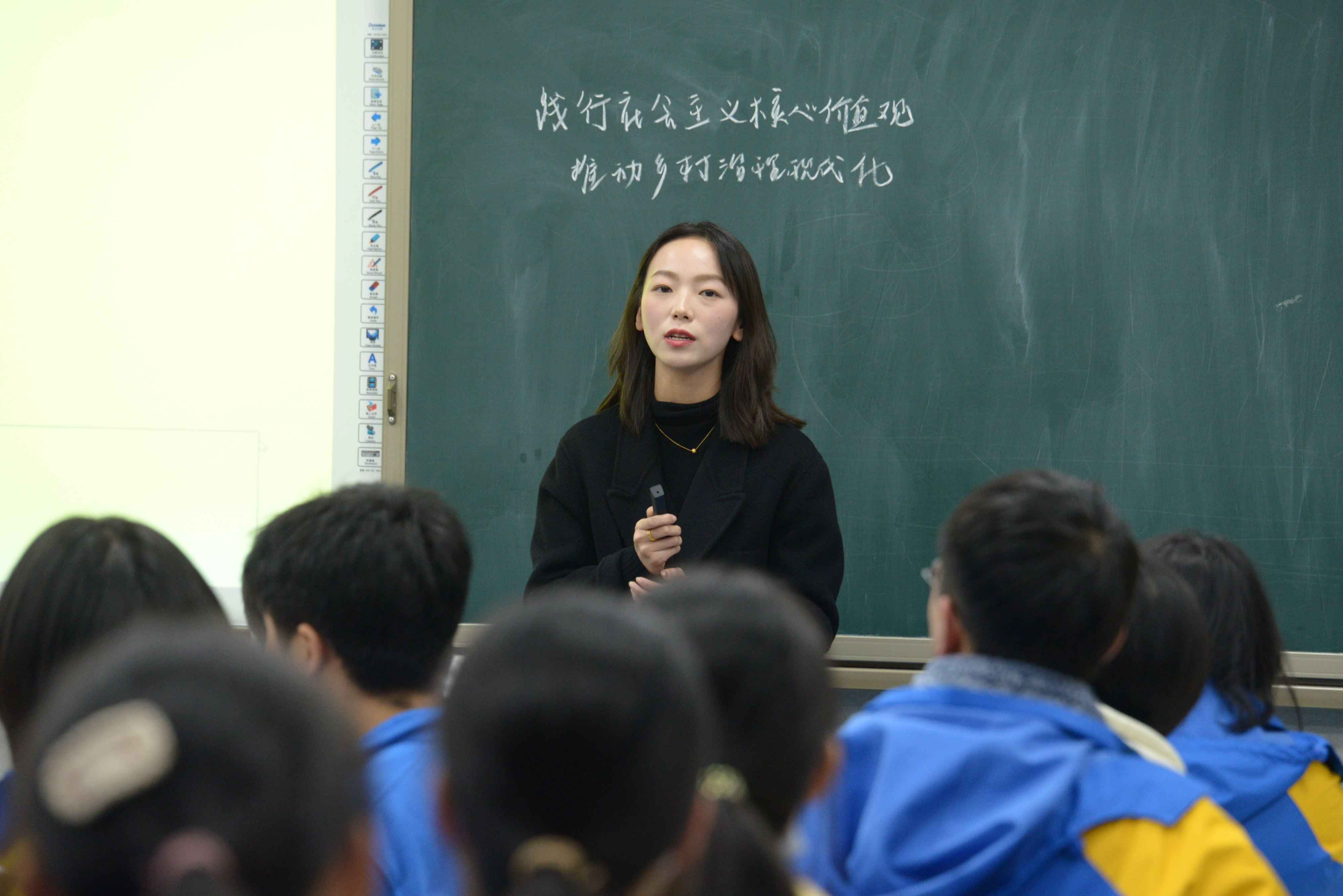 棠湖外國語學(xué)校的李江亞老師以“踐行社會主義核心價值觀,推動鄉(xiāng)村治理現(xiàn)代化”為主題,通過下姜村脫貧致富之路感悟社會主義核心價值觀,敢于走出教材,課堂形式新穎。