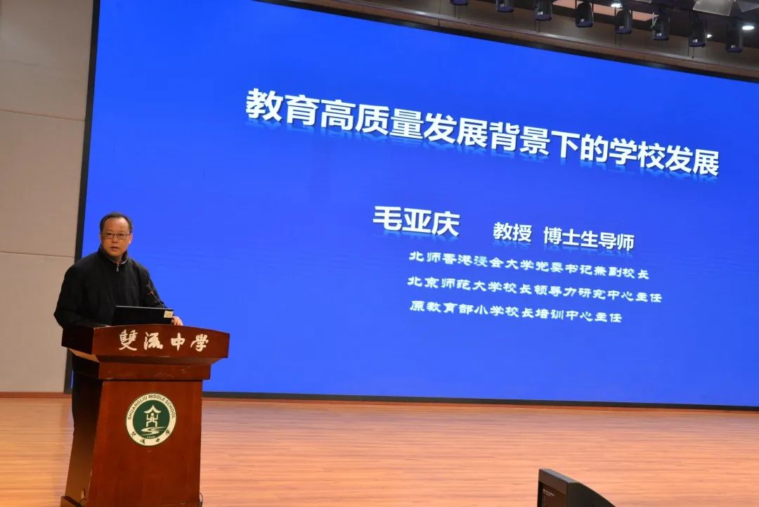10點(diǎn)整,北京師范大學(xué)校長領(lǐng)導(dǎo)力研究中心主任毛亞慶教授作了題為《新時(shí)代教育高質(zhì)量發(fā)展與學(xué)校管理改進(jìn)》的主旨報(bào)告。在報(bào)告中,毛亞慶主任具體解讀了 “新時(shí)代”的“新”、“高質(zhì)量發(fā)展”、“好教育”等概念的具體內(nèi)涵,指出基礎(chǔ)教育發(fā)展的定位即是在新時(shí)代要全面關(guān)注質(zhì)量。教育要回歸本真,要培養(yǎng)學(xué)生具有健康的身體,健全的心智和積極的情感,樹人根本,要立本真的人。一所好的學(xué)校要堅(jiān)持科學(xué)與明珠,要追求理性的獲得與人性的提升。毛亞慶主任最后向大家分享了他的教育感想,關(guān)鍵詞為“求真”和“踐行”,求真即為處事真切,待人真摯,踐行則是要真的做,做到真!