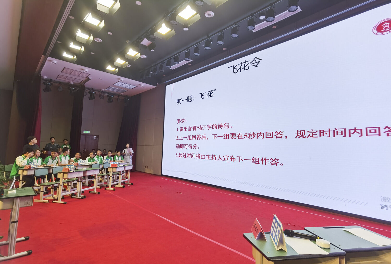 選手答題環(huán)節(jié)四:飛花令。飛花令,是古人行酒令時的文字游戲,源自于古人的詩詞之趣,得名于唐代詩人韓翃《寒食》中的名句“春城無處不飛花”。參與本環(huán)節(jié)的是搶答題后勝出的六個小組,主持人一聲令下,參賽選手們便以“花”為題,開始了第一場飛花令,只見賽場上的六組選手口吐文墨,滔滔不絕,真是腹有詩書氣自華呀。