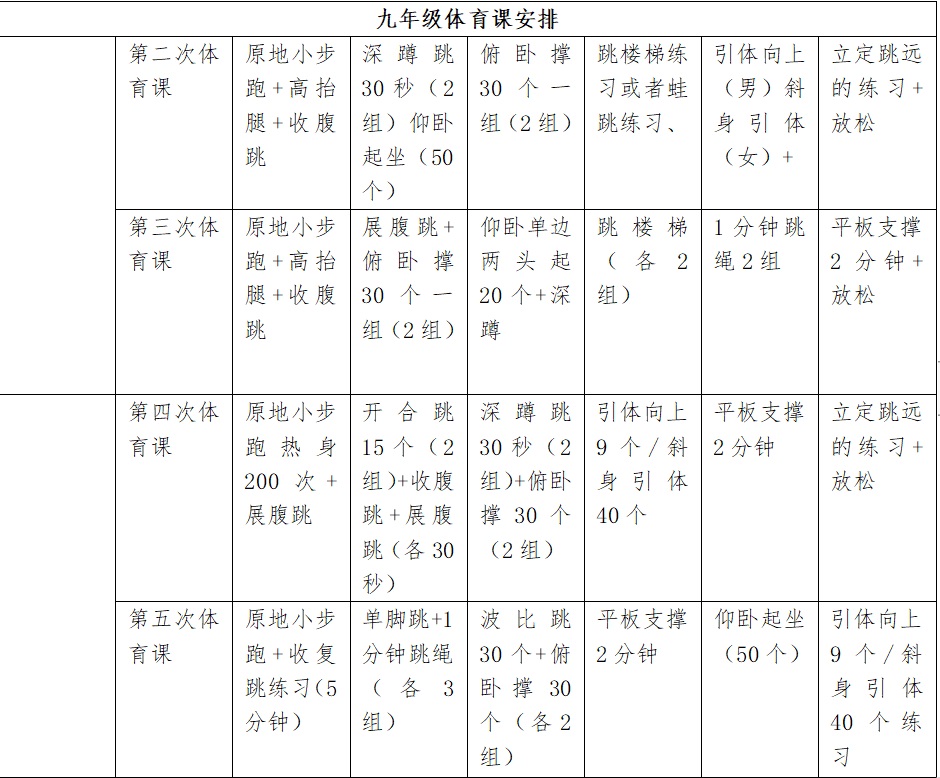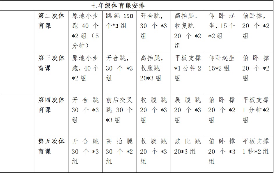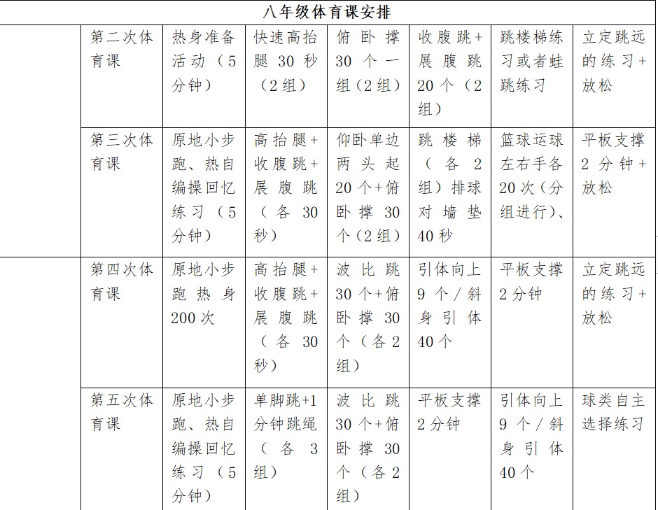 秉承“只改變教學(xué)模式,不改變教學(xué)目標(biāo),不降低運(yùn)動(dòng)質(zhì)量”的原則,雙流中學(xué)初中部充分利用現(xiàn)有教育資源平臺(tái)提供的課程資源,結(jié)合實(shí)際,采用“在線直播教學(xué)”和“線上視頻課程教學(xué)”的方式進(jìn)行。從簡(jiǎn)單的廣播操、心肺能力訓(xùn)練再到核心力量的訓(xùn)練,在保障安全的前提下,老師們精心設(shè)計(jì)了更符合室內(nèi)鍛煉的課程,安排了更合理的課后鍛煉時(shí)間,盡全力引導(dǎo)同學(xué)們做的動(dòng)得標(biāo)準(zhǔn)、動(dòng)得有效。