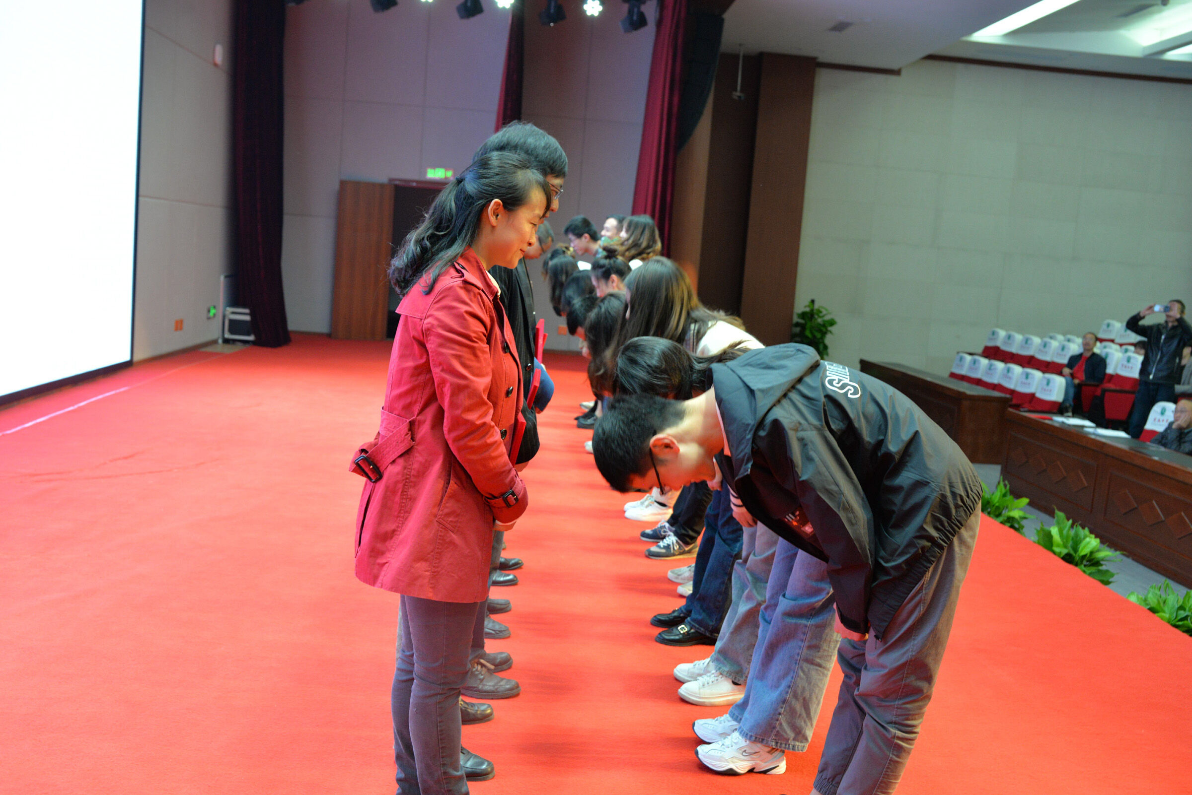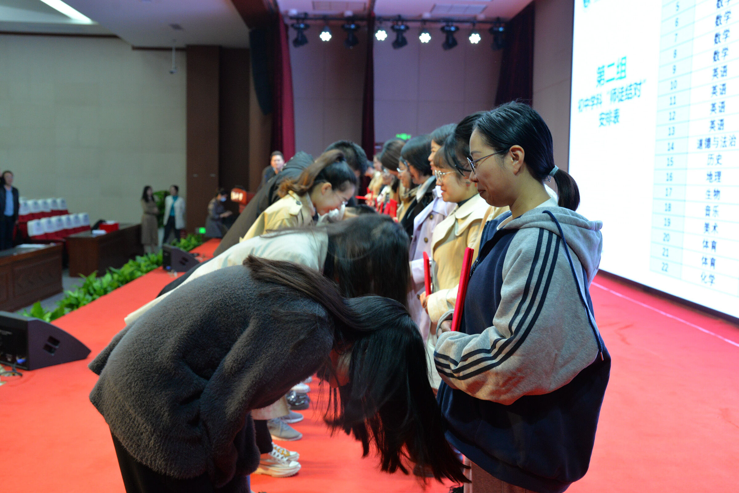 結(jié)對儀式上,首先由徐天福副校長宣讀了各年級師徒結(jié)對名單,并分別由譚紅校長,向發(fā)友副書記,田明建主席,徐天福副校長,杜江濤副校長為師傅教師們頒發(fā)聘書。聘書頒發(fā)完之后,徒弟教師們依次上臺鞠躬感謝師傅們,并與師傅合影留念。