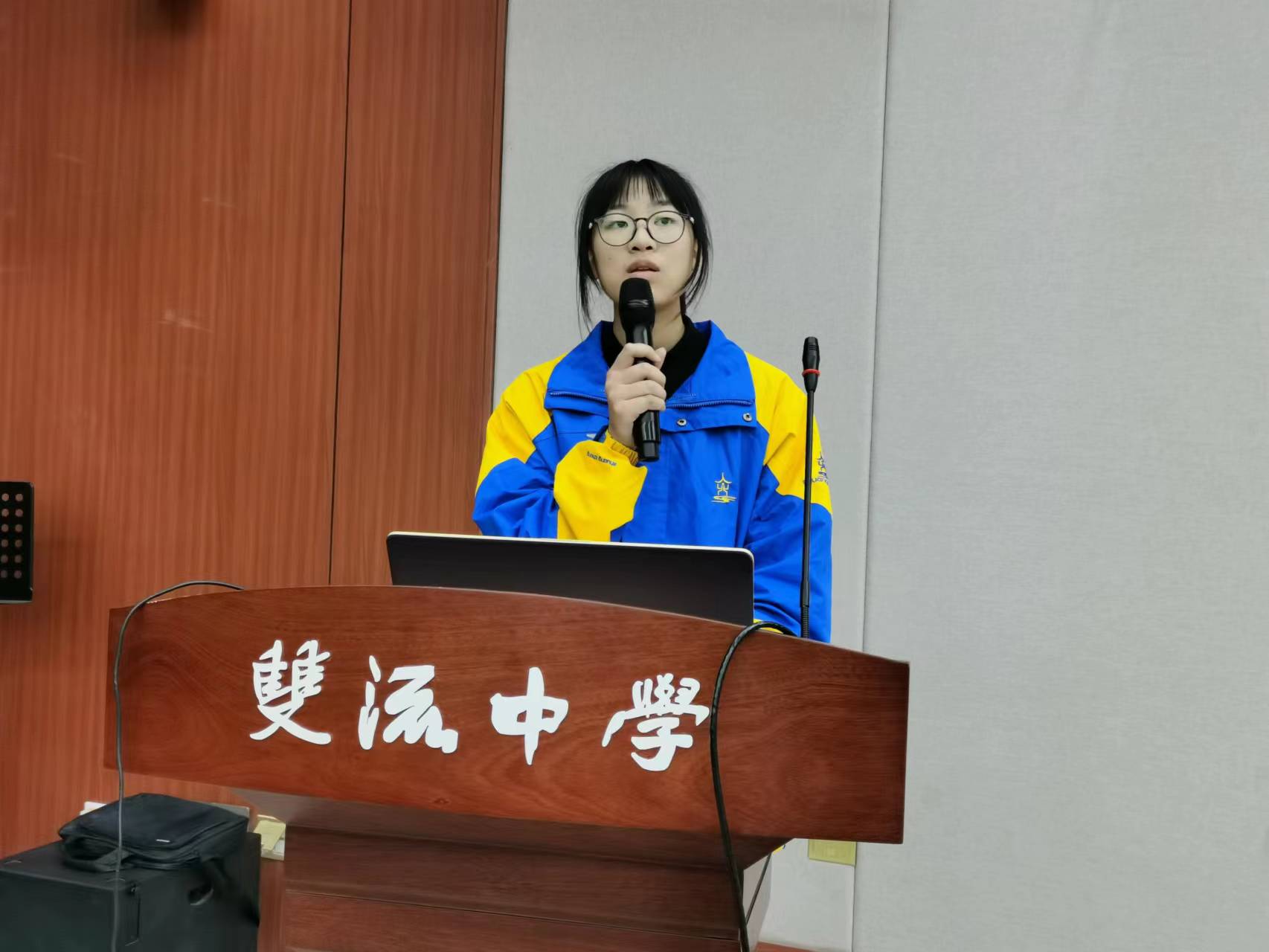 隨后,高三14班的鄭淑婷同學(xué)分享了自己在雙流中學(xué)這塊沃土上的成長(zhǎng)經(jīng)歷。老師的悉心教導(dǎo)如同燈塔,驅(qū)散了她心頭的陰霾,指引著她前行的方向。鄭淑婷同學(xué)“見(jiàn)賢思齊,見(jiàn)不賢而內(nèi)自省也”,最終從年級(jí)前一百名沖進(jìn)文科全區(qū)前十。她鼓勵(lì)初三的學(xué)弟學(xué)妹們:要有“長(zhǎng)風(fēng)破浪會(huì)有時(shí),直掛云帆濟(jì)滄海”的堅(jiān)定信念,更要懷揣堅(jiān)韌不拔之志上下求索,突破局限,逐夢(mèng)青春。