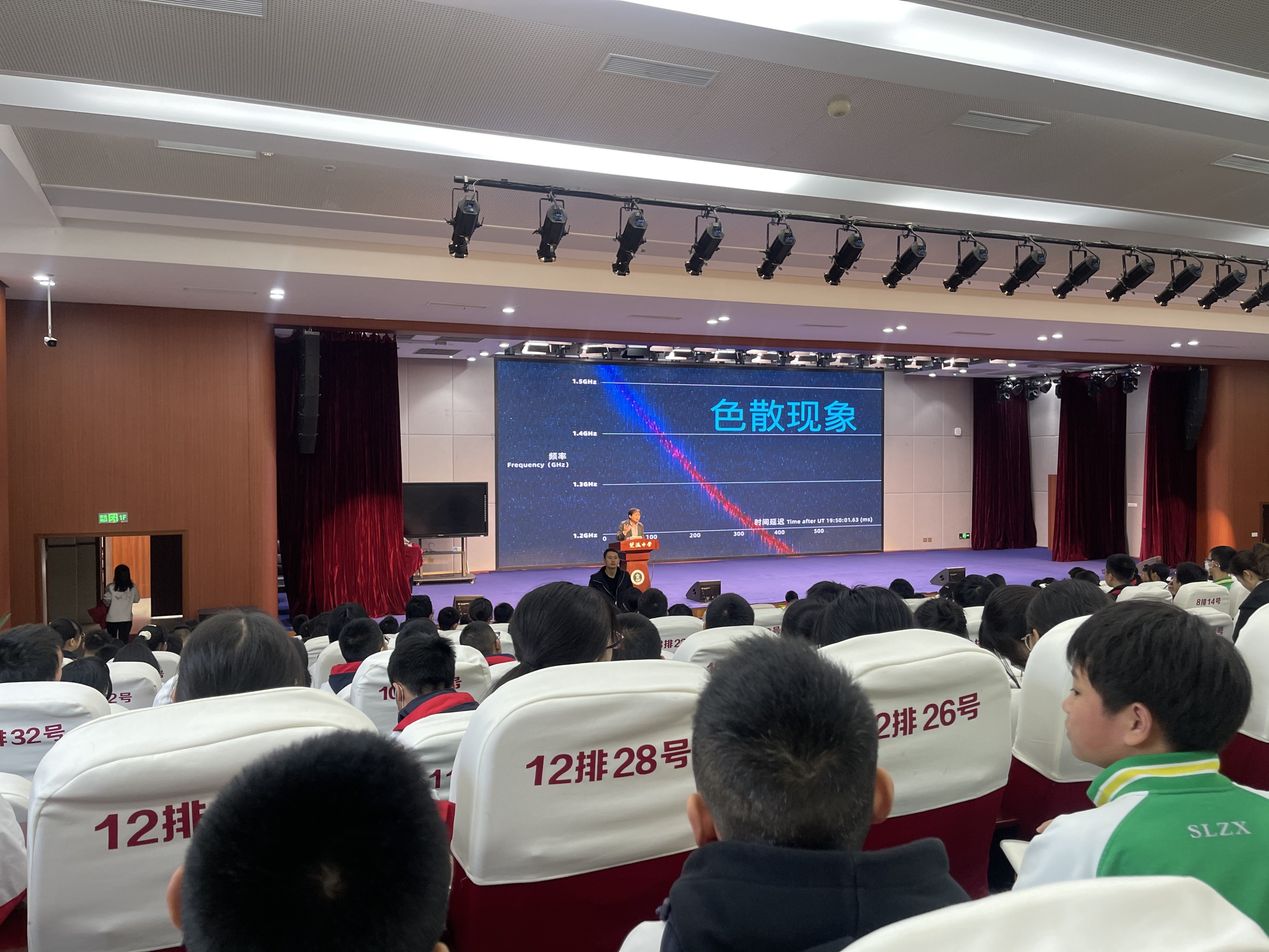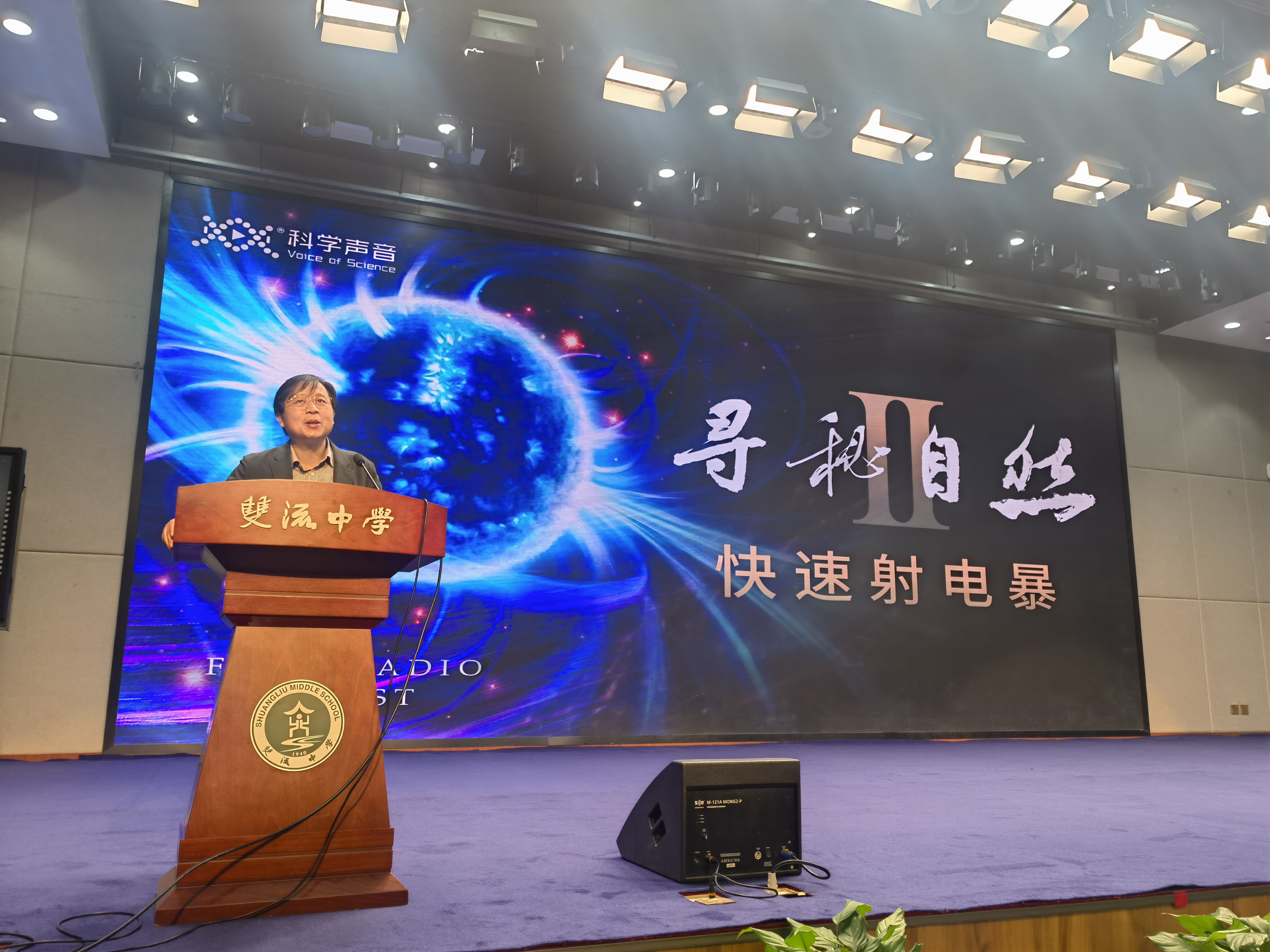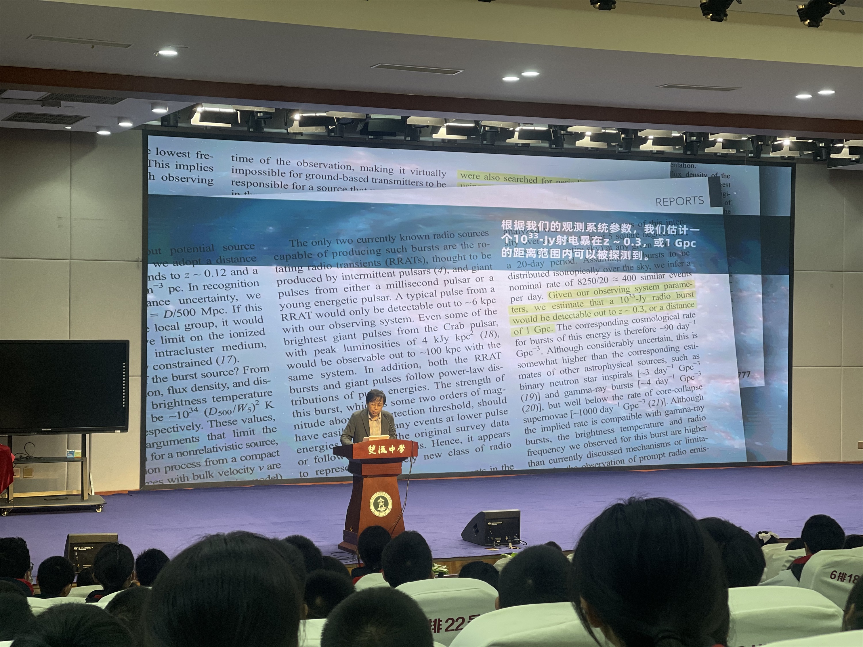 汪詰老師向同學們介紹了快速射電暴(Fast Radio Bursts, FRB),是一種神秘的來自銀河系外的射電天文現(xiàn)象。爆發(fā)的持續(xù)時間僅為幾個毫秒,卻可在這極短的時間內(nèi)顯示出極高的亮度,相當于太陽在一整天內(nèi)釋放的能量。兩顆中子星相吸合并后能產(chǎn)生一種非?;钴S的磁陀星,而這些活躍的磁陀星會產(chǎn)生活躍的重復快速射電暴。