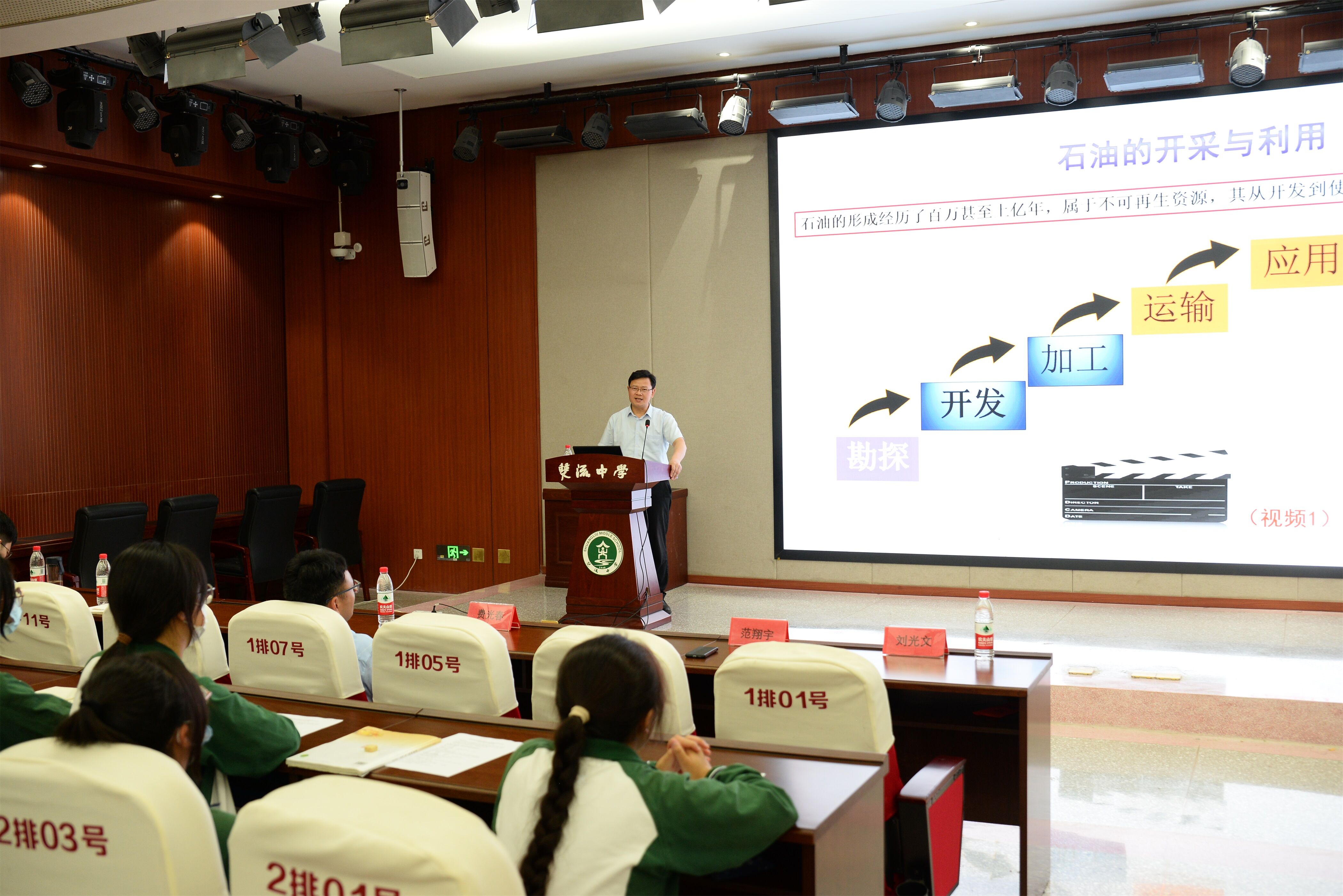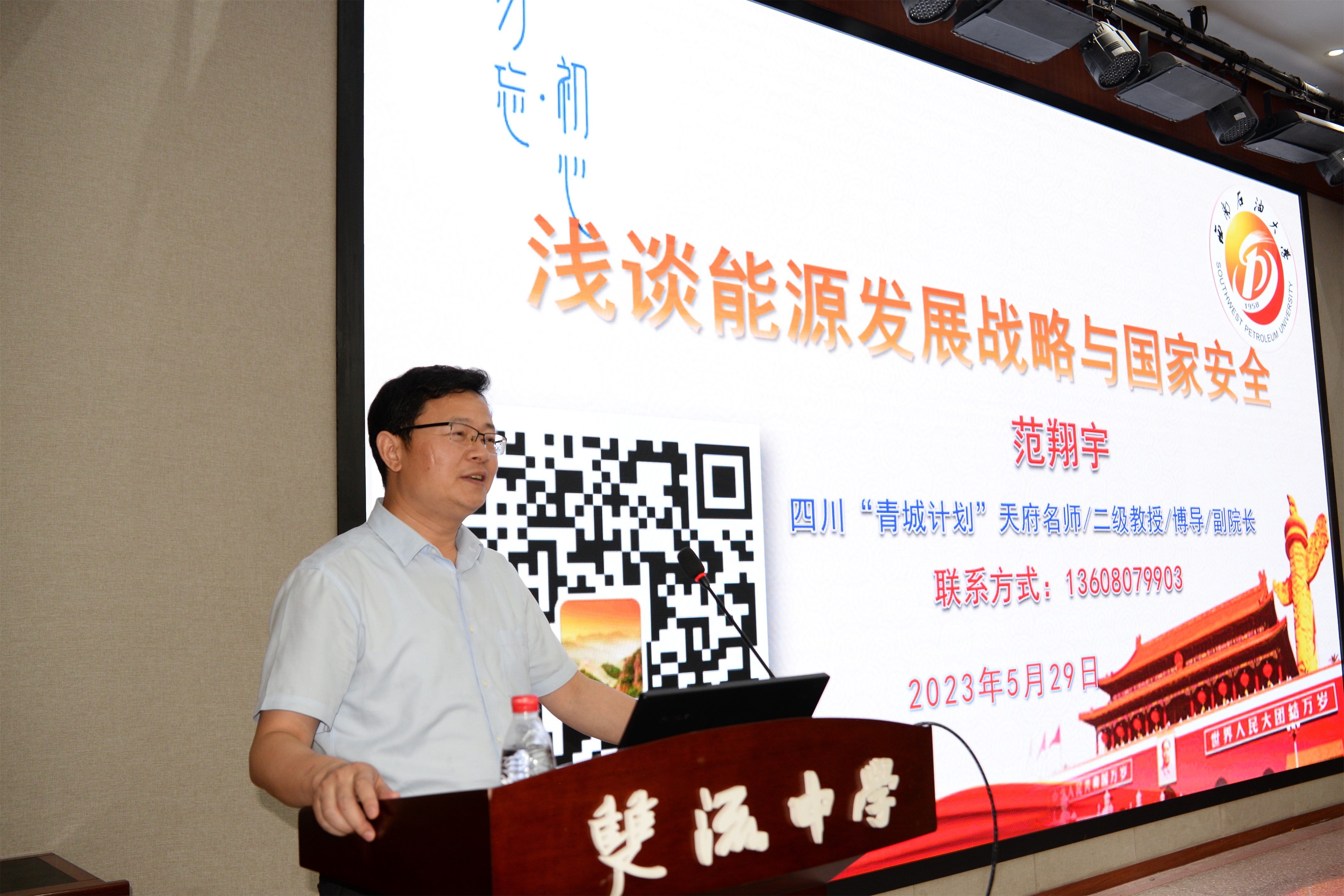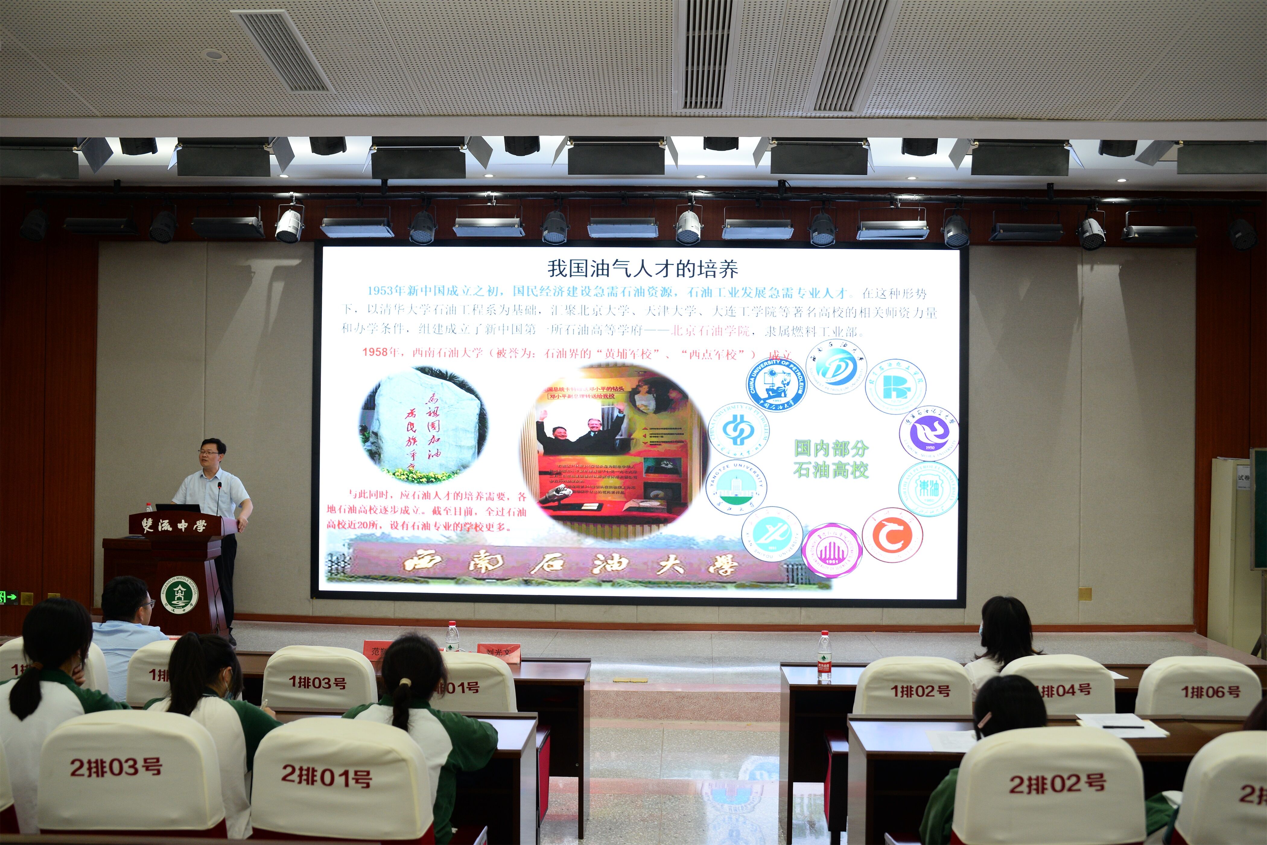 范翔宇教授為雙中學(xué)子普及了中國能源發(fā)展及能源戰(zhàn)略安全的相關(guān)知識。作為“天府青城計(jì)劃”天府名師, 四川省學(xué)術(shù)與技術(shù)帶頭人、國家自然科學(xué)基金評審專家、中石油科技獎(jiǎng)專家?guī)斐蓡T、四川省國土資源專家,范翔宇教授長期從事地質(zhì)資源與地質(zhì)工程、資源與環(huán)境、油氣井工程相關(guān)的教學(xué)和科研工作。范翔宇教授先是給雙中學(xué)子普及了能源的相關(guān)基礎(chǔ)知識,明確了能源的重要性,它是國民經(jīng)濟(jì)和社會發(fā)展不可缺少的生產(chǎn)要素和物質(zhì)基礎(chǔ),象征著在國際社會的話語權(quán)問題。接著,范翔宇教授從石油與我們的生活、石油的勘探與開采、石油危機(jī)與國家安全、石油與新能源、我國石油人才與企業(yè)五個(gè)方面,結(jié)合前沿研究為雙中學(xué)子深入淺出地帶來了分享,并對雙中學(xué)子成長為能源相關(guān)專業(yè)人才,將來為國家能源安全奉獻(xiàn)力量提出了希冀。