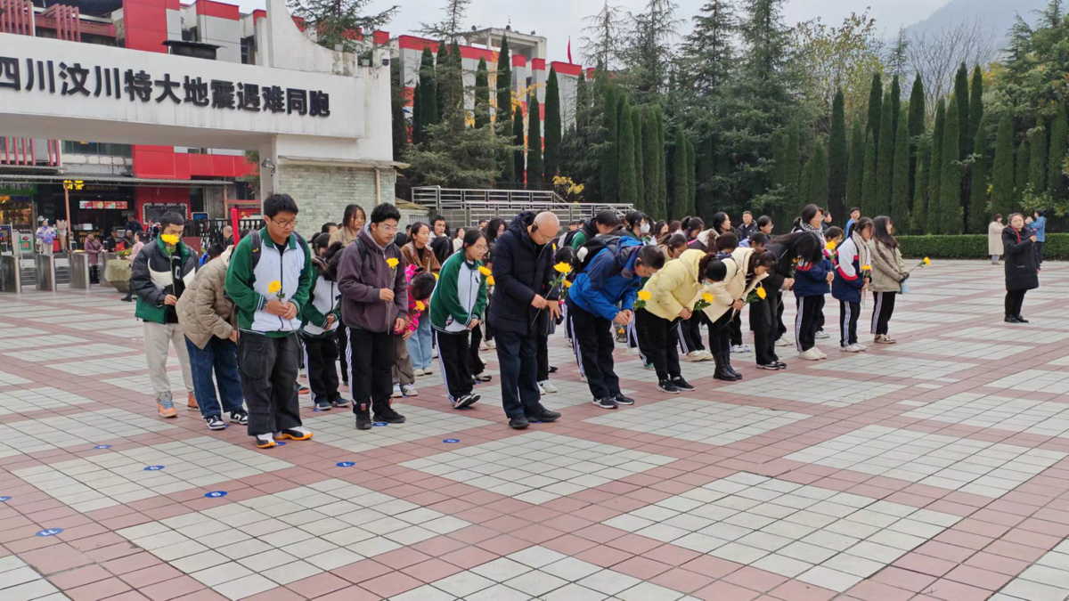 在講解員的帶領下,同學們第一站來到了漩口中學遺址。漩口中學的時間,在2008年5月12日14:28被按下了停止鍵。面對著災后的殘垣斷壁,全體師生實地感受大自然的殘酷無情后都感到心情沉重,心里充滿了對死難者的哀悼之情以及對救援英雄的深深敬意。漩口中學廣場上,向書記帶領全體老師、同學們?yōu)槭湃サ耐?、鞠躬、獻上鮮花。