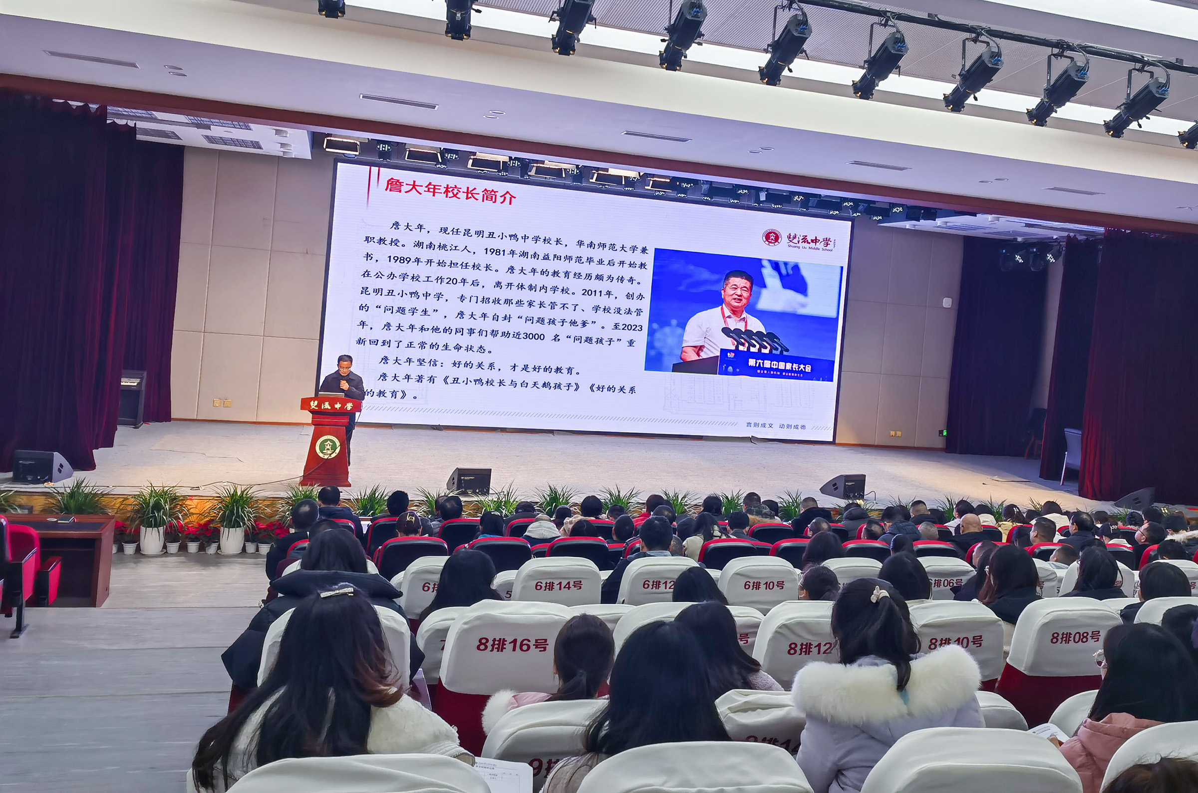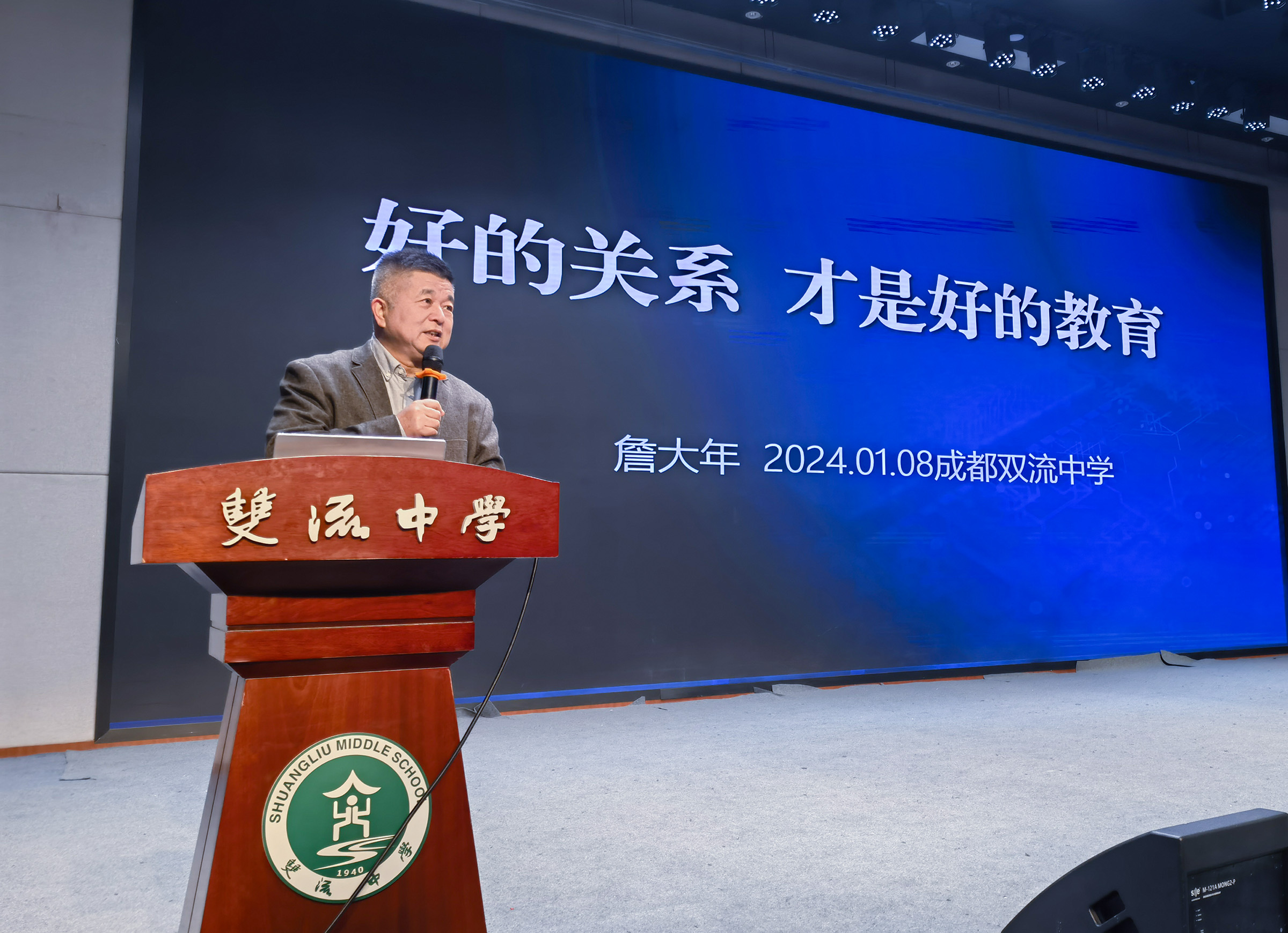寒風(fēng)凜冽,天氣清寒,但學(xué)校玉蘭廳里卻暖意融融。2024年1月8日下午,四川省雙流中學(xué)邀請昆明丑小鴨學(xué)校校長詹大年在玉蘭廳舉行主題為《好的關(guān)系 好的教育》的專題講座。杜江濤副校長擔(dān)任本次活動(dòng)的主持人,全校年級組長、班主任、35 歲以下青年教師、德育安全處以及全體生活老師均到場觀摩學(xué)習(xí)。