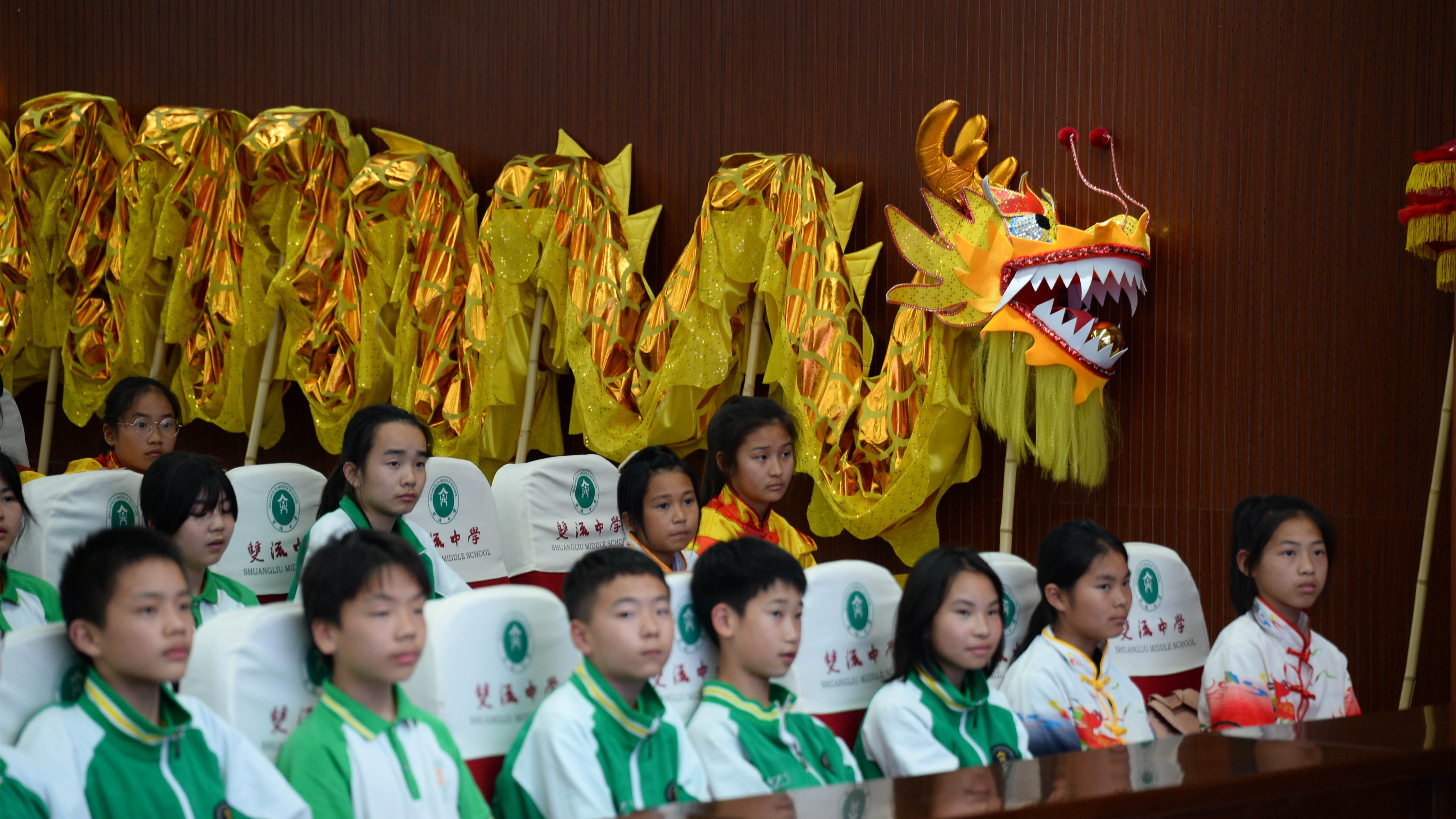 許誠老師為四川省雙流中學(xué)的學(xué)生講解舞龍的歷史淵源、文化內(nèi)涵和技巧要領(lǐng)。