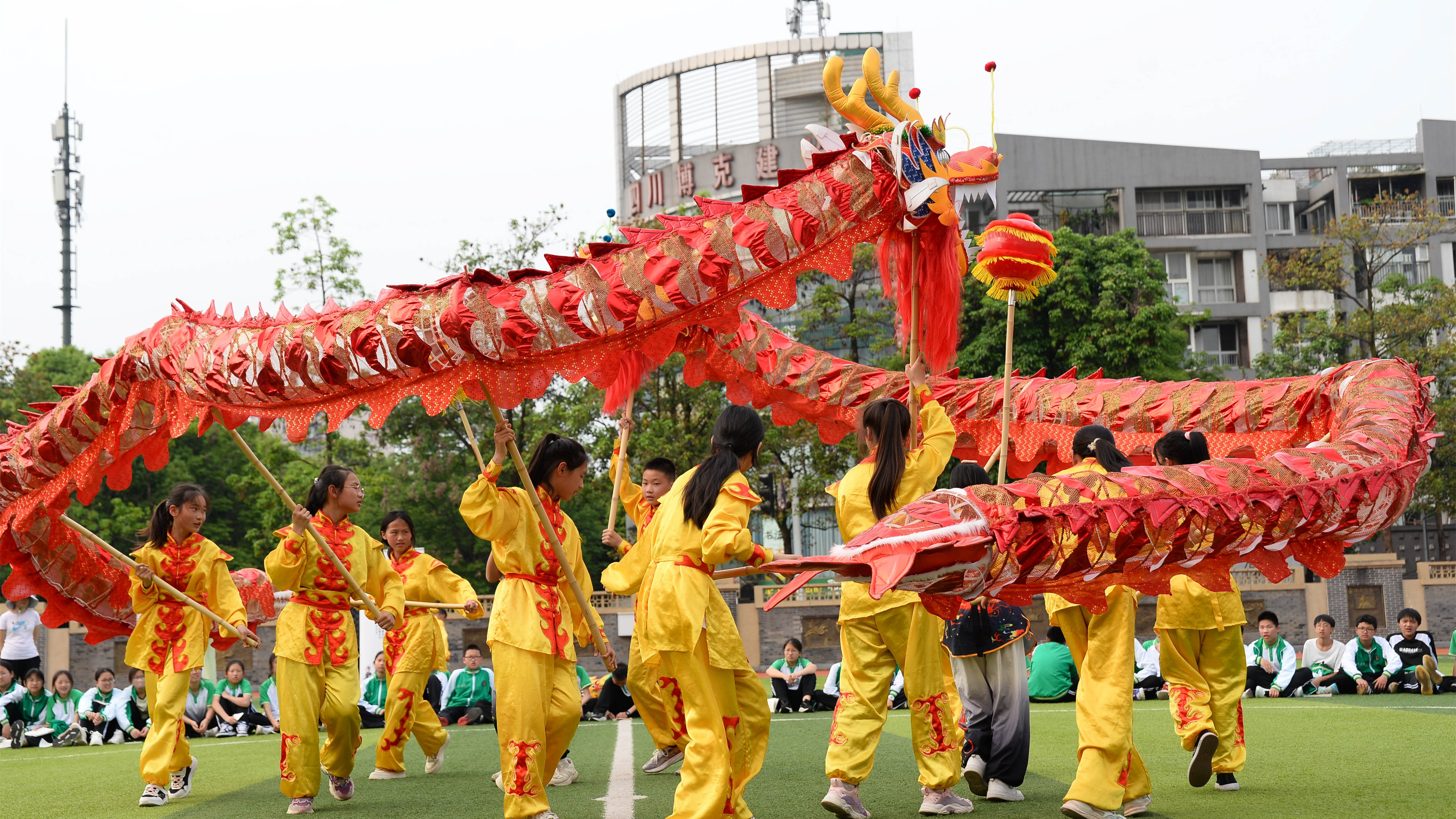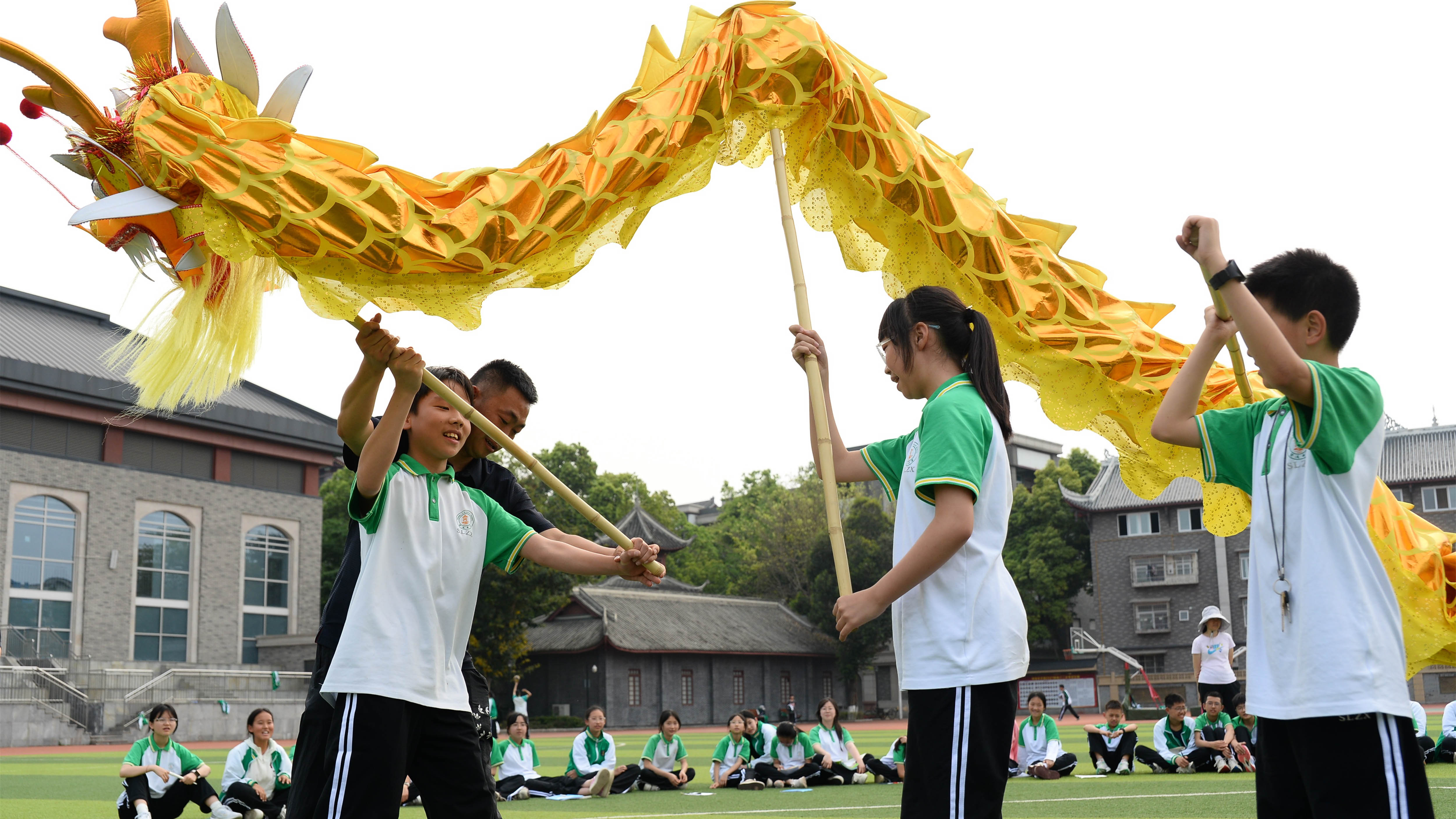 舞龍,作為中華民族的傳統(tǒng)體育項目,承載著豐富的文化內(nèi)涵和民族精神。此次活動邀請了黃龍溪學(xué)校的舞龍大師許誠老師和他的學(xué)生們(包括多位非遺舞龍傳承人)。他們帶著精湛的技藝和滿腔的熱情,走進四川省雙流中學(xué)的校園,為孩子們帶來了一場場精彩絕倫的舞龍表演。