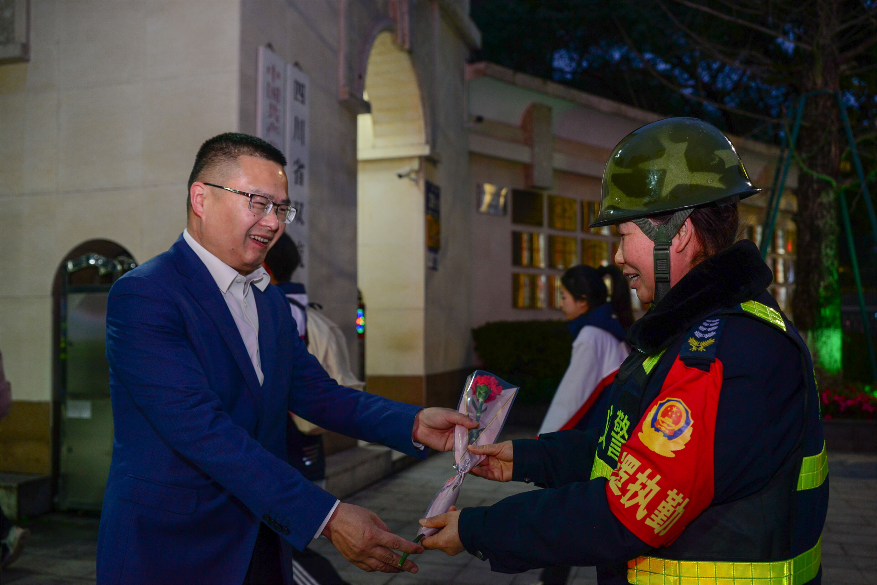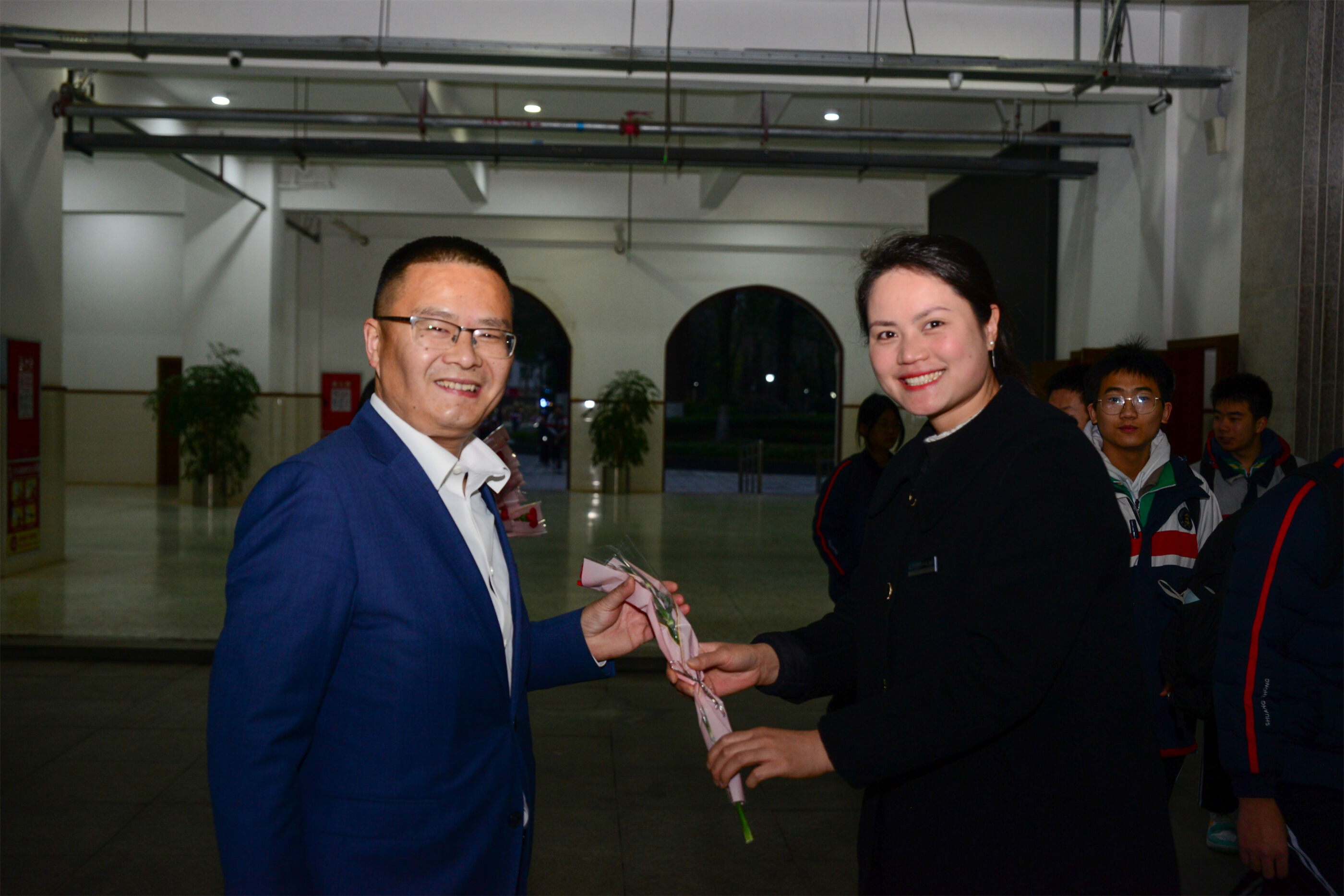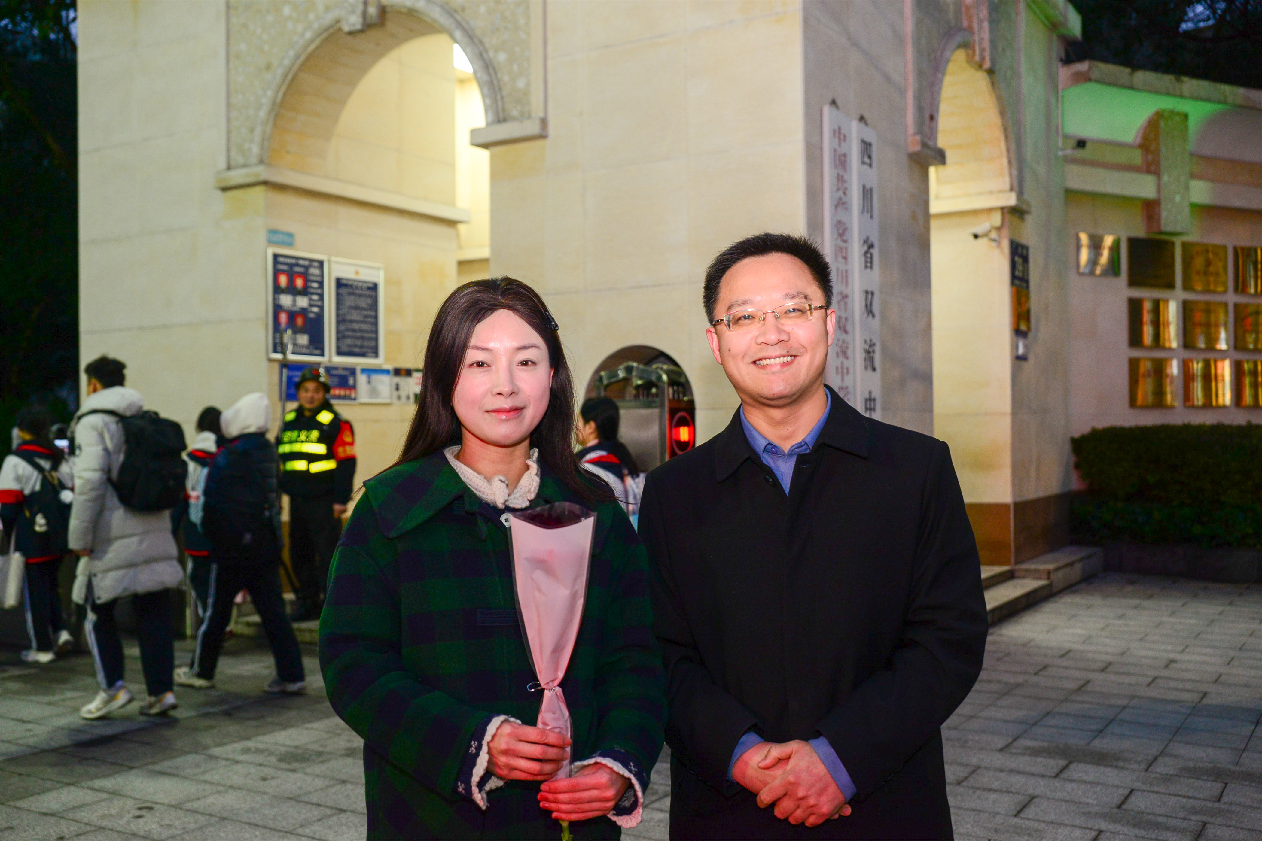 雙流中學(xué)副校長(zhǎng)杜江濤為女教師送花