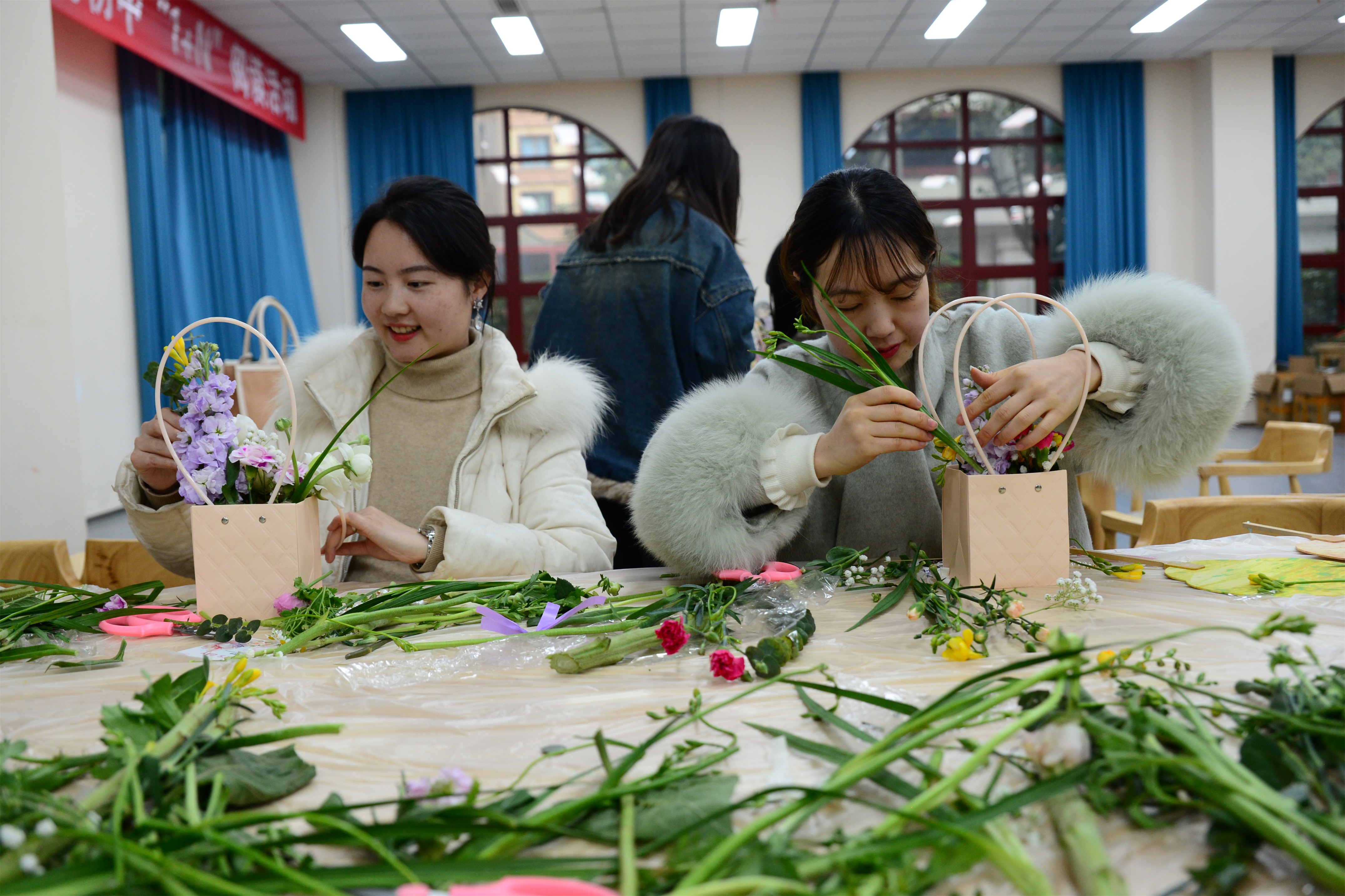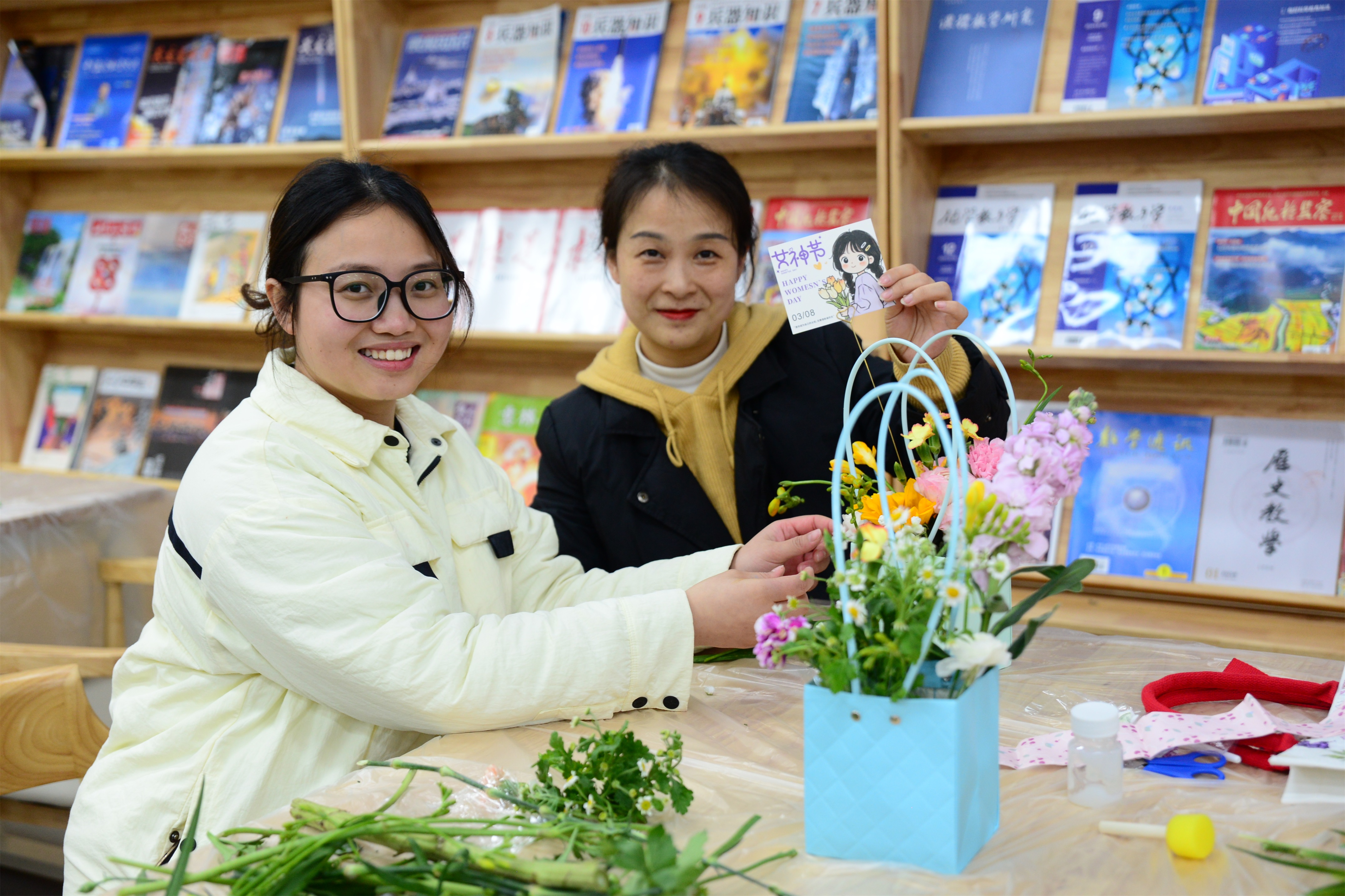 閱覽室變身“花藝工坊”,老師們用靈巧的雙手將枝葉與鮮花編織成詩(shī)意的插花作品。