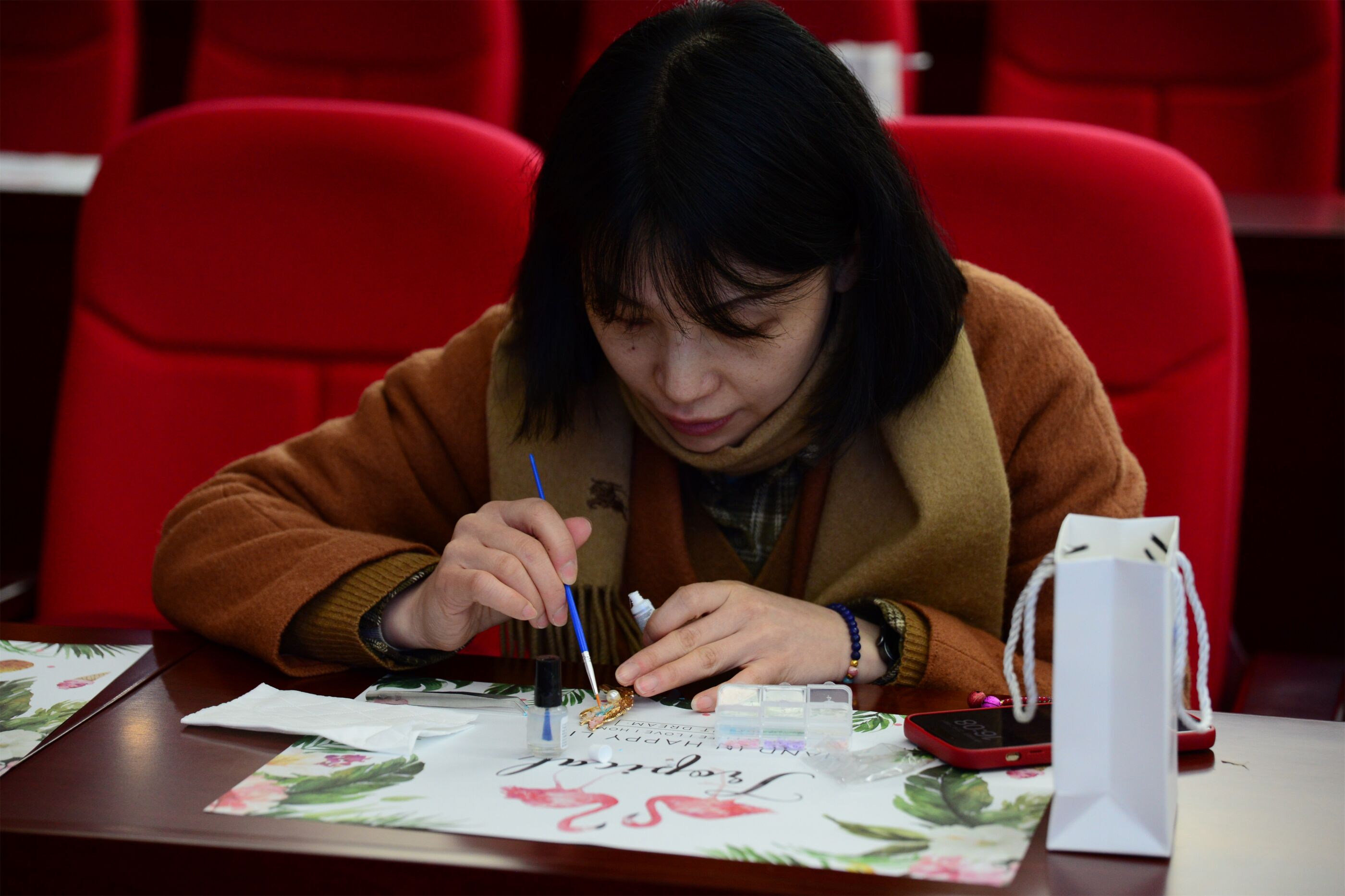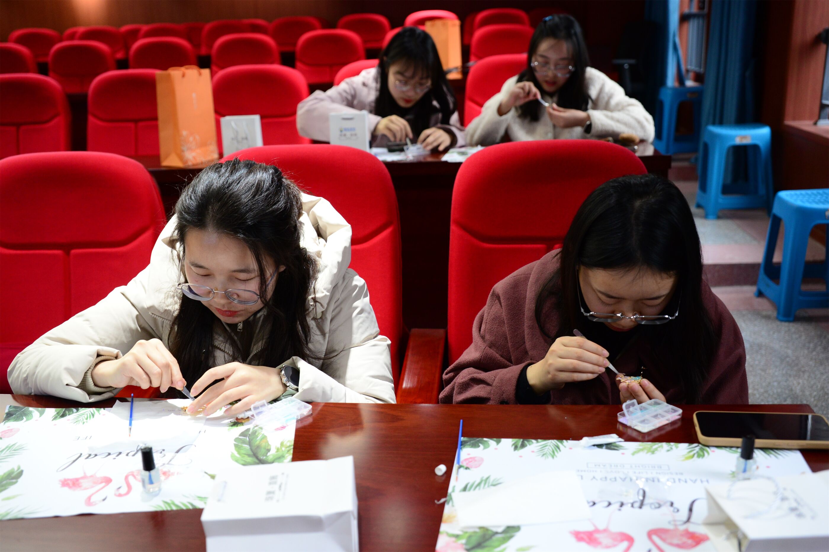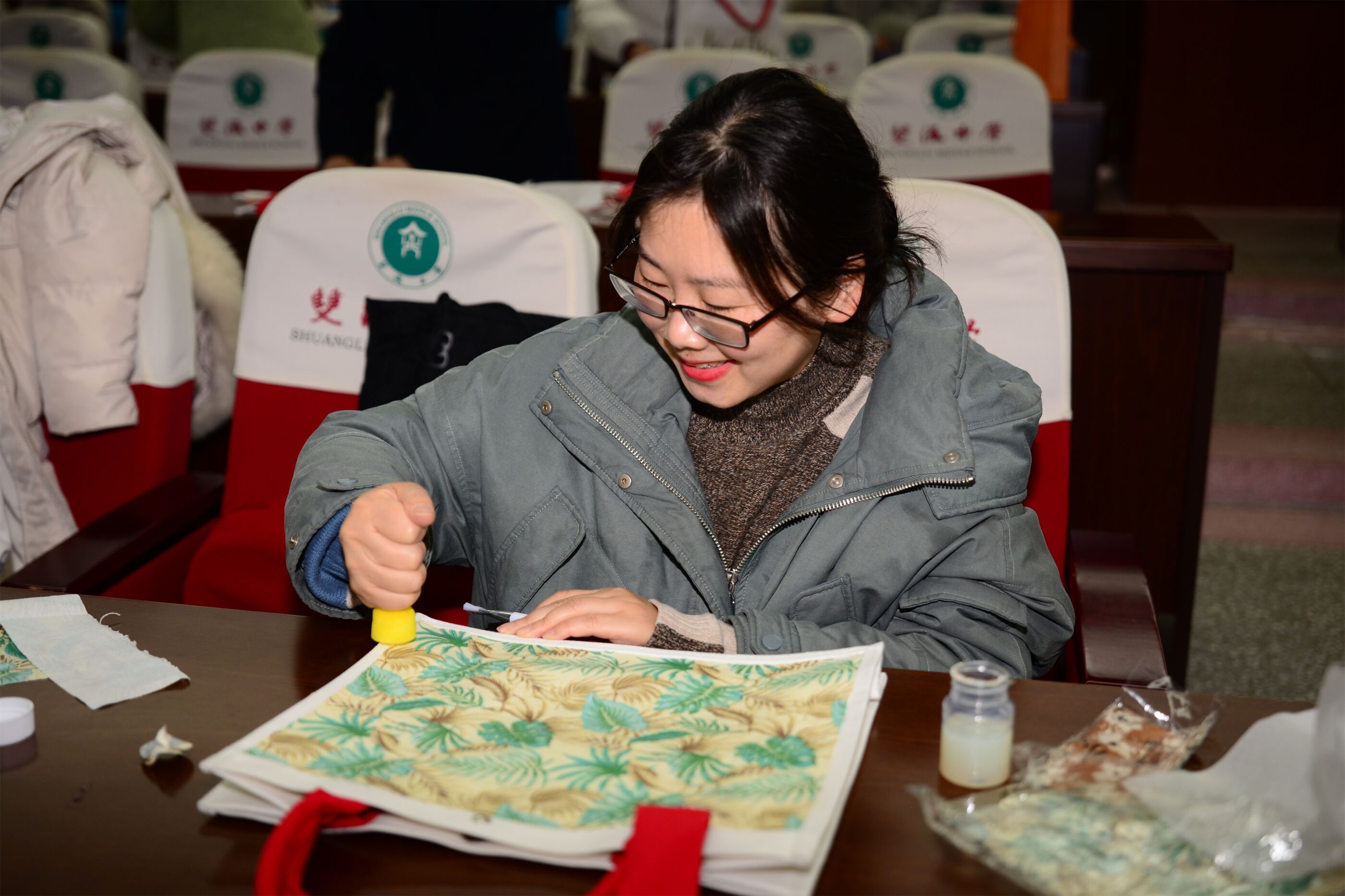 叢桂廳里,手繪蝶骨特包活動(dòng)熱鬧非凡。畫筆輕點(diǎn),帆布包上翩然躍出春色,實(shí)用與藝術(shù)在此完美交融。
