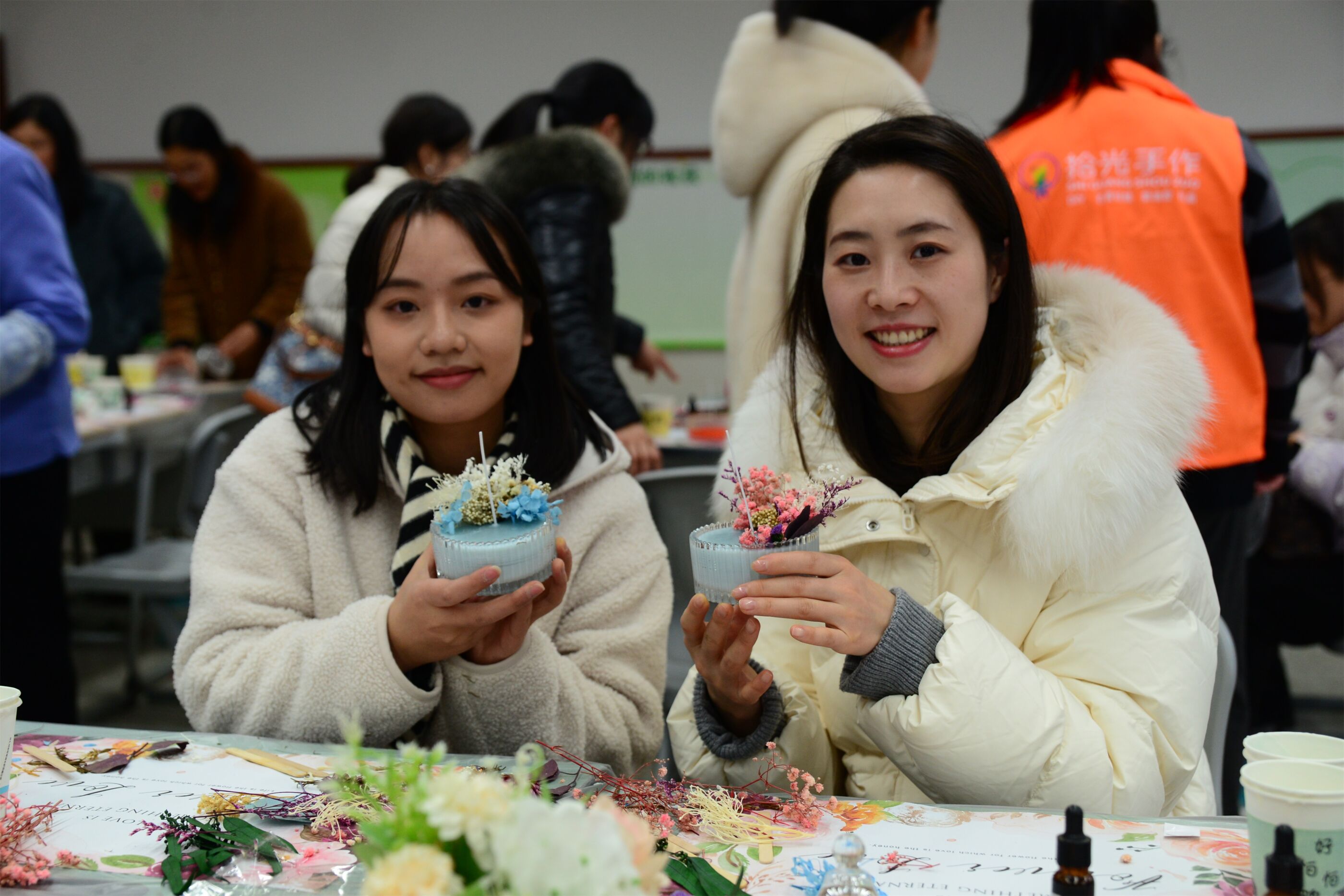 景賢樓317的香薰蠟燭制作區(qū),老師們將精油與蠟液緩緩注入模具,凝固成獨(dú)一無(wú)二的芬芳記憶。