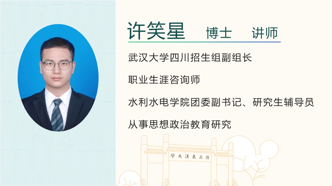 許笑星博士在生涯規(guī)劃指導(dǎo)中,深入解析新高考政策下選科方式、志愿填報模式的變化,通過大數(shù)據(jù)對比與典型案例剖析,為學(xué)子們提供了實用的選科和志愿填報建議,幫助學(xué)生更好地規(guī)劃未來。講解過程中,他也向同學(xué)們介紹了武漢大學(xué)作為綜合性大學(xué)的優(yōu)勢及在人才培養(yǎng)方面的卓越表現(xiàn),歡迎大家報考武漢大學(xué)。