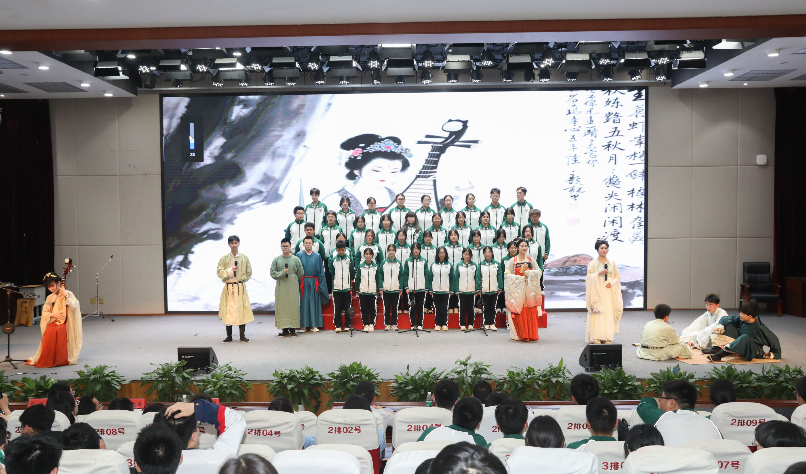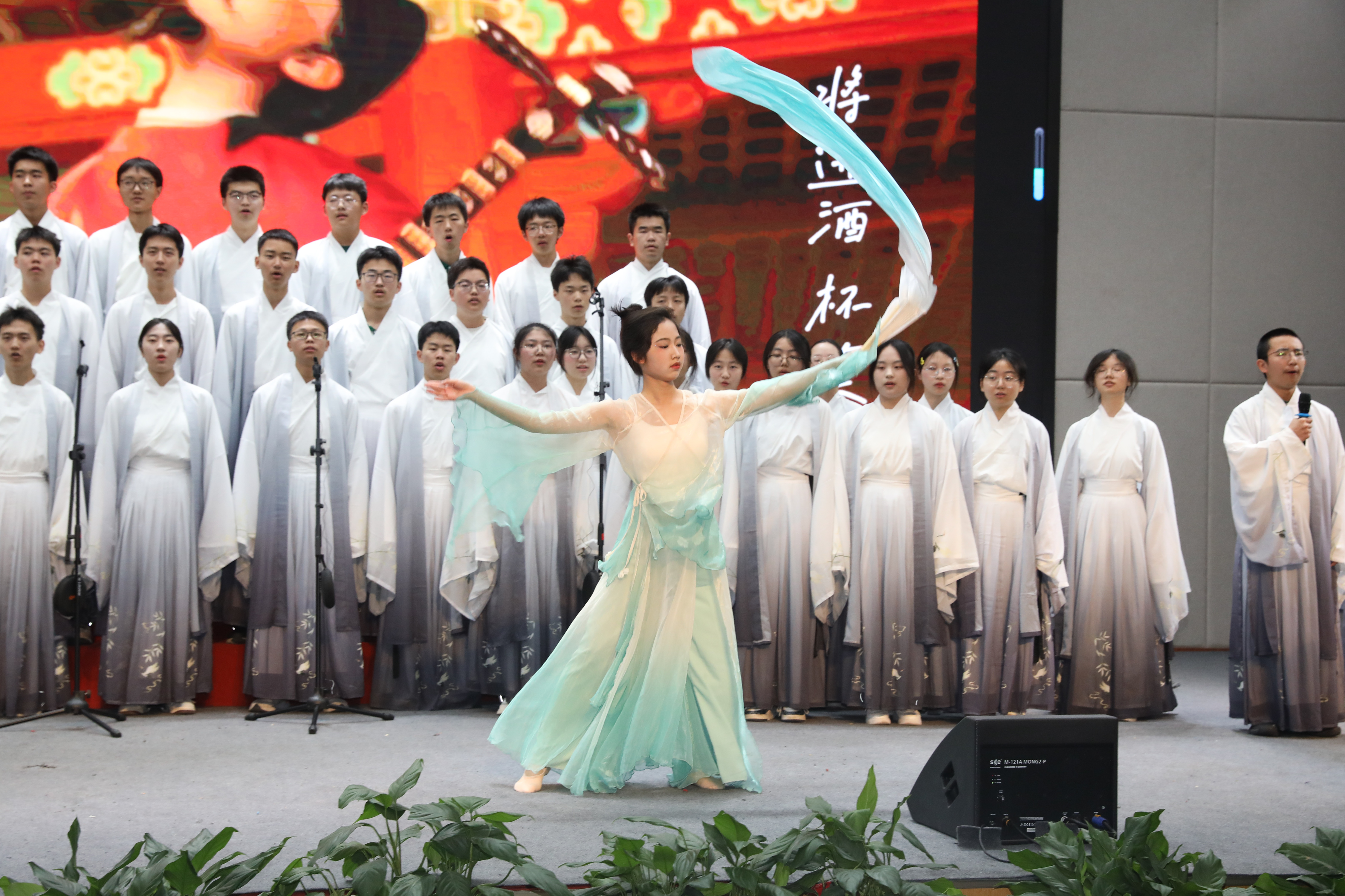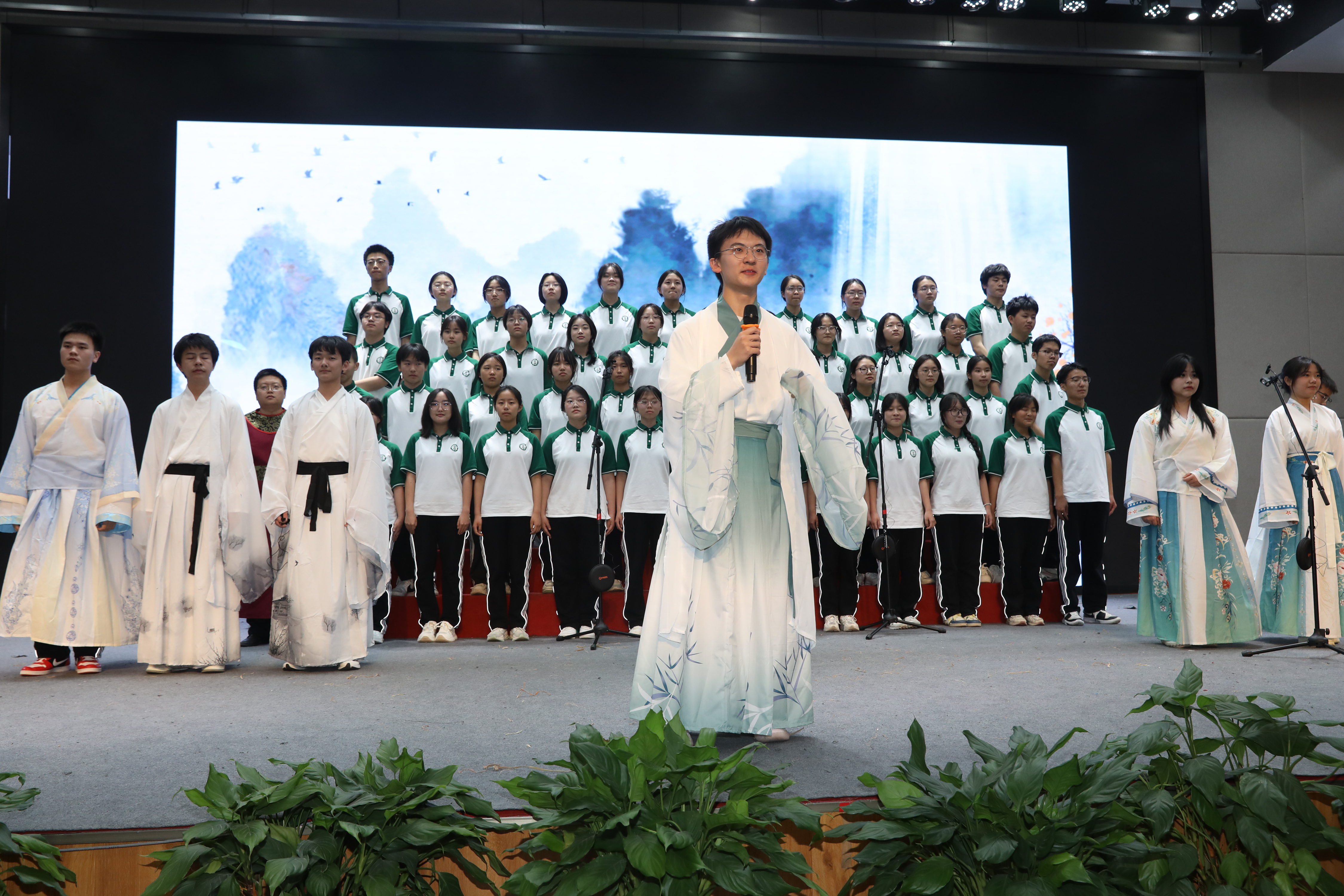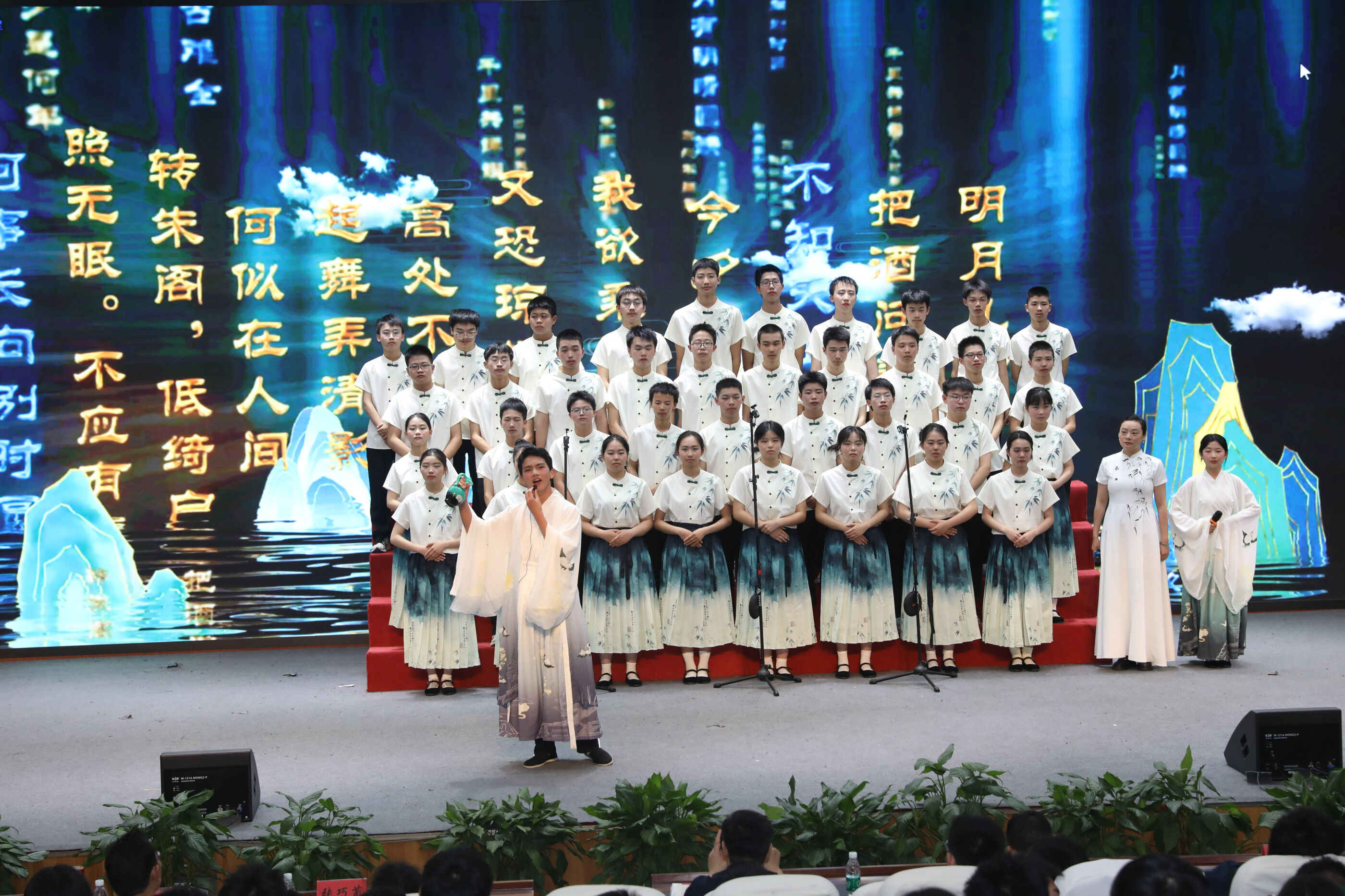 青衿學(xué)子聚華堂,瑯瑯聲里溯流光。少年們以聲為舟,以情為楫,溯流而上,展開一場跨越千年的文化對話。金樽對月,《將進(jìn)酒》的豪情在少年鏗鏘的誦讀中激蕩云天;鞠躬盡瘁,《出師表》的赤誠隨抑揚(yáng)頓挫的字句叩擊心扉。苔痕草色,《陋室銘》的一室清輝映照千古德馨;琵琶弦動,《琵琶行》的江州月色隨婉轉(zhuǎn)聲韻浸濕青衫……少年們或峨冠博帶,或素衣翩翩,以鏗鏘之聲、婉轉(zhuǎn)之韻,將千年文脈娓娓道來,精彩展現(xiàn)了中華古詩詞之美,用創(chuàng)新詮釋了傳統(tǒng)文化的永恒魅力。臺下師生凝神靜聽,時而為慷慨陳詞熱血沸騰,時而因纏綿詞句沉醉動容。這一刻,經(jīng)典不再是泛黃的書頁,而是流淌在少年血脈中的文化基因。