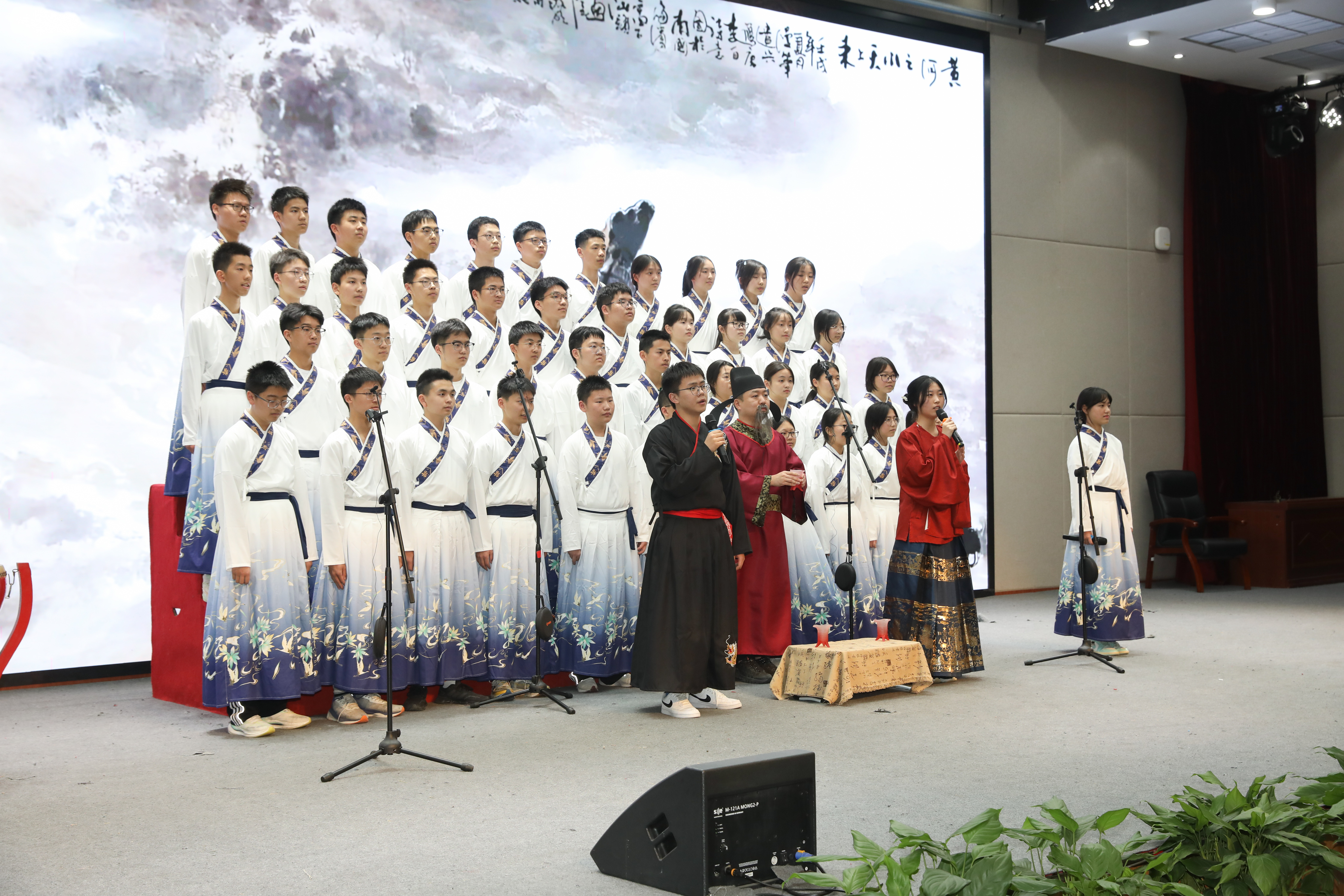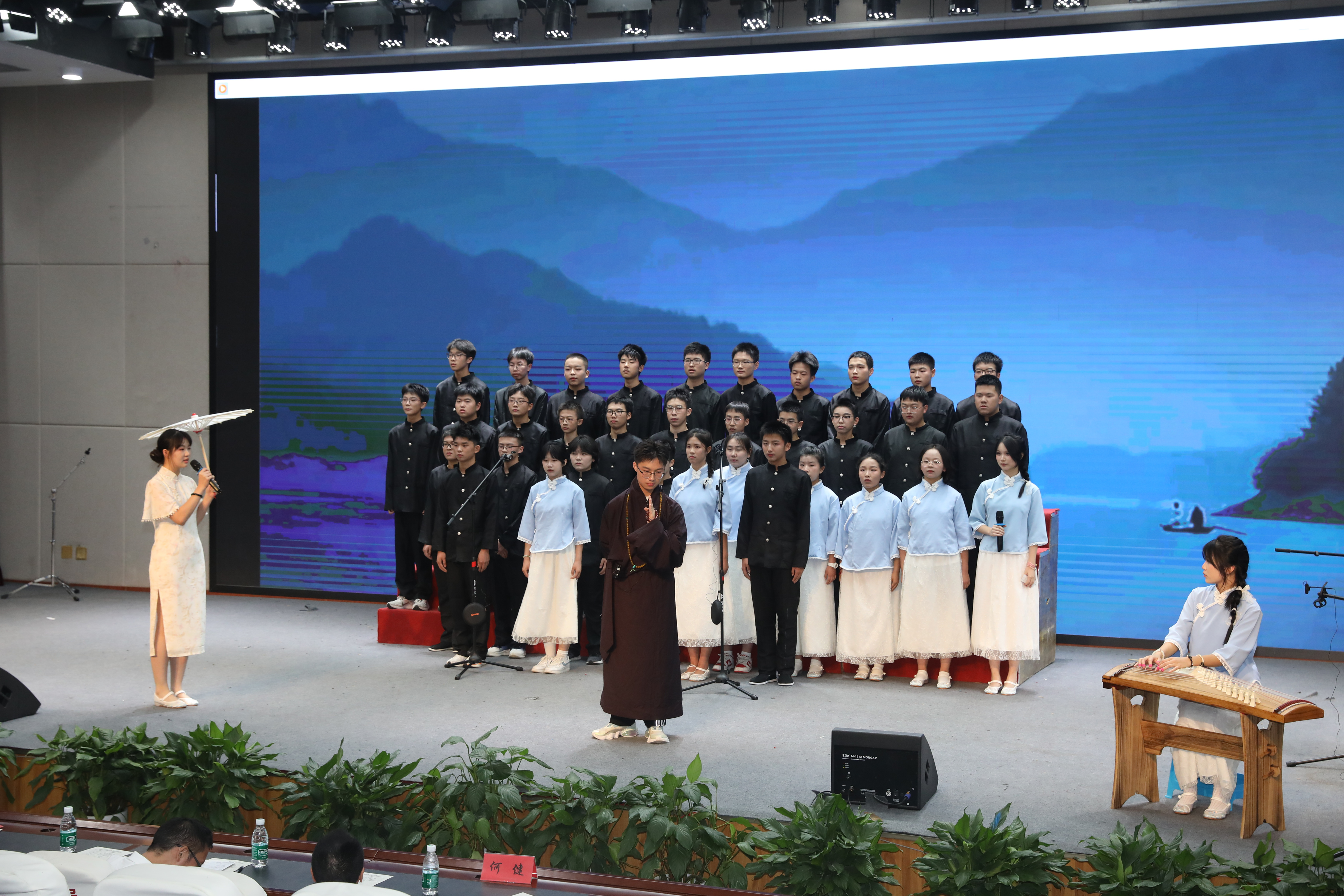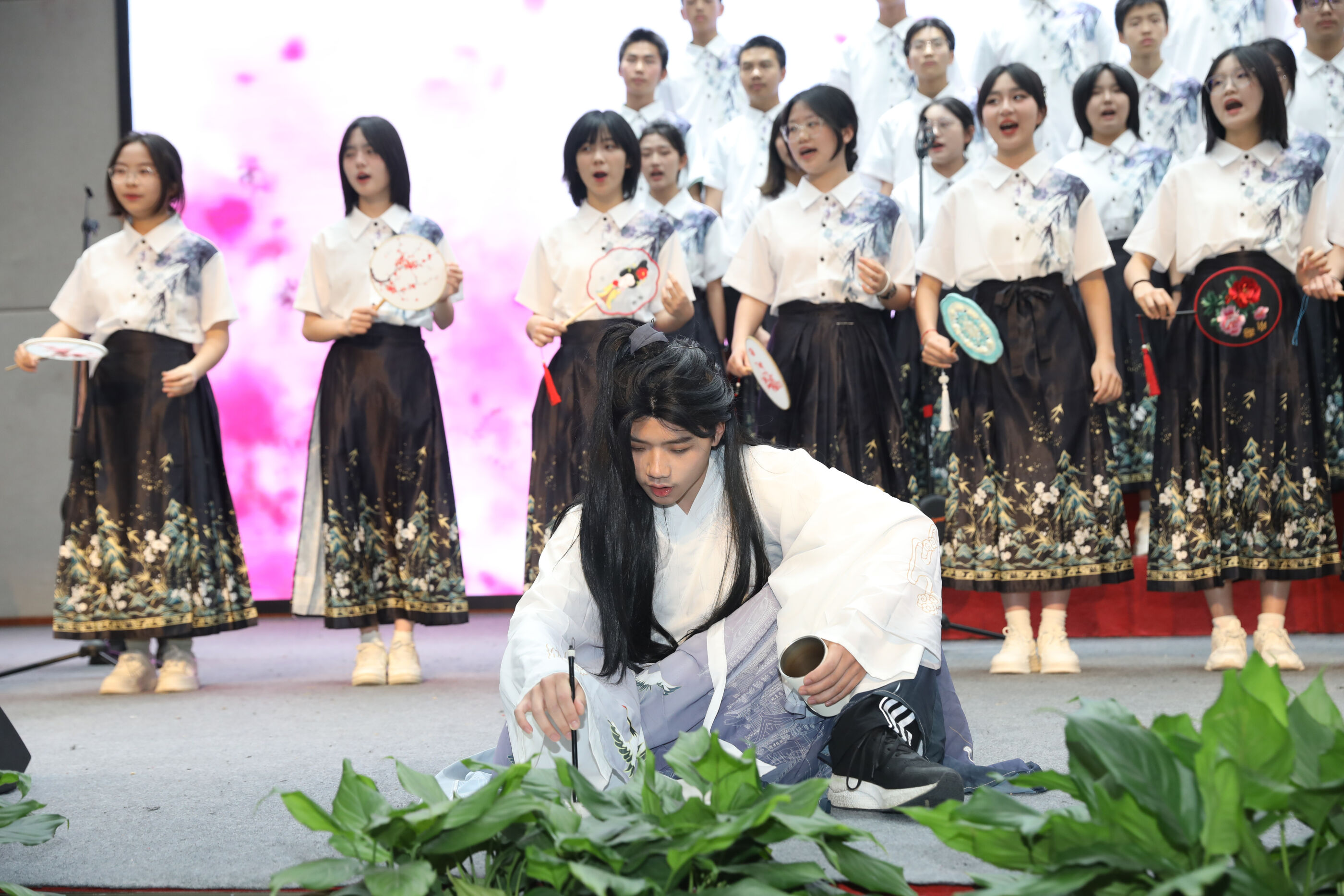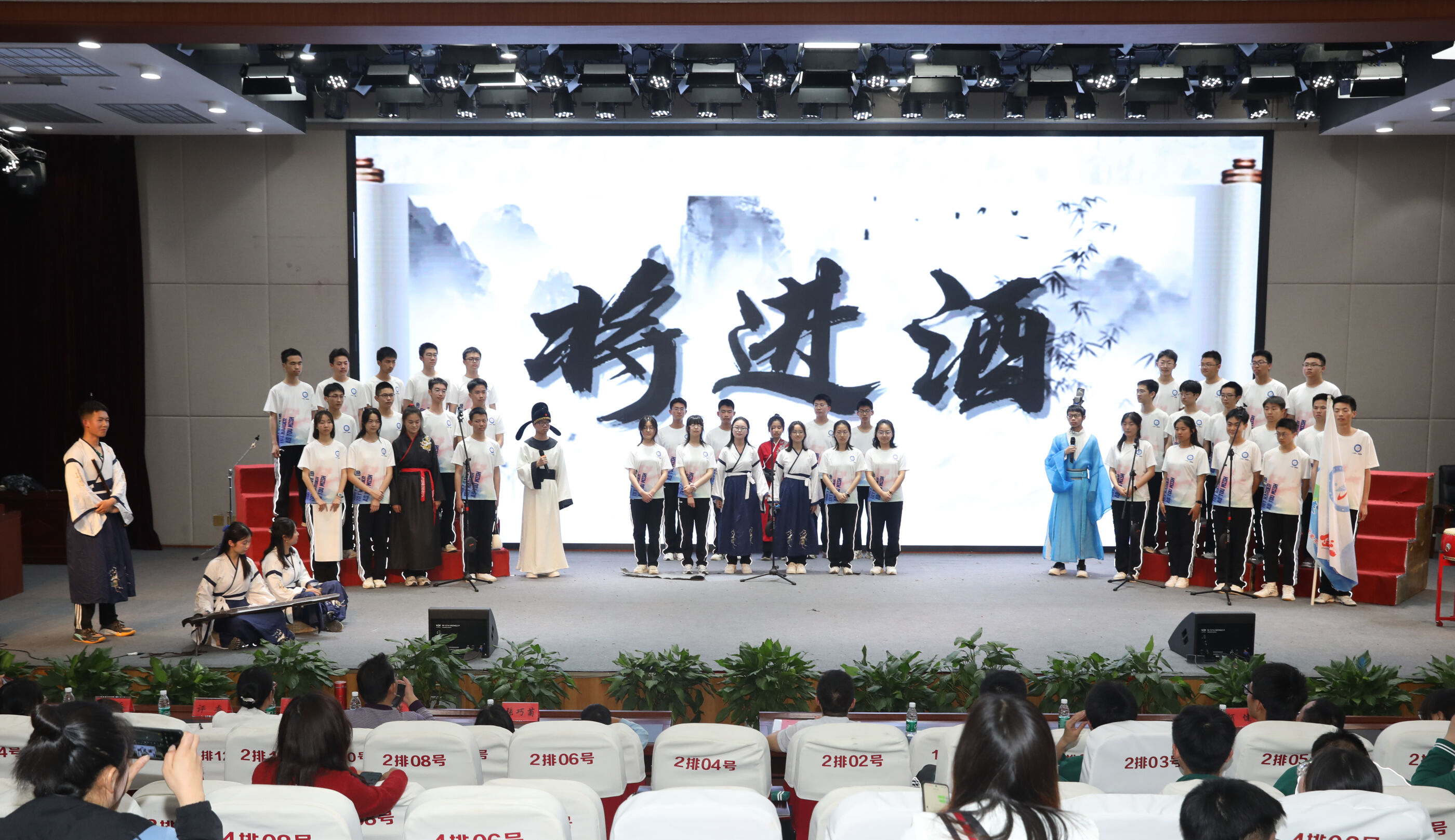 青衿學(xué)子聚華堂,瑯瑯聲里溯流光。少年們以聲為舟,以情為楫,溯流而上,展開一場跨越千年的文化對話。金樽對月,《將進(jìn)酒》的豪情在少年鏗鏘的誦讀中激蕩云天;鞠躬盡瘁,《出師表》的赤誠隨抑揚(yáng)頓挫的字句叩擊心扉。苔痕草色,《陋室銘》的一室清輝映照千古德馨;琵琶弦動,《琵琶行》的江州月色隨婉轉(zhuǎn)聲韻浸濕青衫……少年們或峨冠博帶,或素衣翩翩,以鏗鏘之聲、婉轉(zhuǎn)之韻,將千年文脈娓娓道來,精彩展現(xiàn)了中華古詩詞之美,用創(chuàng)新詮釋了傳統(tǒng)文化的永恒魅力。臺下師生凝神靜聽,時而為慷慨陳詞熱血沸騰,時而因纏綿詞句沉醉動容。這一刻,經(jīng)典不再是泛黃的書頁,而是流淌在少年血脈中的文化基因。