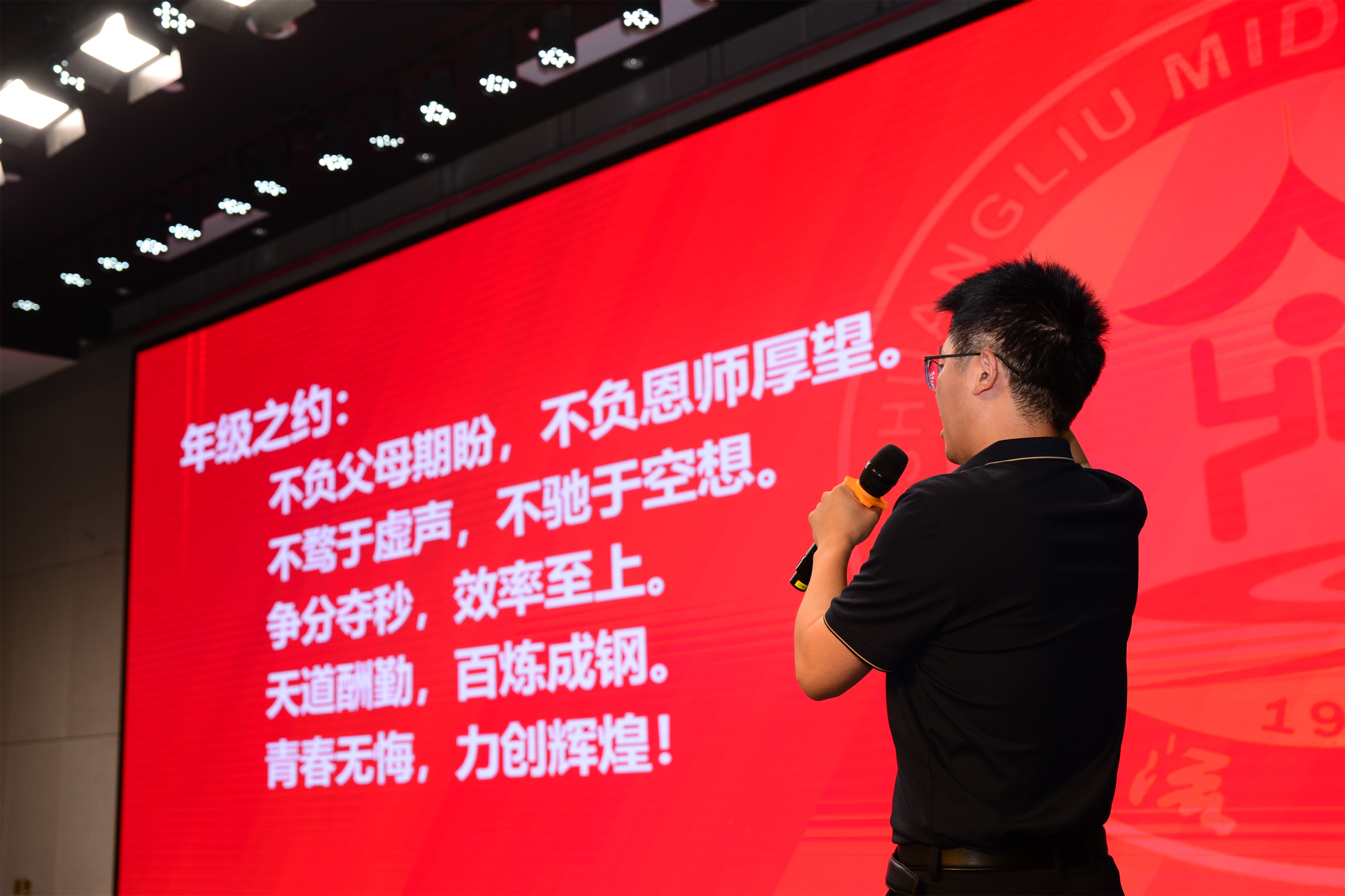 在年級組長劉西明老師的帶領下,全體學子重溫九年級公約:“不負父母期盼,不負恩師厚望!爭分奪秒,百煉成鋼!青春無悔,力創(chuàng)輝煌!”宣言如戰(zhàn)鼓擂動,響徹禮堂,將大會推向最高潮。這一刻,雙中精神凝聚成劍,直指中考蒼穹!