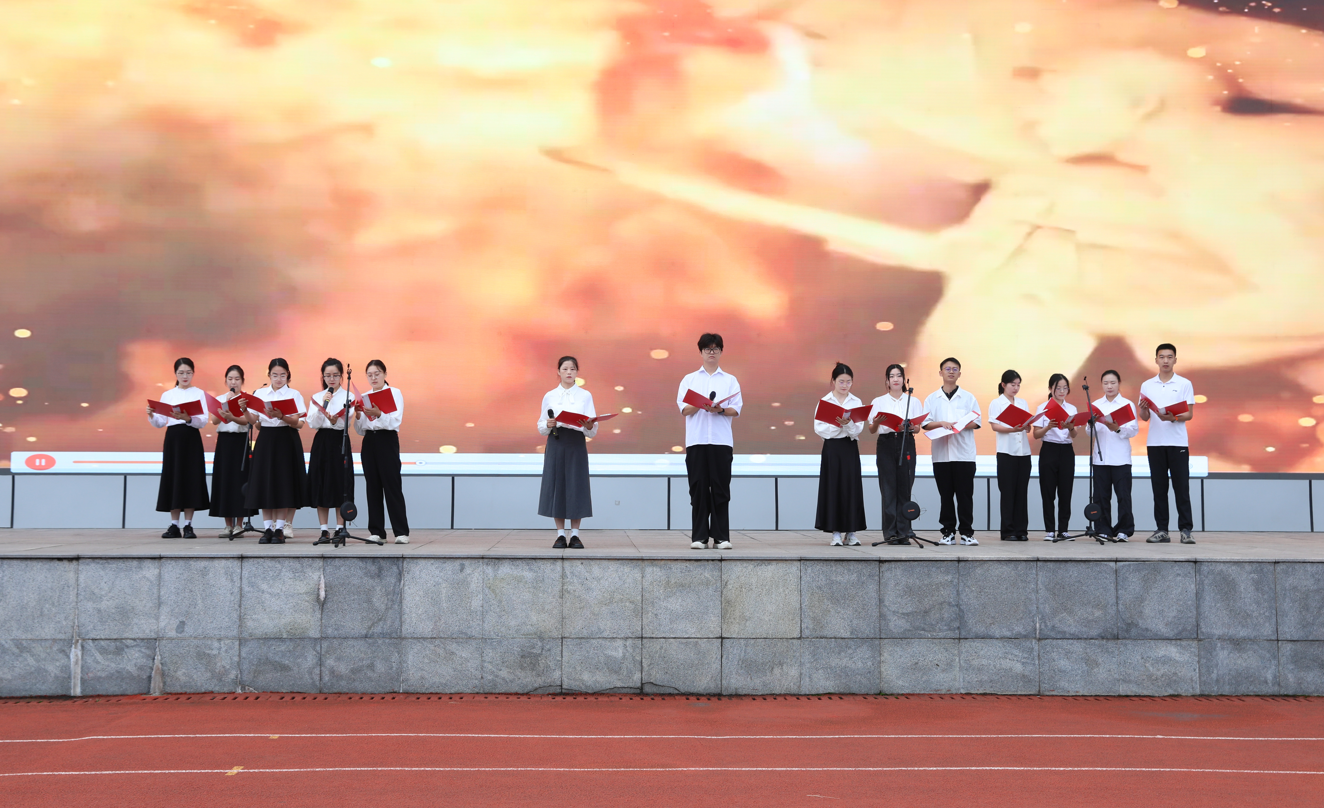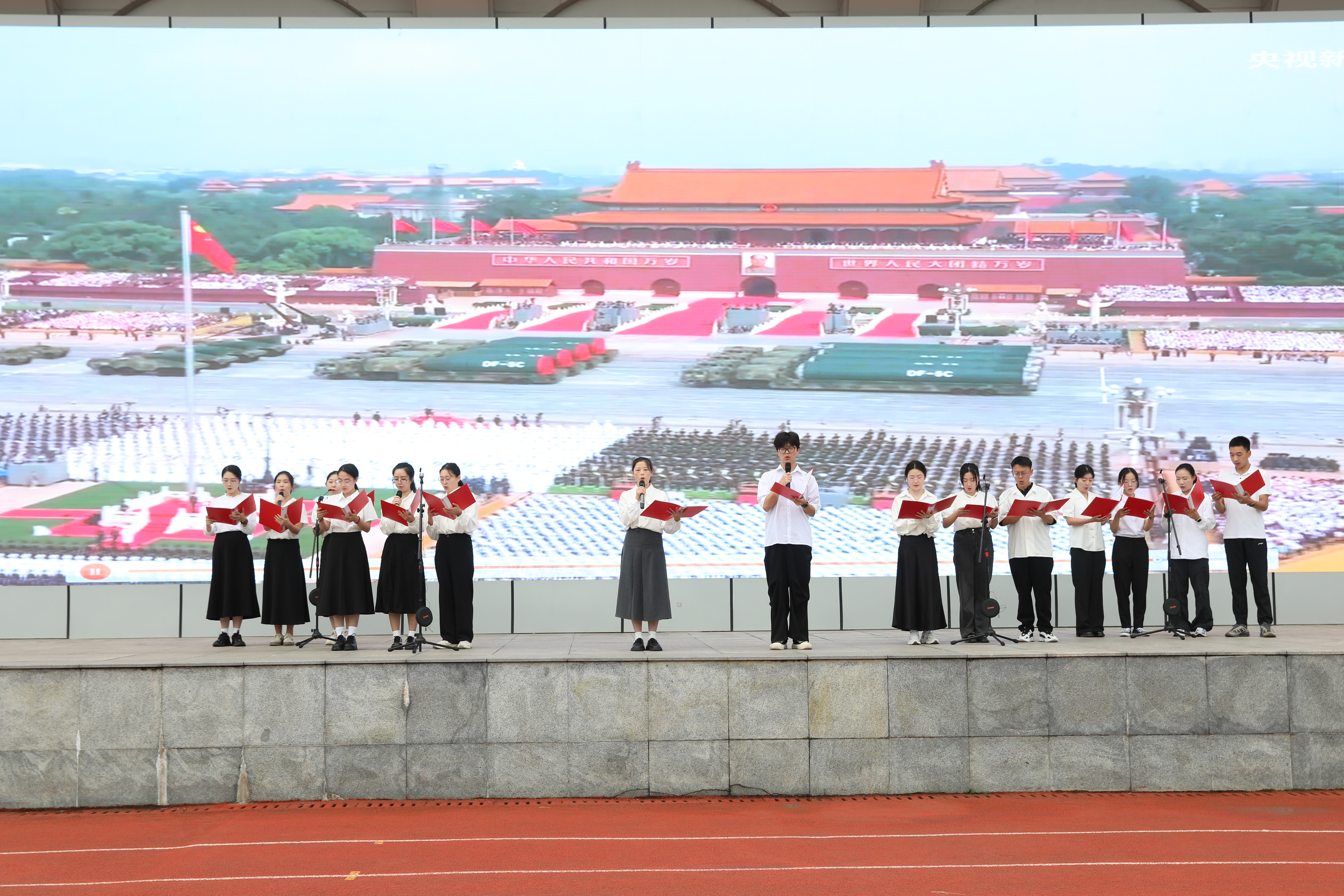 晨光中,四位主持人登上主席臺,他們回望抗戰(zhàn)勝利八十載的崢嶸歲月,銘記烽火中不屈的民族脊梁;展望新學(xué)期的嶄新征程,召喚每一位雙中學(xué)子接過精神的火炬,奔赴屬于自己的遠方。