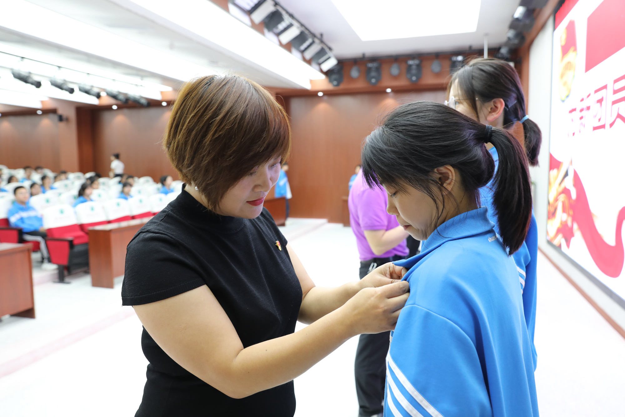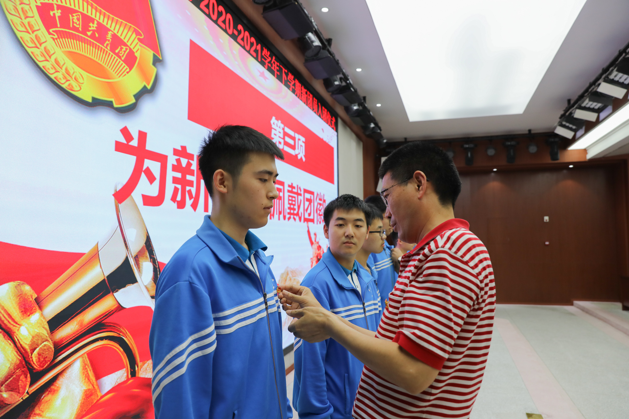 出席入團儀式的校領(lǐng)導(dǎo)為新團員代表佩戴團徽