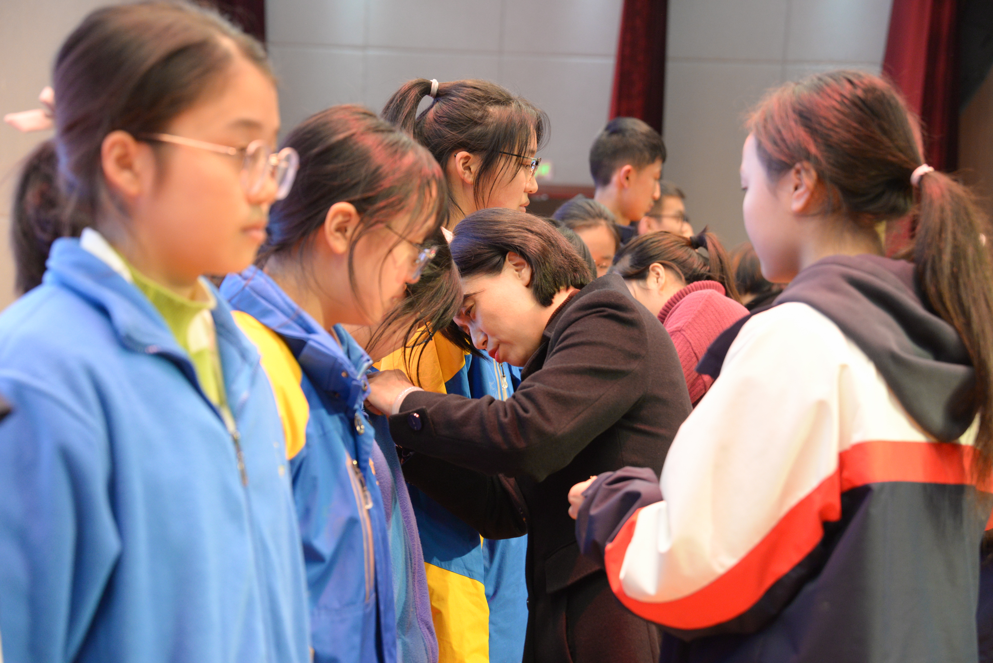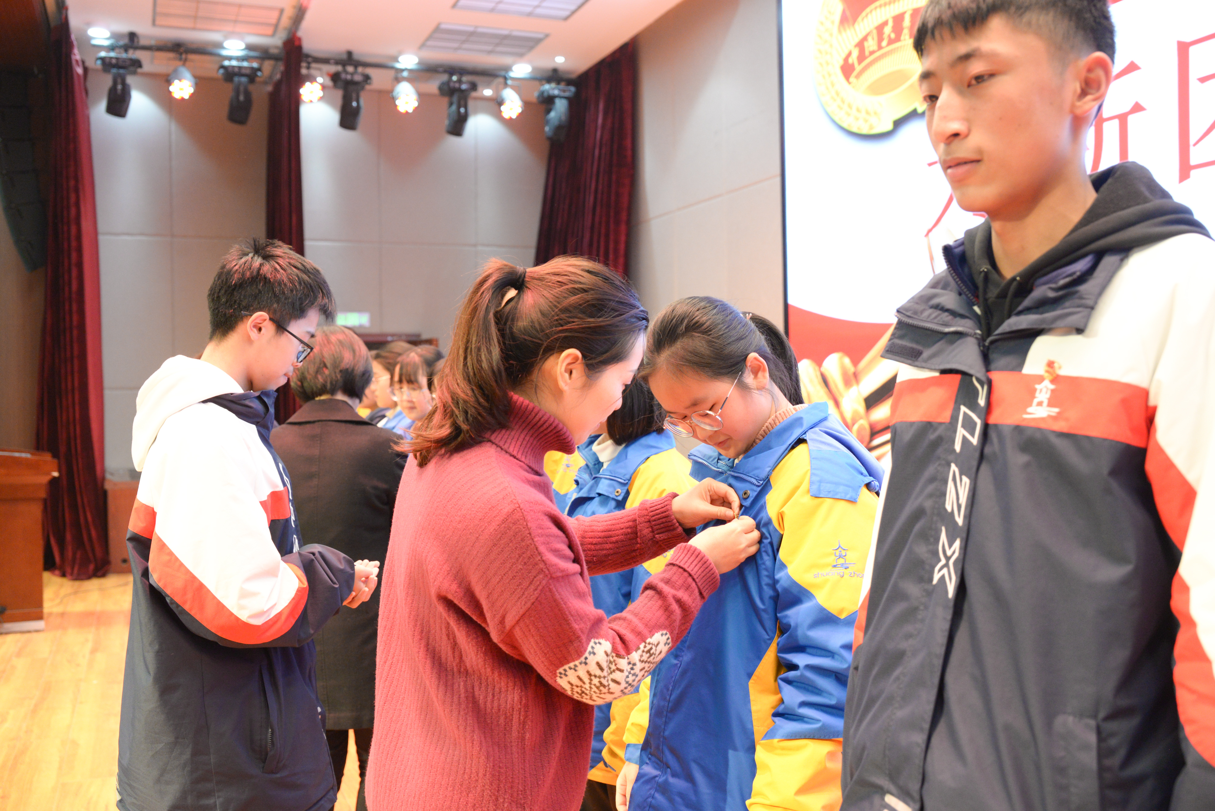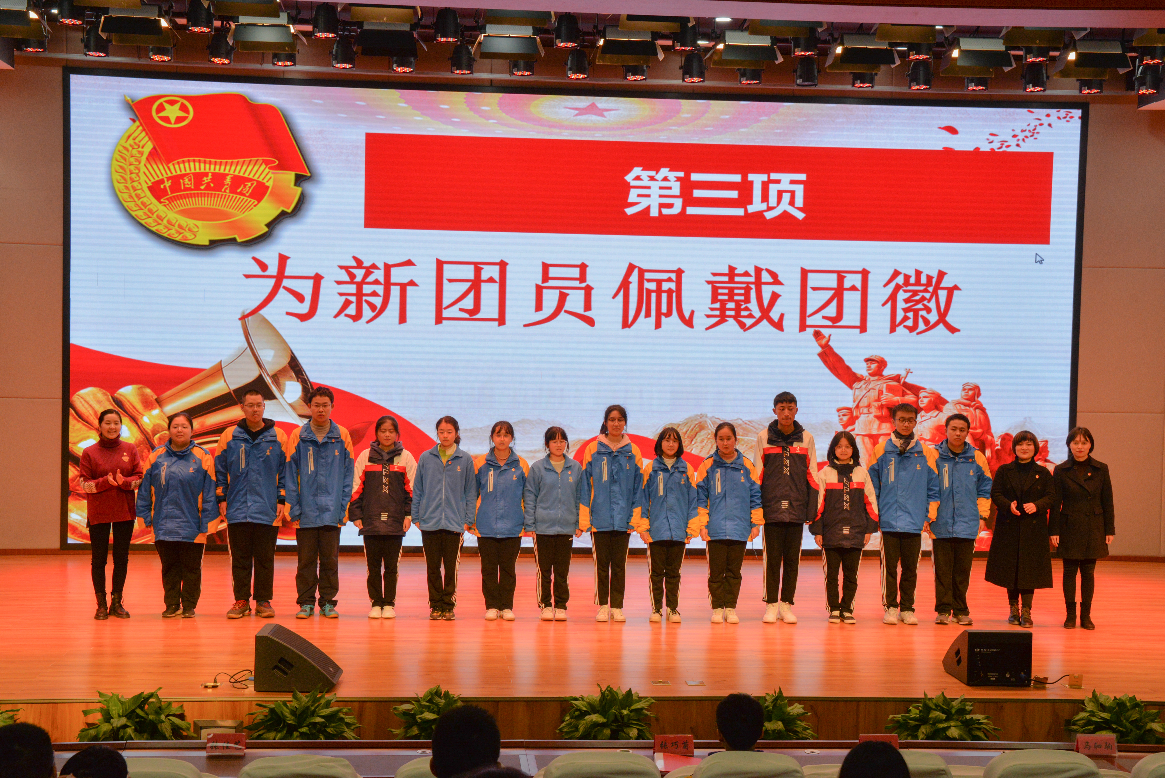 出席入團(tuán)儀式的校行政鄭重地為新團(tuán)員代表佩戴團(tuán)徽并合影。