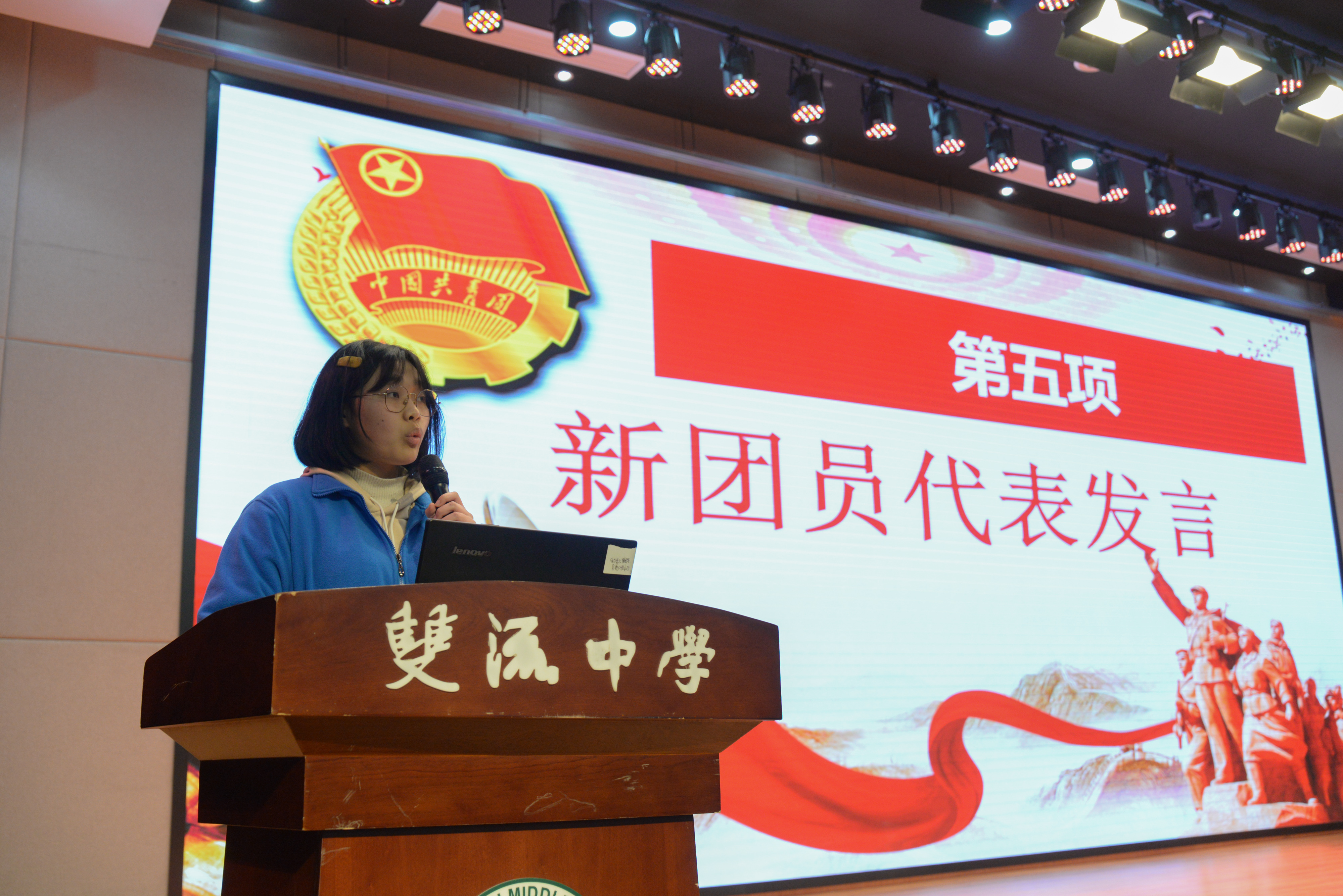 新團(tuán)員代表張晗同學(xué)發(fā)表感言,她認(rèn)為作為一名共青團(tuán)員應(yīng)肩負(fù)起為國為家的責(zé)任,努力學(xué)習(xí)科學(xué)文化知識(shí),努力提高自身道德修養(yǎng)。她號(hào)召大家要在生活學(xué)習(xí)中展現(xiàn)出共青團(tuán)員風(fēng)采,向雙中所有的老師和同學(xué)們,向共青團(tuán)這個(gè)先進(jìn)組織交一份滿意的答卷。