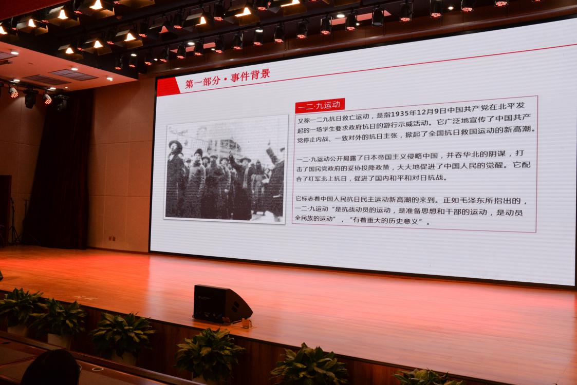 校團(tuán)委胡峻聞老師從一二·九抗日救亡運(yùn)動(dòng)的背景、經(jīng)過、結(jié)果幾個(gè)方面帶領(lǐng)全體參會(huì)人員回顧了這段掀起全國抗日救國新高潮的歷史,深入理解“一二·九”運(yùn)動(dòng)的重大歷史意義。胡峻聞號(hào)召團(tuán)員們要志存高遠(yuǎn),勇于擔(dān)當(dāng),堅(jiān)定不移的跟黨走,傳承紅色基因,承擔(dān)起屬于自己的責(zé)任與使命!