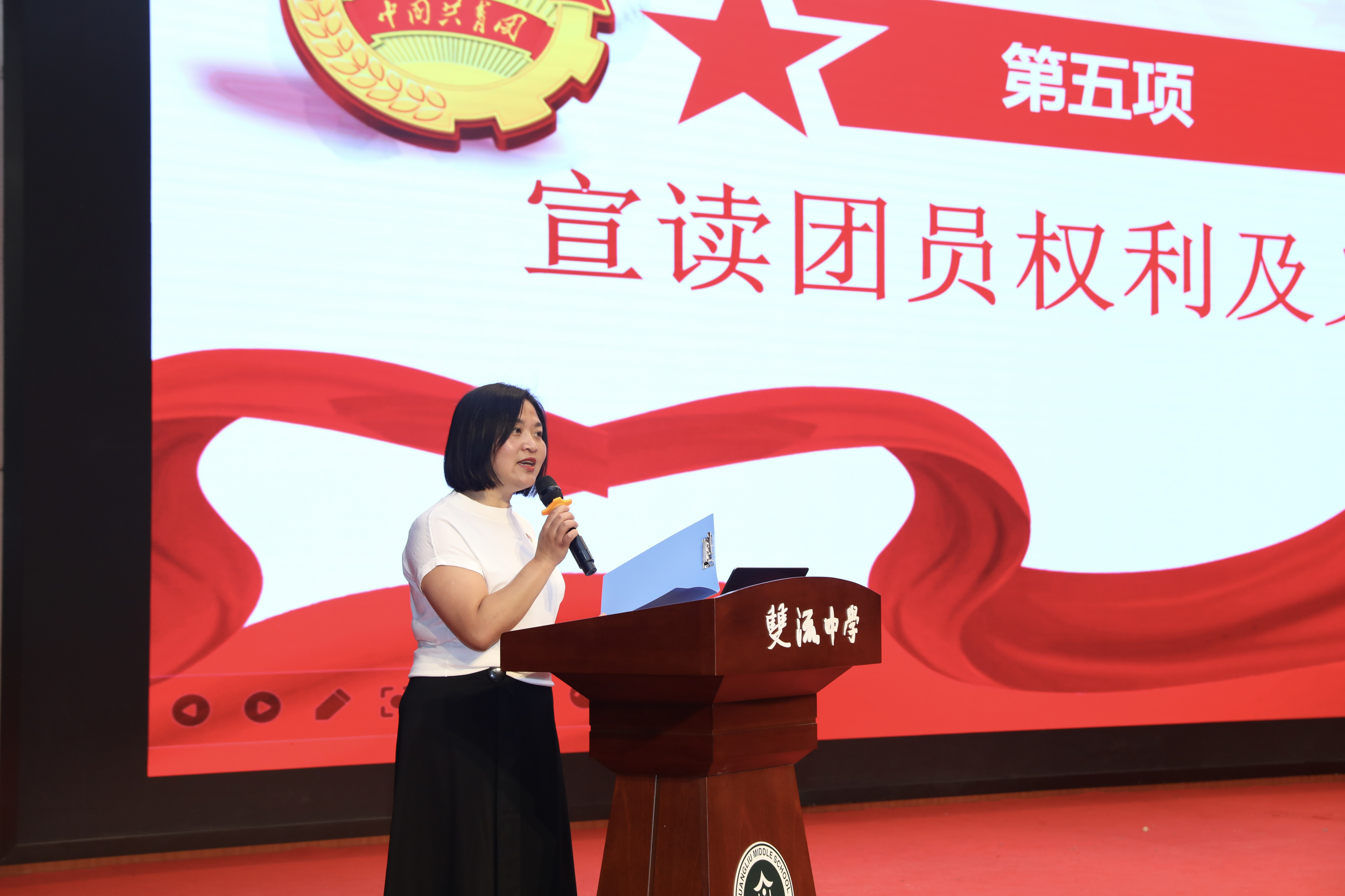 校黨委委員、總務(wù)處主任張巧菊宣讀《中國共產(chǎn)主義青年團(tuán)章程》中團(tuán)員權(quán)利與義務(wù)校黨委委員、總務(wù)處主任張巧菊宣讀《中國共產(chǎn)主義青年團(tuán)章程》中團(tuán)員權(quán)利與義務(wù)