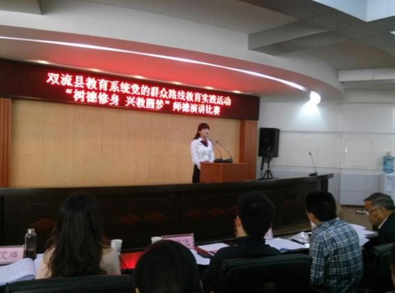 2014年4月24日雙流縣教育局舉辦了“樹德修身,興教圓夢”師德演講比賽。我校青年教師胡曉清參加了比賽并榮獲三等 獎。 胡曉清老師的演講題目是《懷抱愛心,誨人不倦》,胡老師主張以陶行知先生的“捧著一顆心來,不帶半根草”做教師的一面鏡子,用老師的愛與尊重去照亮孩子的心靈。正體現(xiàn)了第三支部黨的群眾路線教育實踐活動的初步成果。